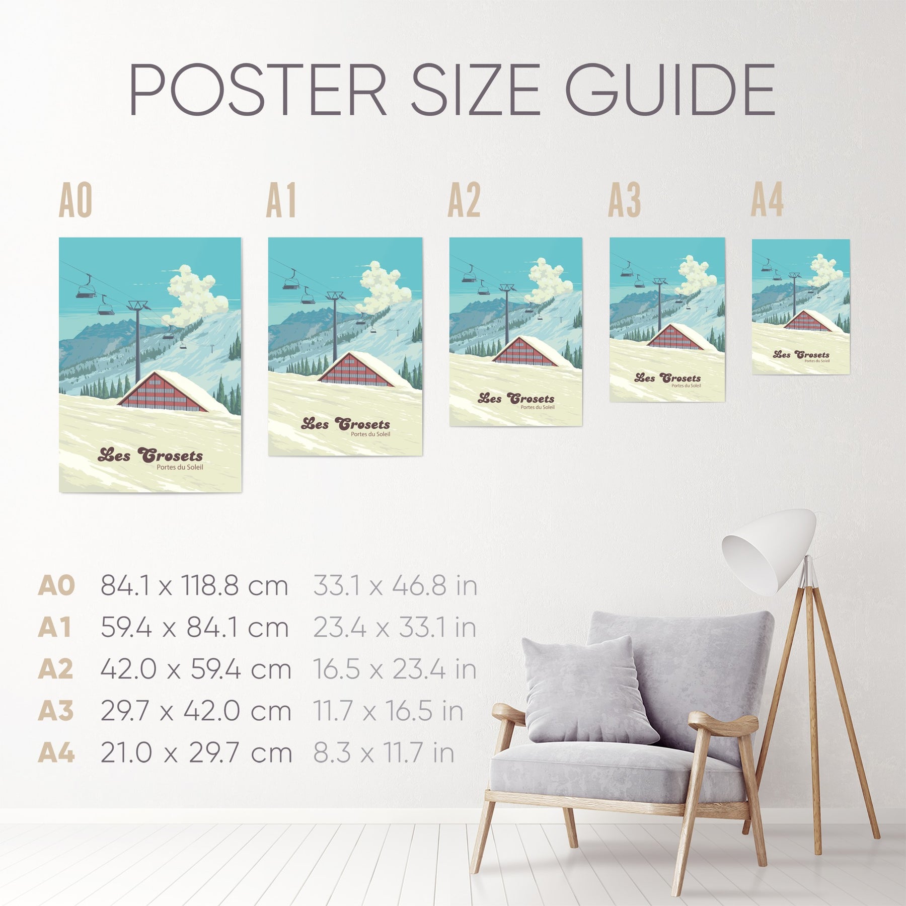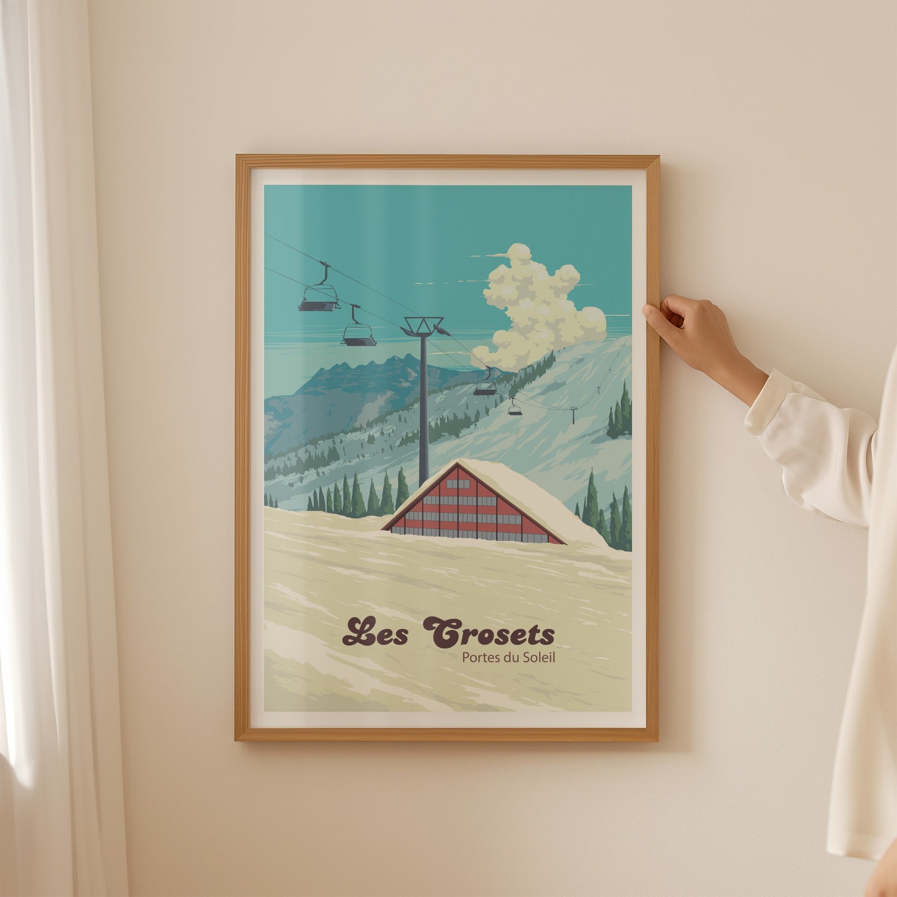 This Les Crosets travel poster showcases the stunning alpine scenery of the Swiss ski resort in the Portes du Soleil region. Perfect for skiers and mountain lovers, it captures the snowy slopes and panoramic views. A stylish decor piece celebrating the charm, adventure, and beauty of Les Crosets in winter.