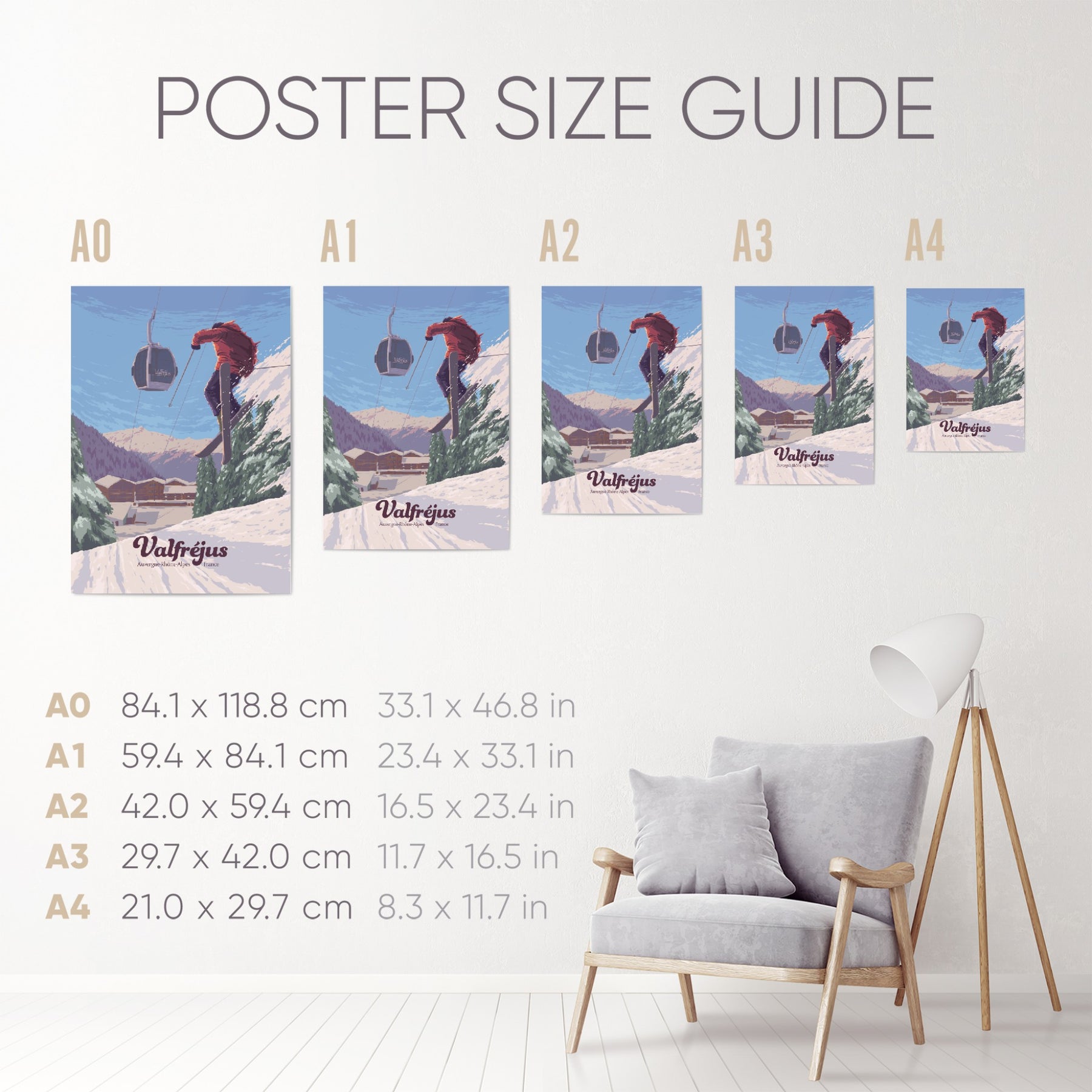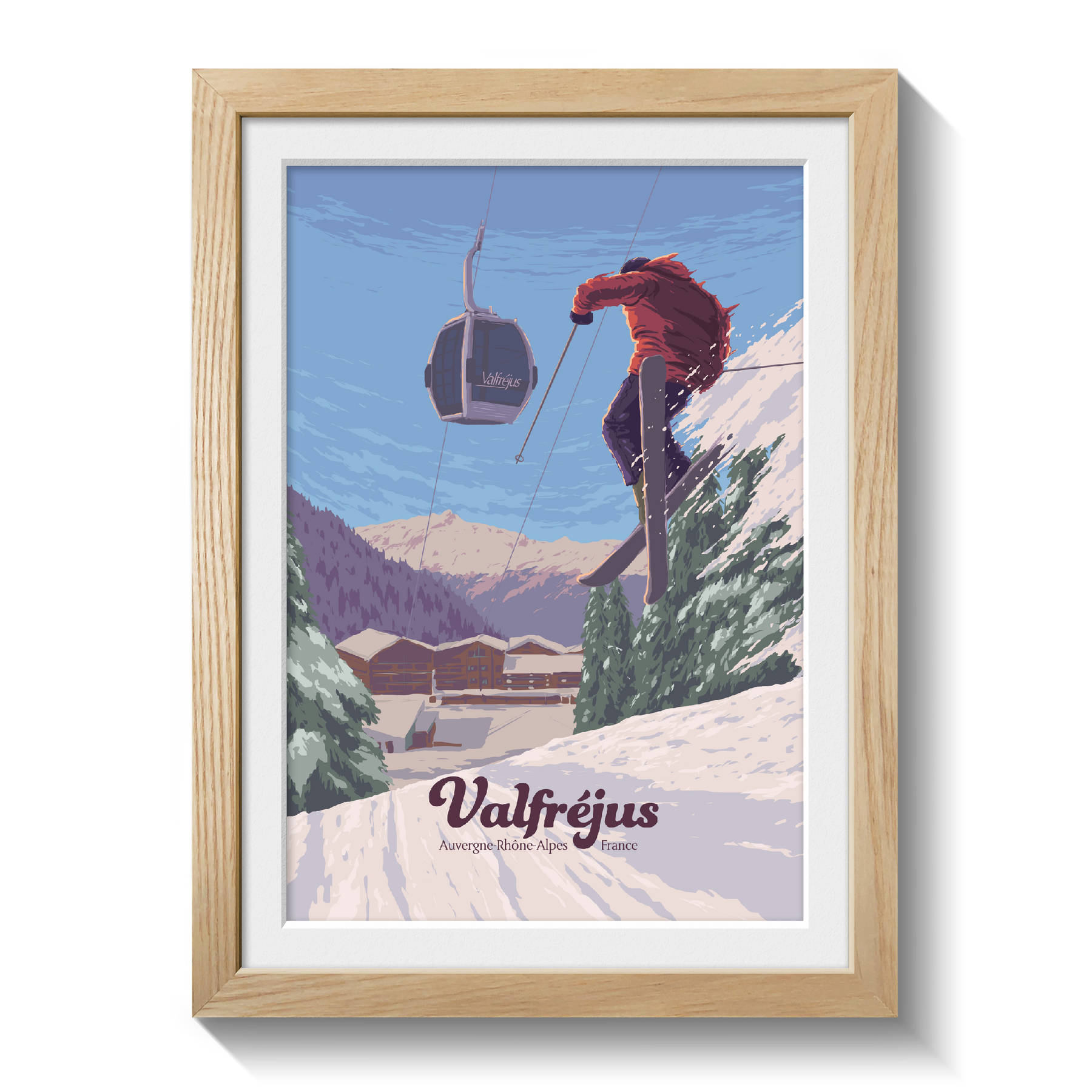 This is an original travel poster featuring the French ski resort of Valfréjus in the Savoie Mont Blanc area of France. It is part of the Maurienne ski area along with La Norma and Val Cenis.