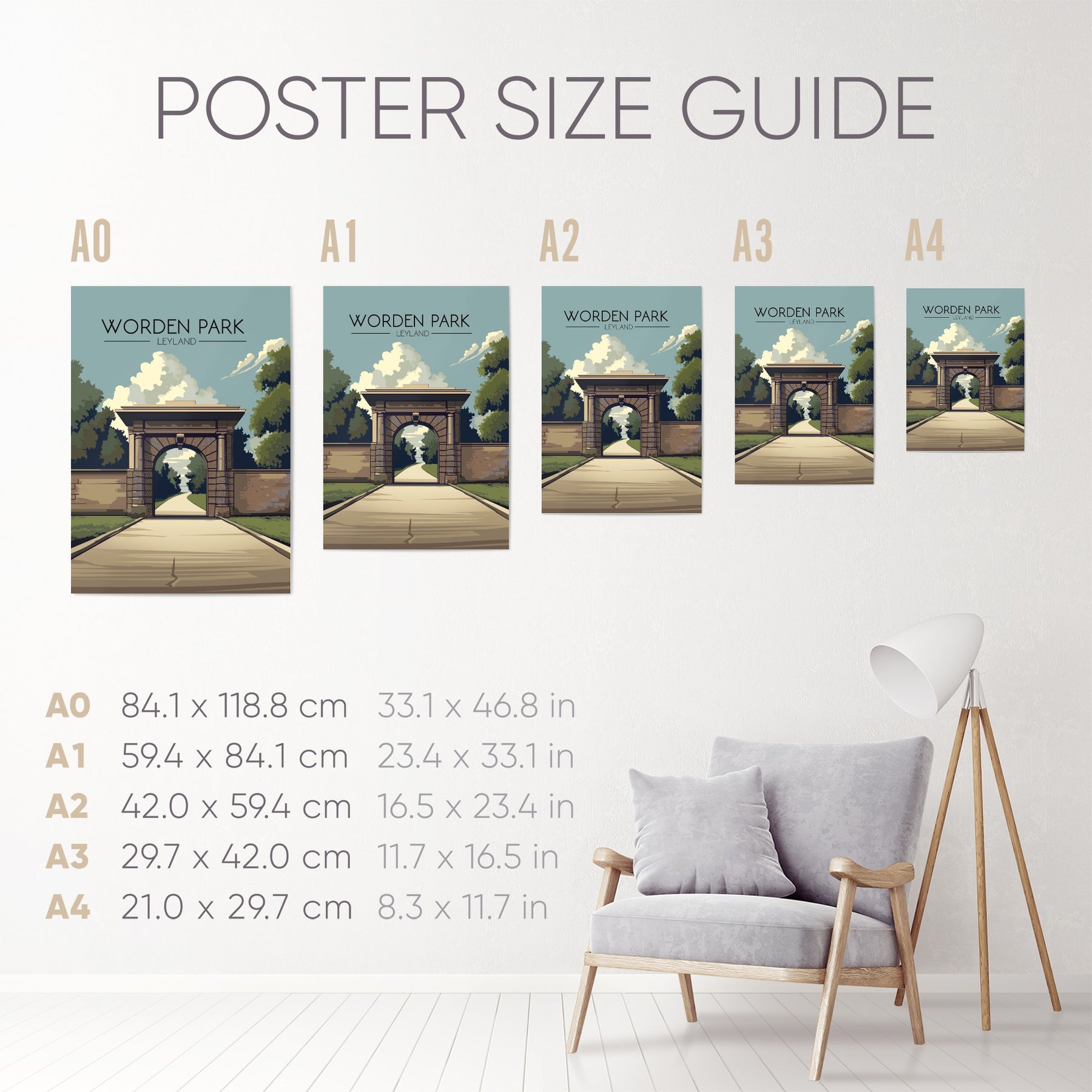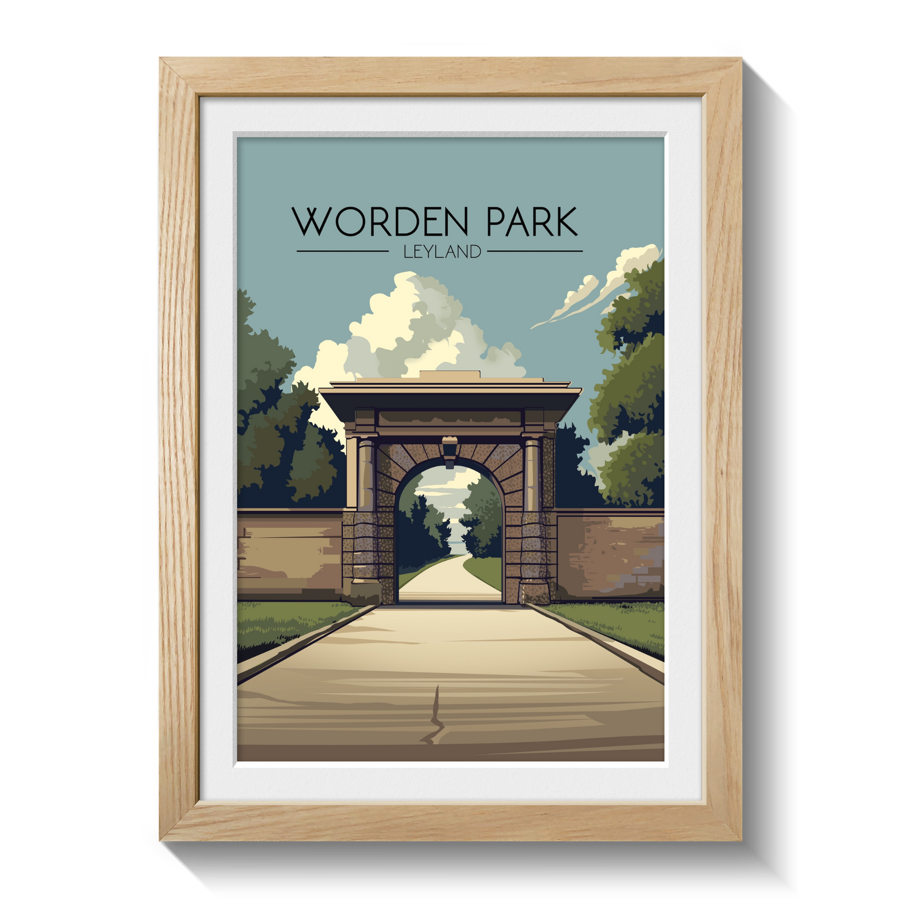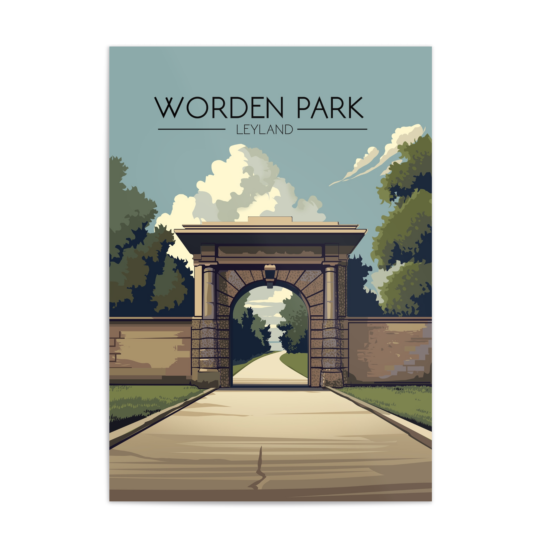 This Worden Park travel poster showcases the peaceful beauty of Leyland’s beloved green space, featuring its historic gardens, woodlands, and open lawns. Perfect for locals and nature lovers, it captures the charm and community spirit of the park. A stylish decor piece celebrating the relaxing atmosphere of Worden Park in Lancashire.