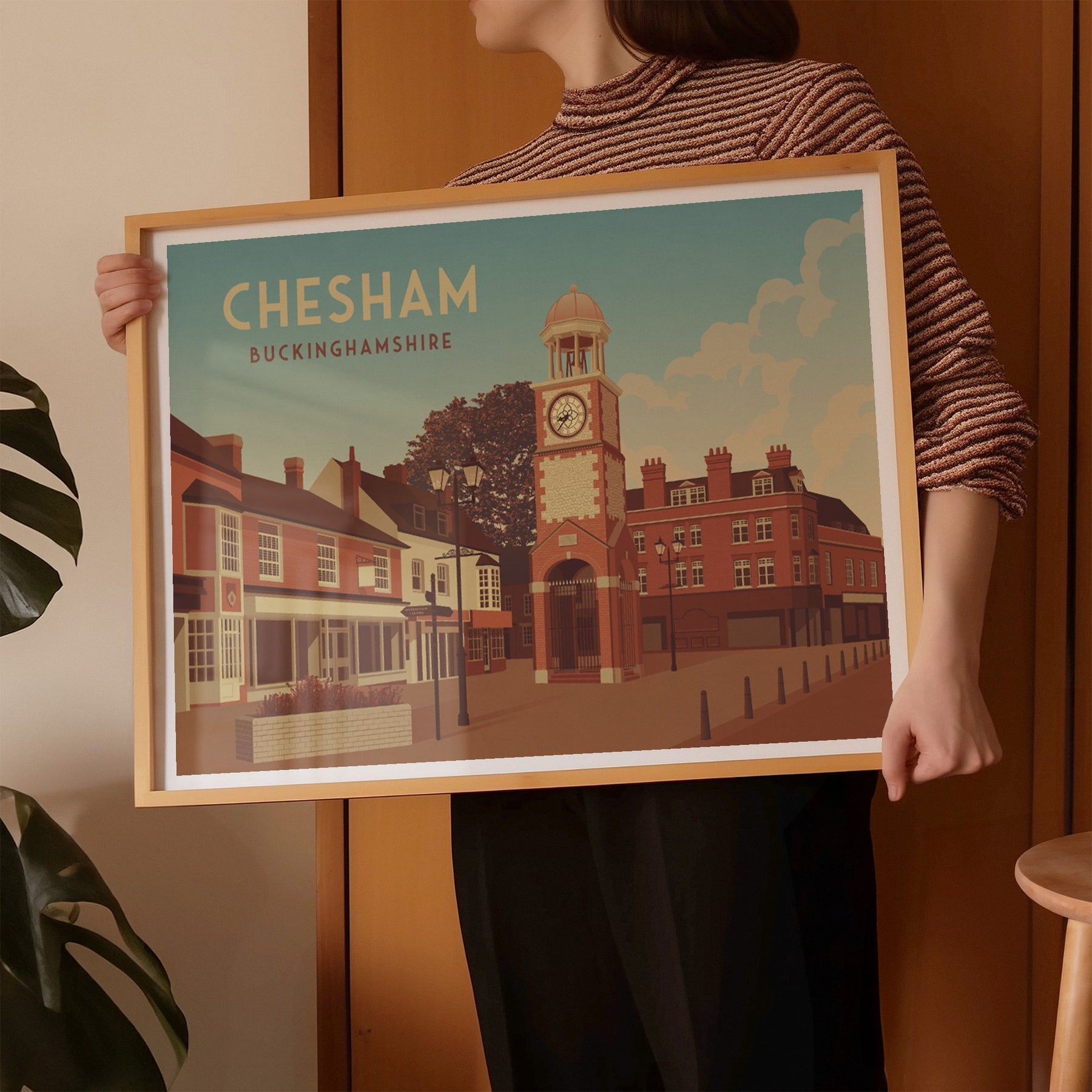 An original travel poster featuring Chesham High Street in Buckinghamshire, in the Chilterns Area of Natural Beauty.