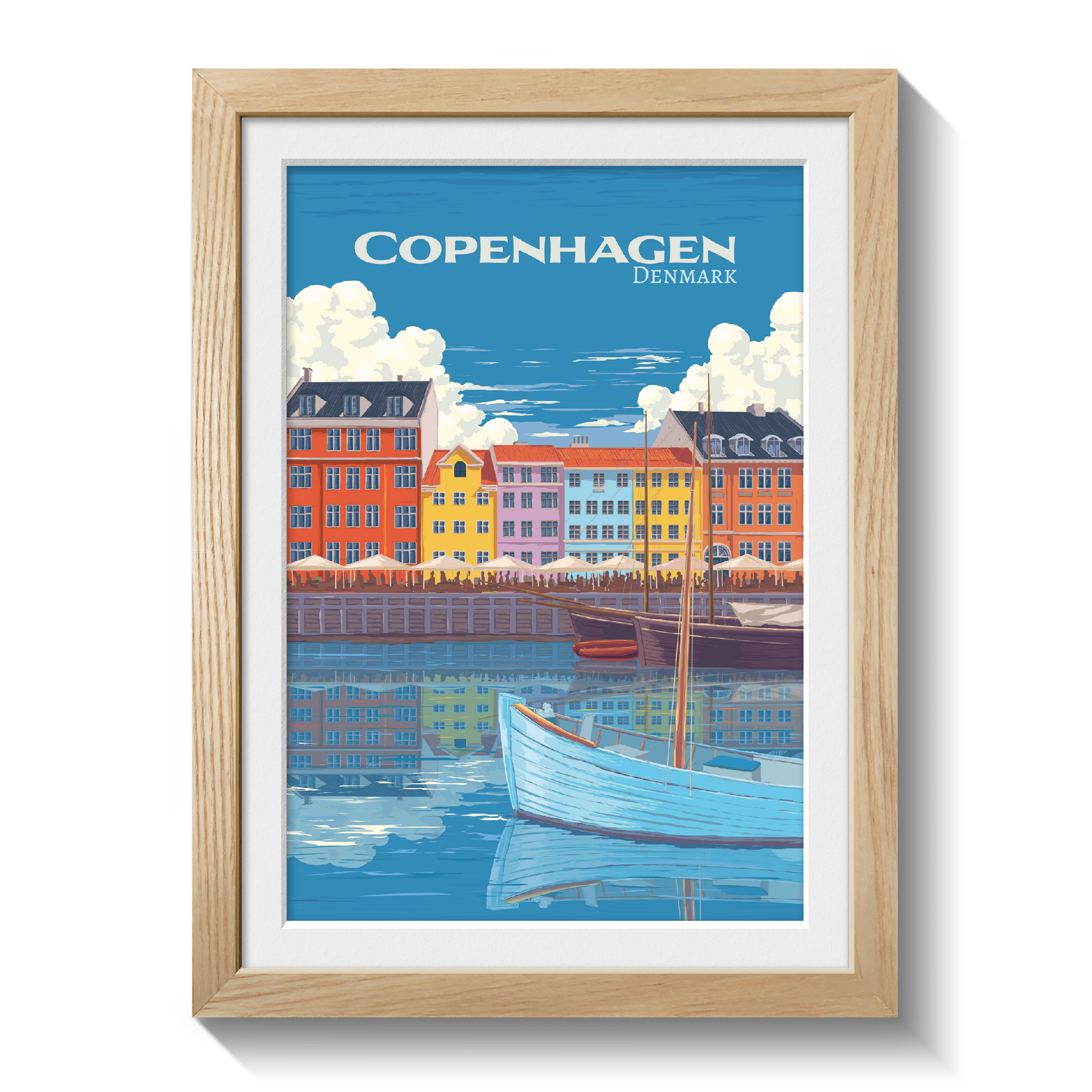 This travel poster features the beautiful Nyhavn Harbour area of Copenhagen in Denmark, famous for its colourful buildings and picturesque canals.
