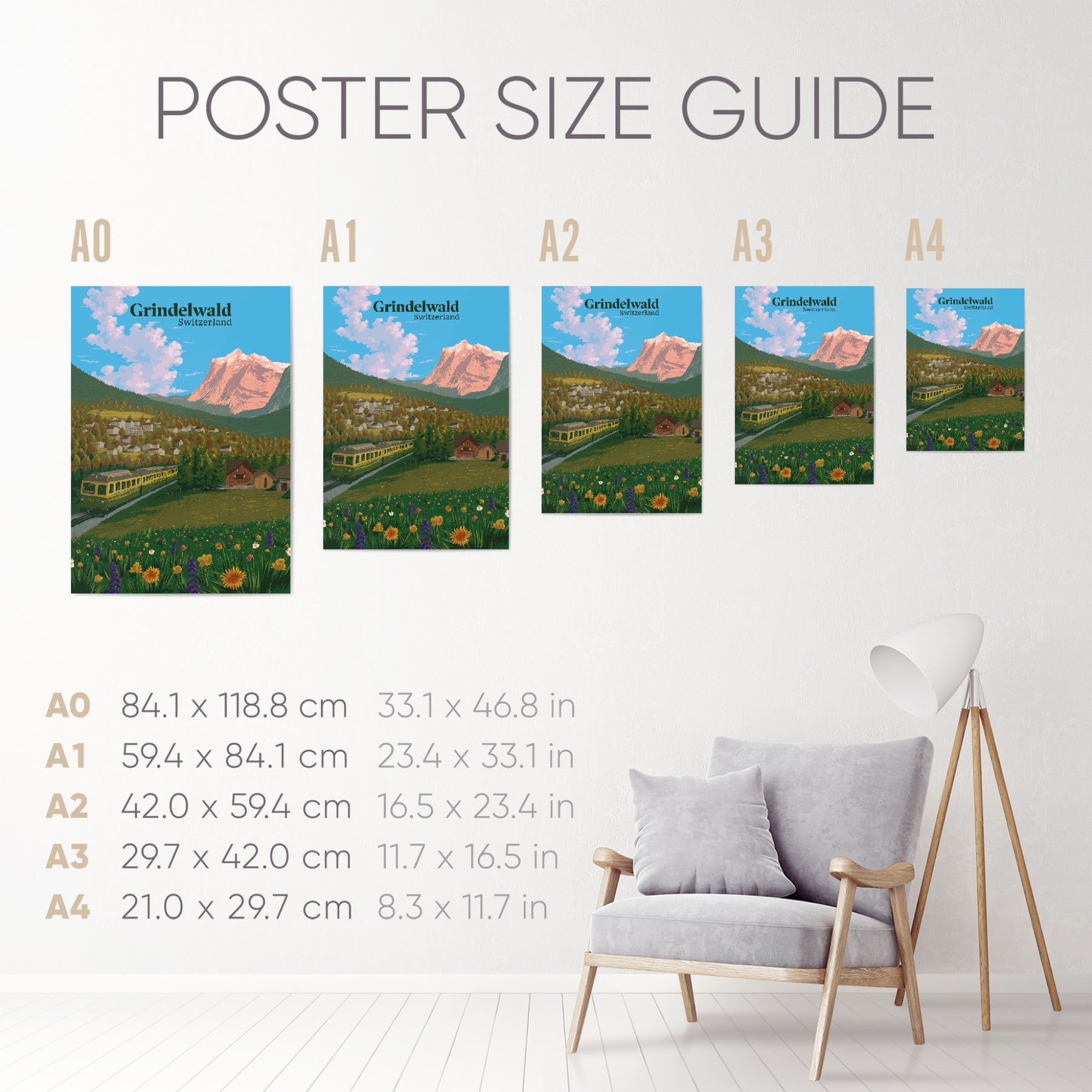This travel poster features the Swiss alpine village of Grindelwald, with the imposing Eiger mountain visible in the distance.