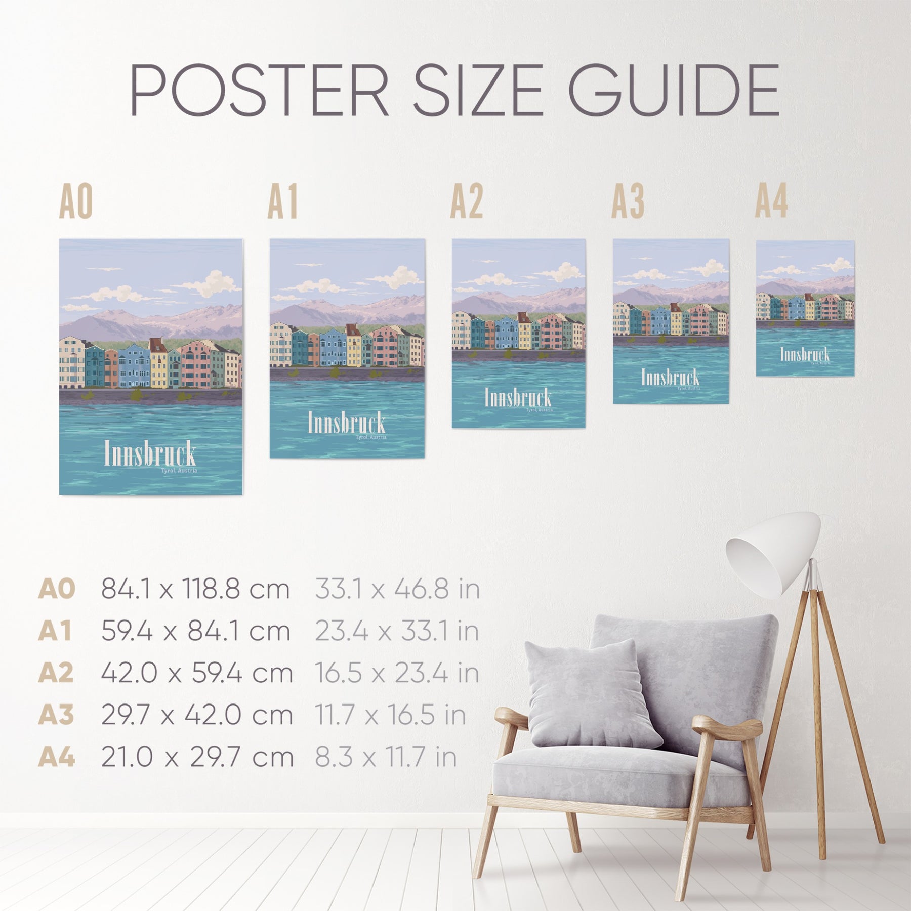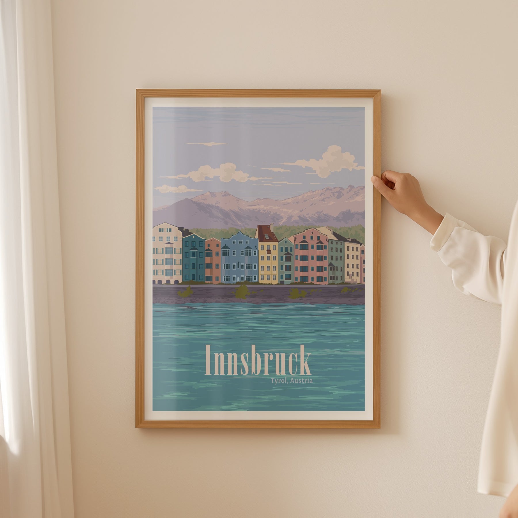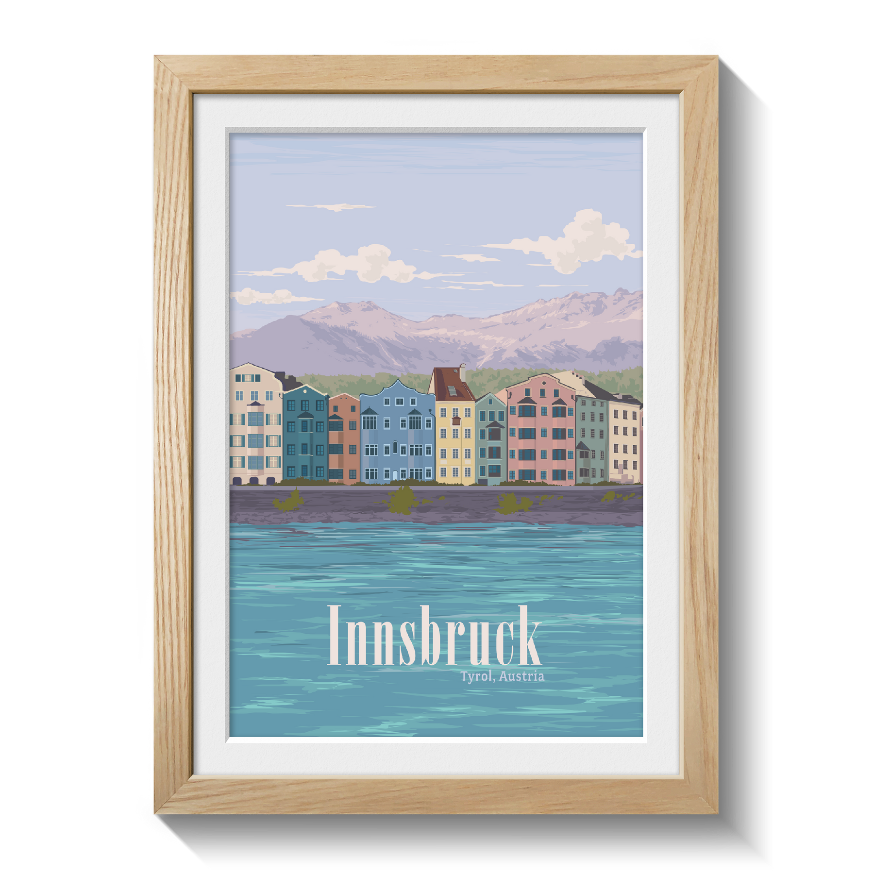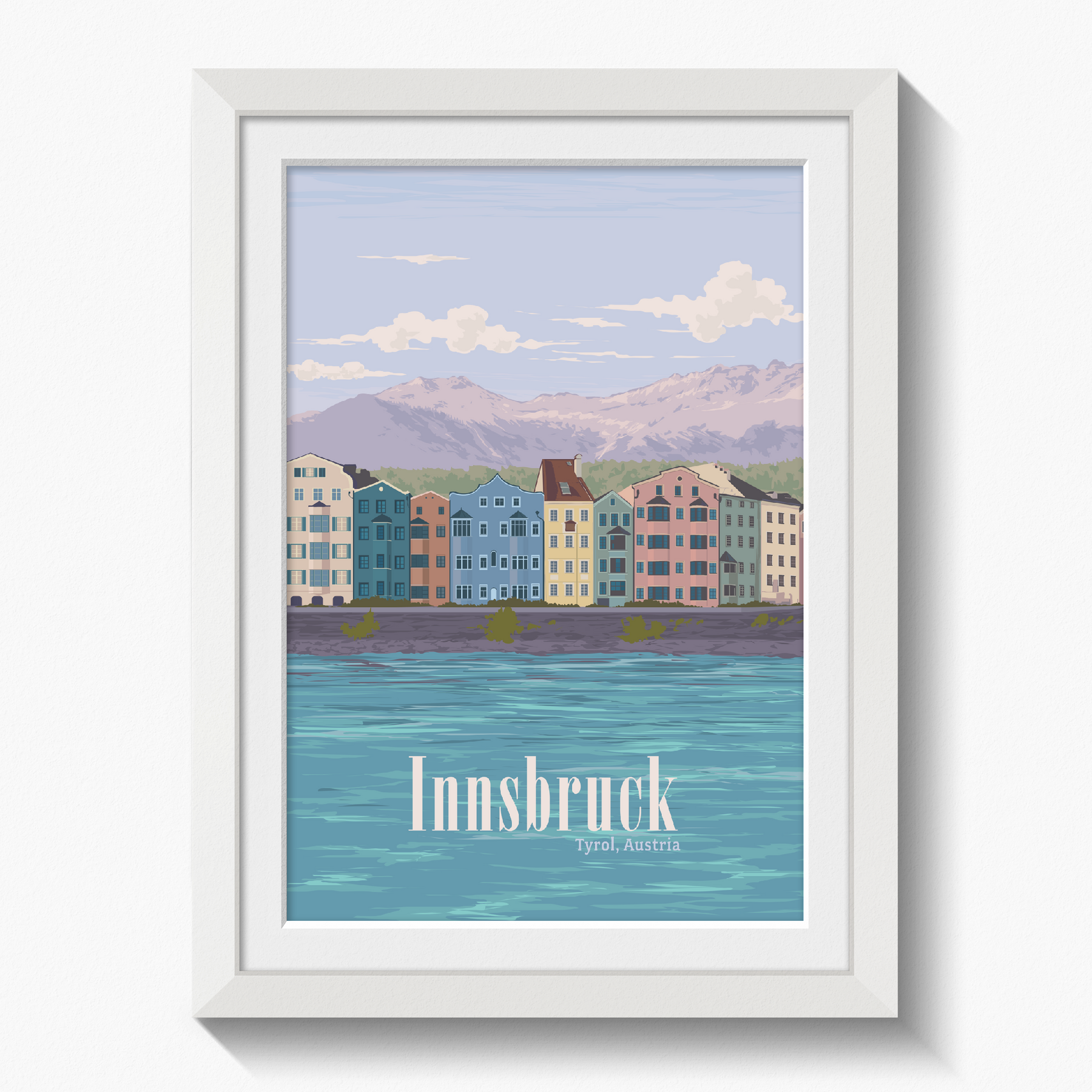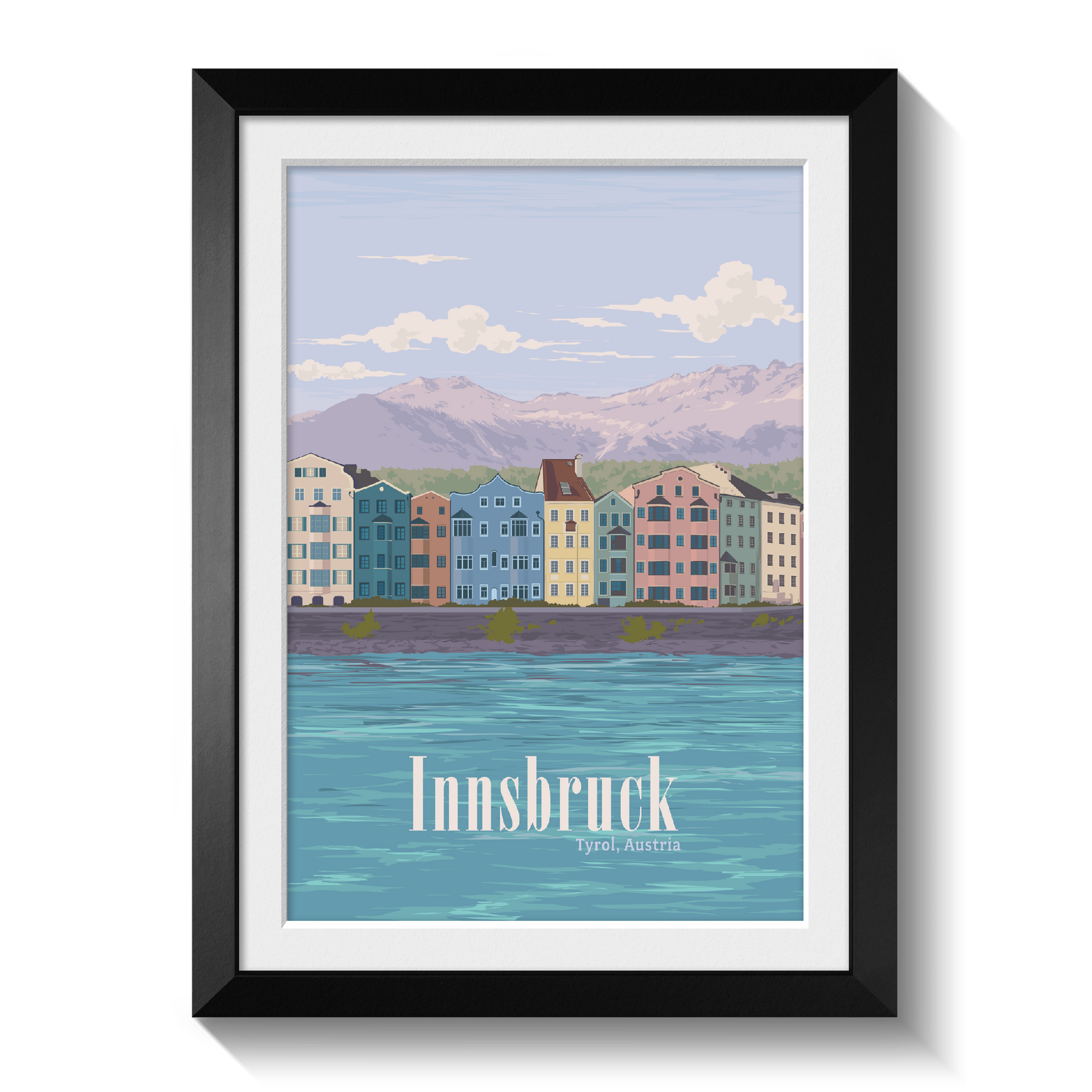 An original travel poster featuring the stunning colourful houses along the banks of the Inn River in Innsbruck, Austria. Innsbruck is the capital of the state of Tyrol in the Austrian Alps; a hub for winter sports.