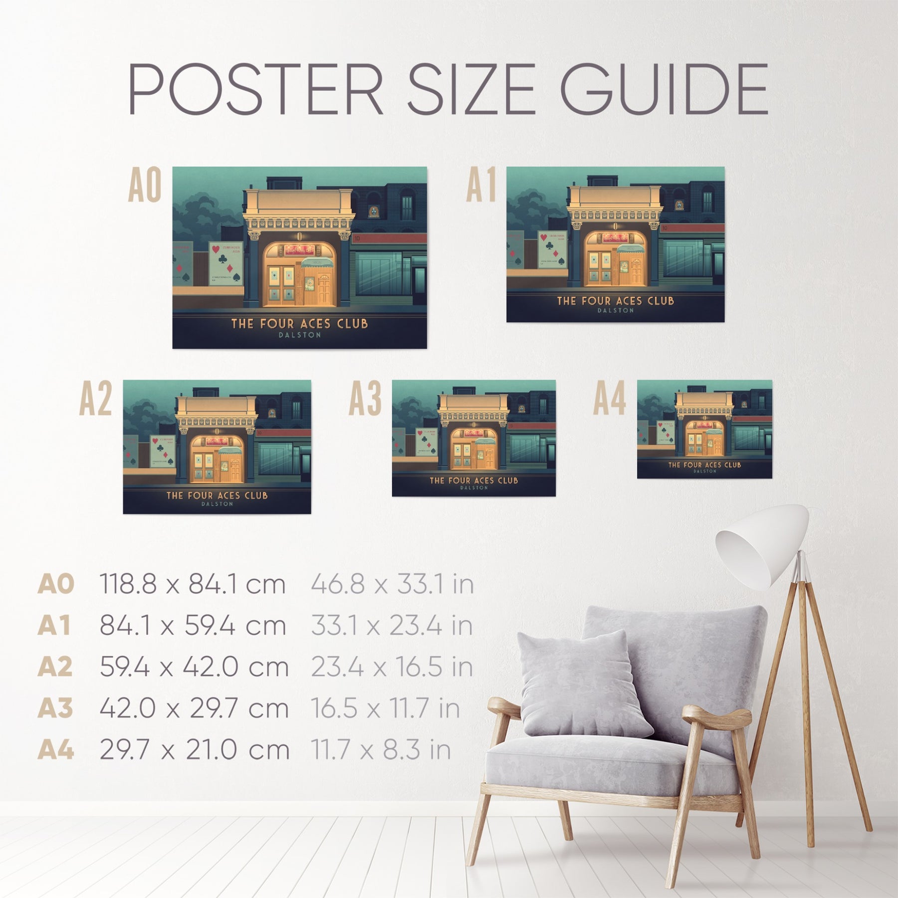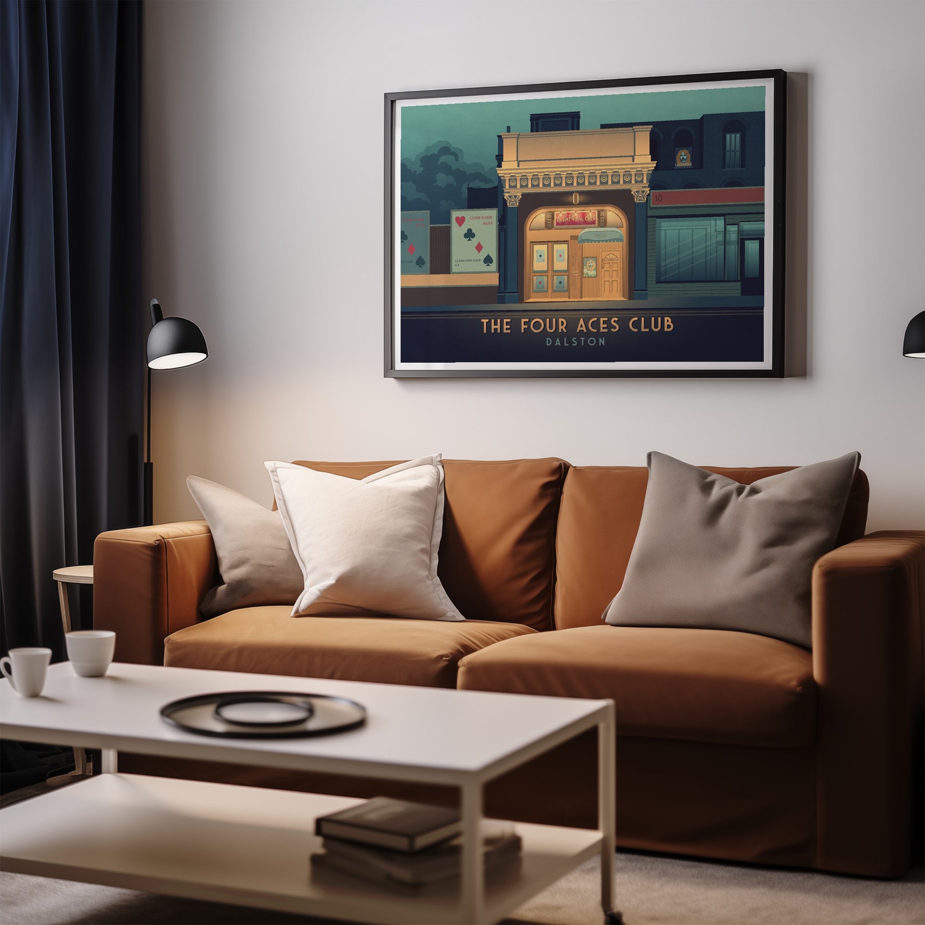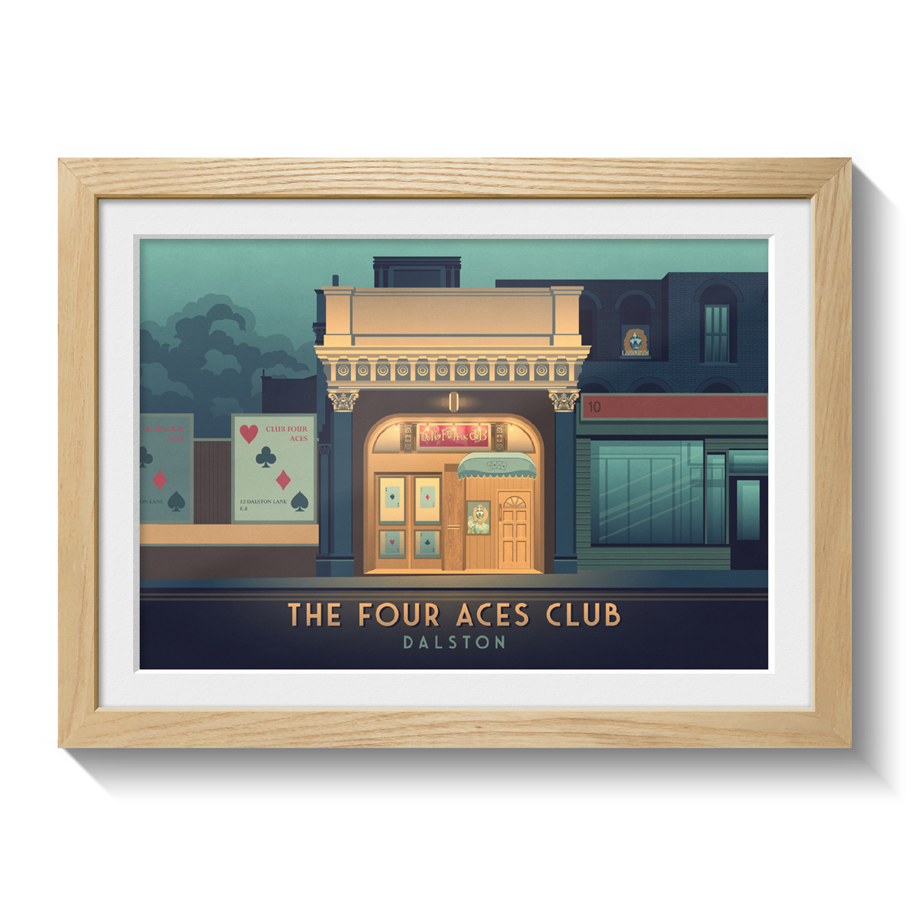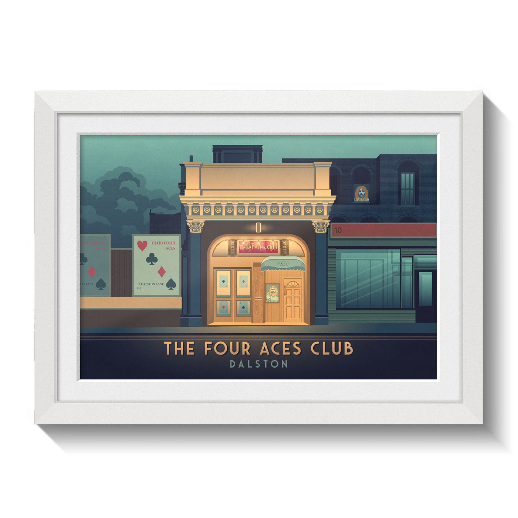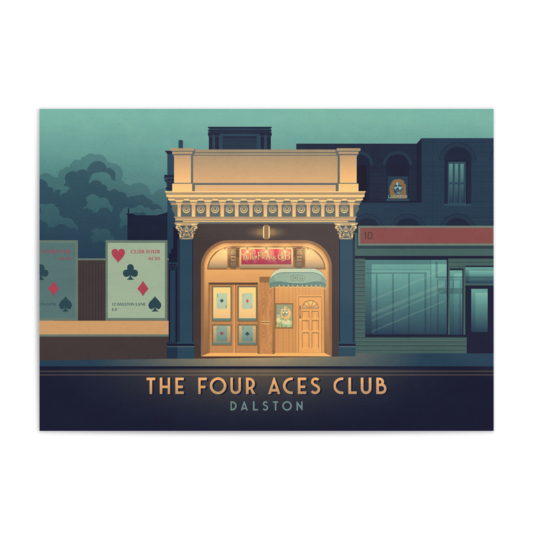An original travel poster featuring legendary East London venue The Four Aces Club in Dalston.