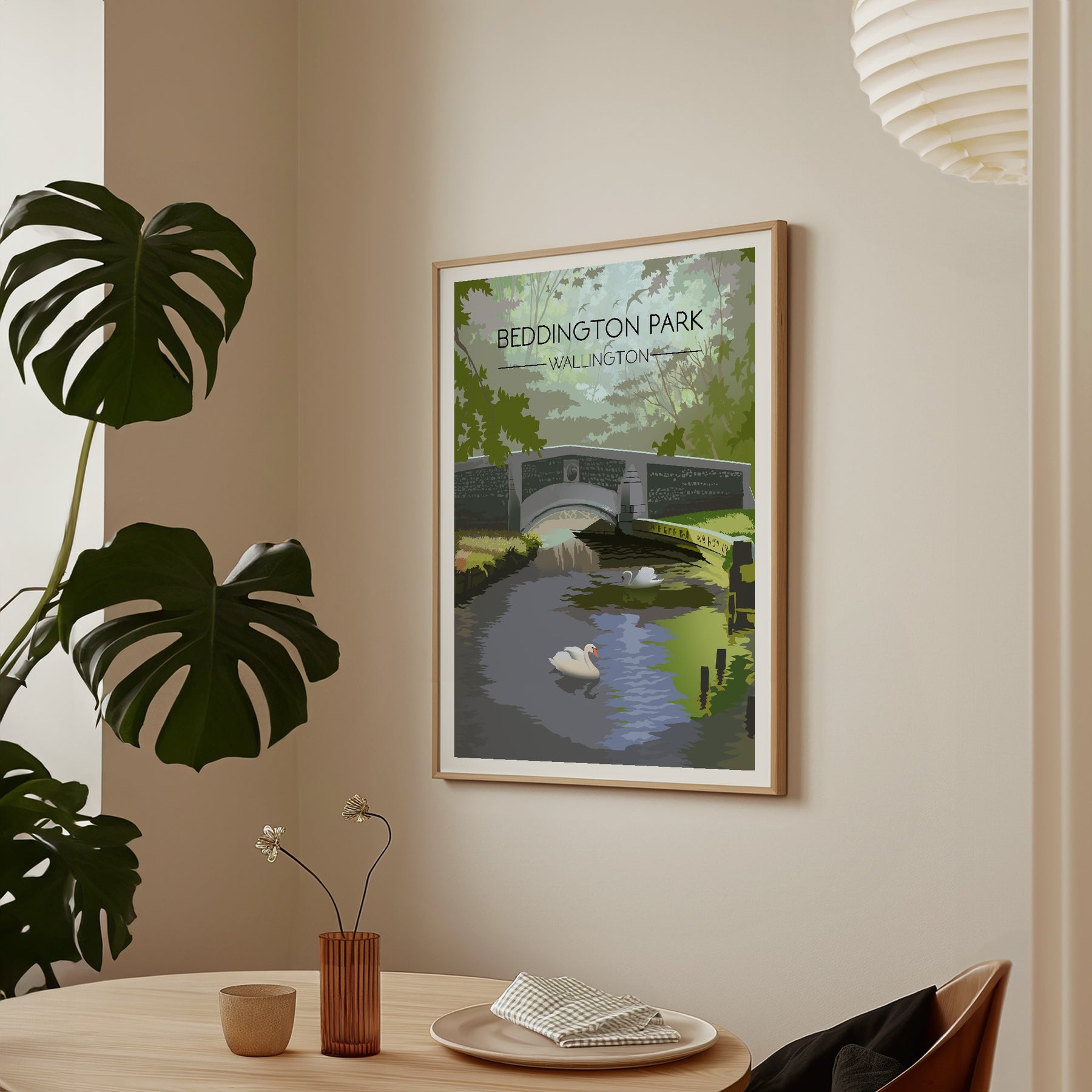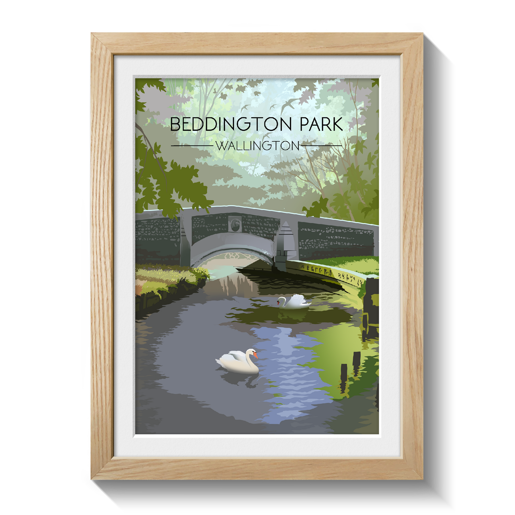 Original travel poster featuring the ancient Beddington Park with a view of the bridge crossing the River Wandle.