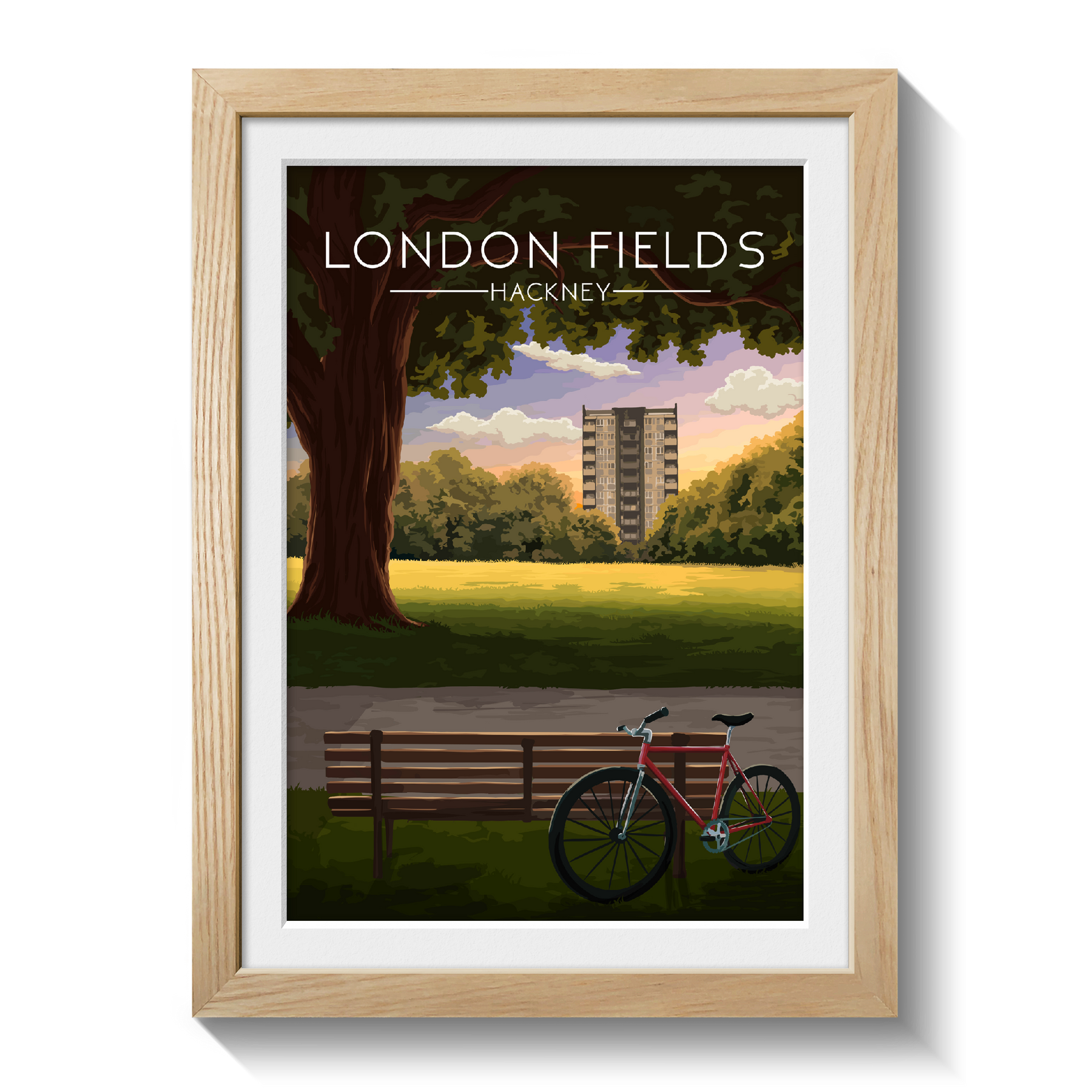 A full colour print featuring a peaceful scene as the sun comes up over Hackney's London Fields in East London, a stones throw from Broadway Market.