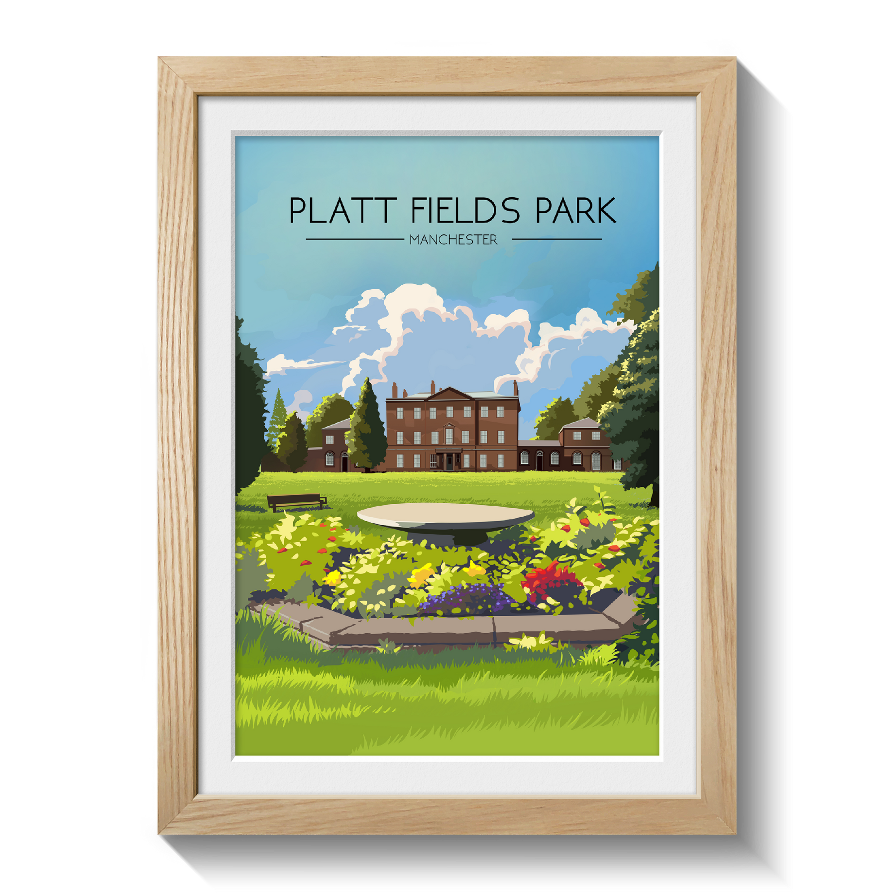 An original travel poster featuringPlatt Fields Park, Fallowfield, Manchester, England. This popular public park in Manchester is home to Platt Hall.