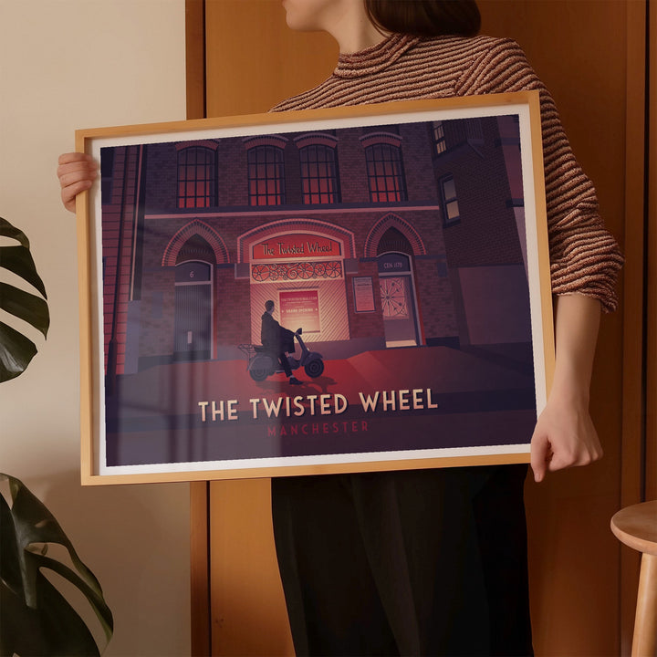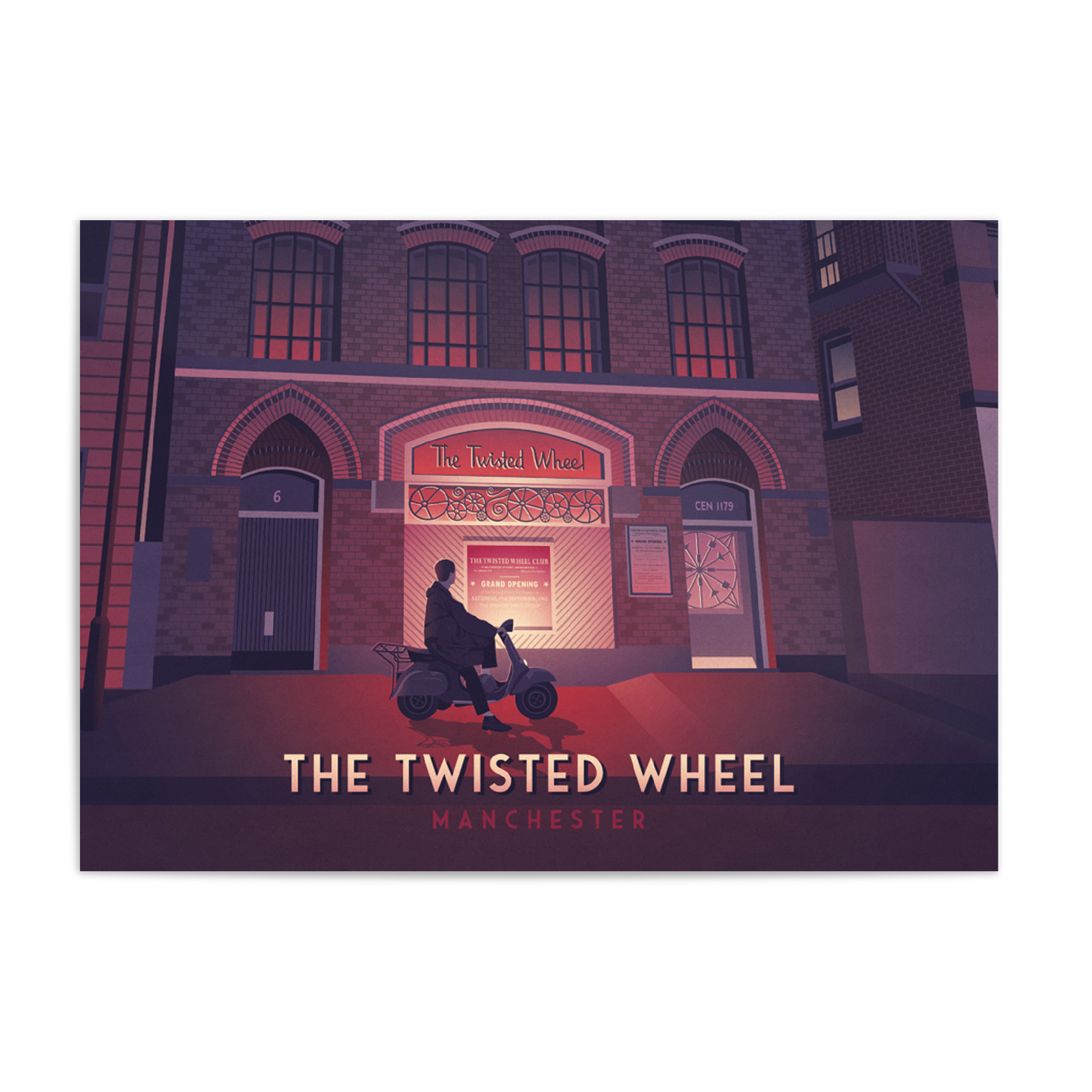 An original travel poster featuring iconic live music venue The Twisted Wheel in Manchester, famously one of the UK's premier Northern Soul clubs. The Twisted Wheel nightclub opened as a soul and blues club and was one of the first clubs to start playing Northern Soul music.