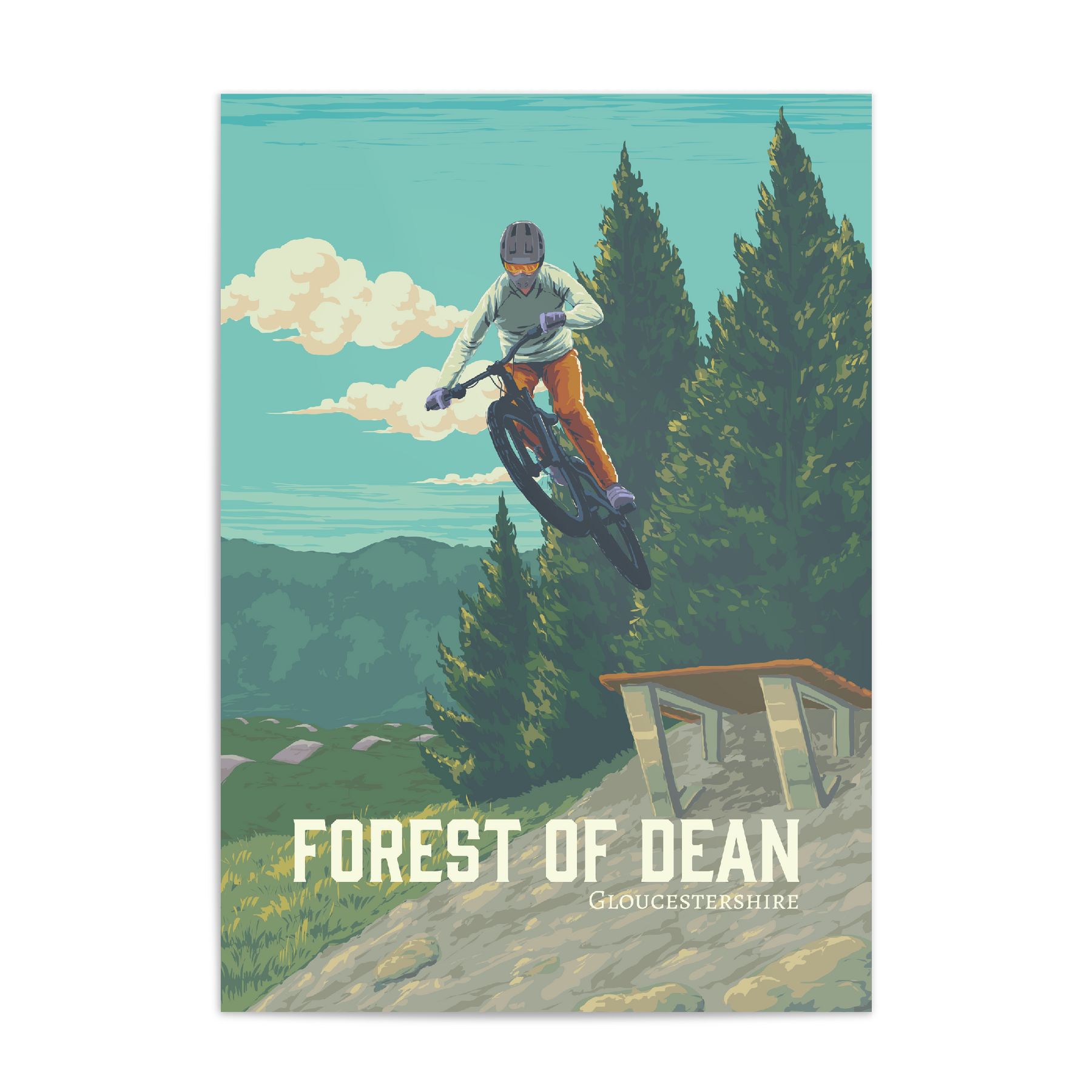 An original travel poster featuring the Forest of Dean in Gloucestershire, a popular mountain biking area featuring multiple trails of varying lengths and difficulty levels.