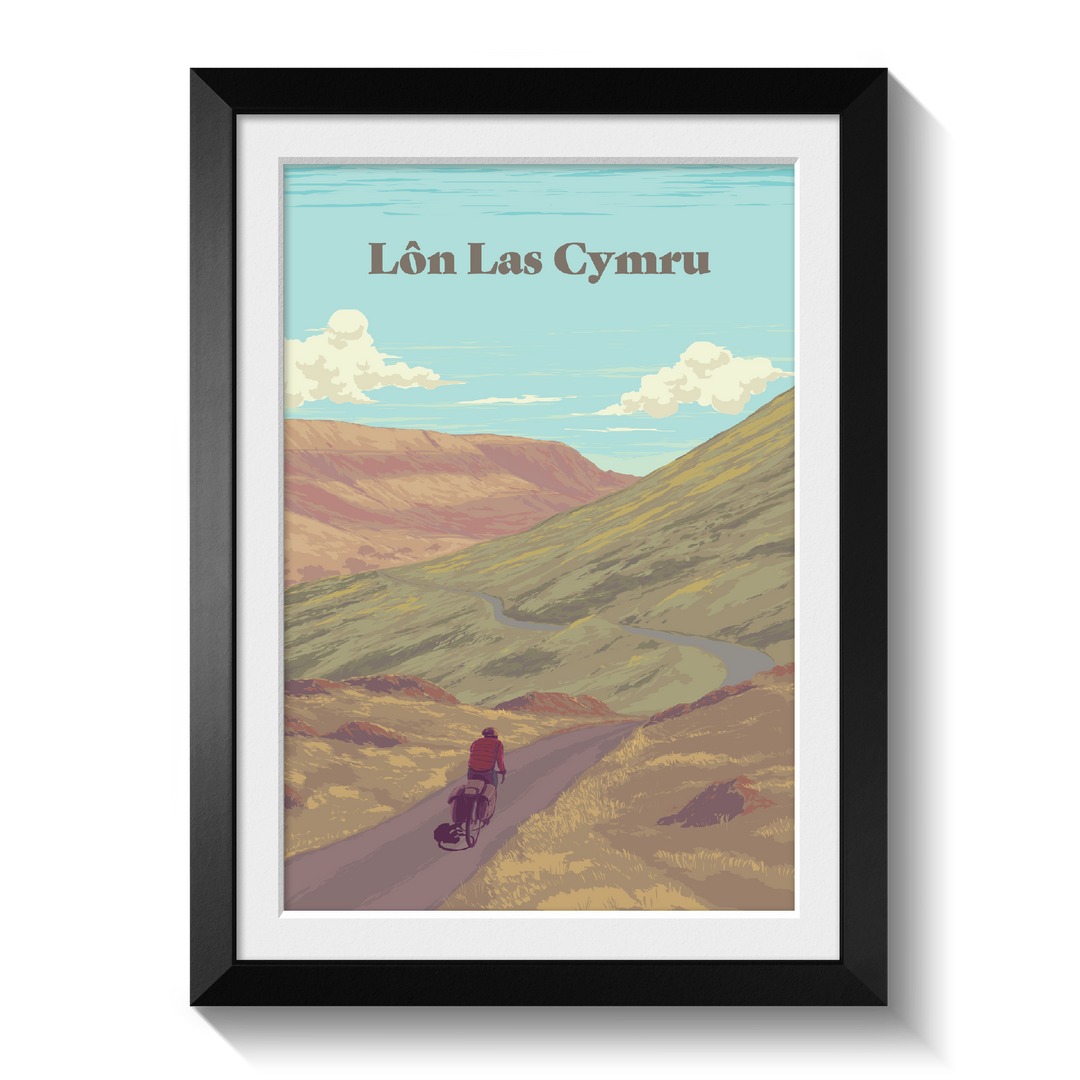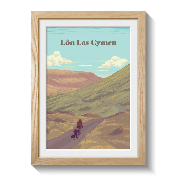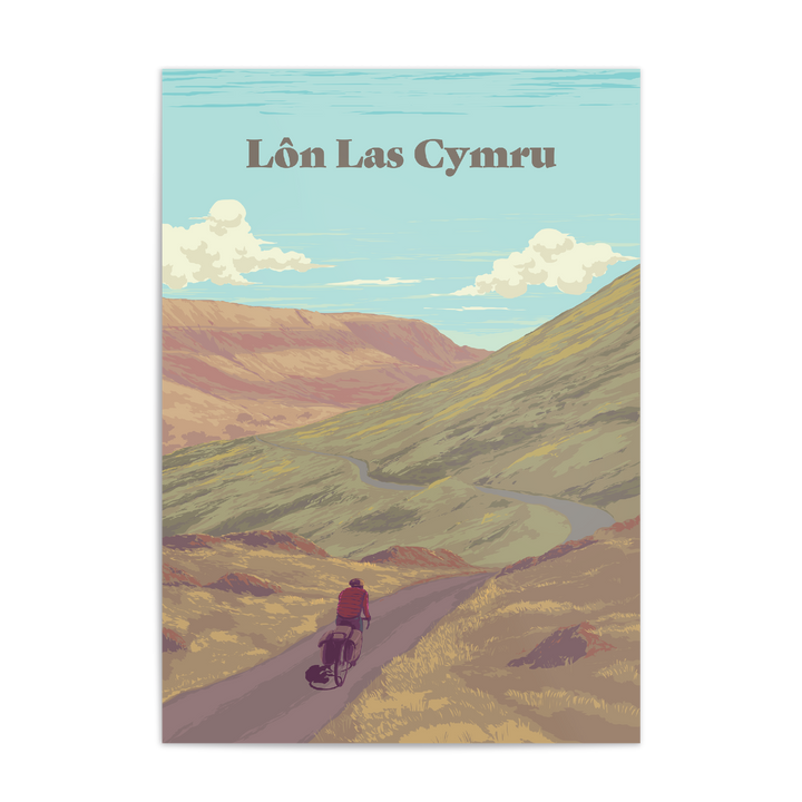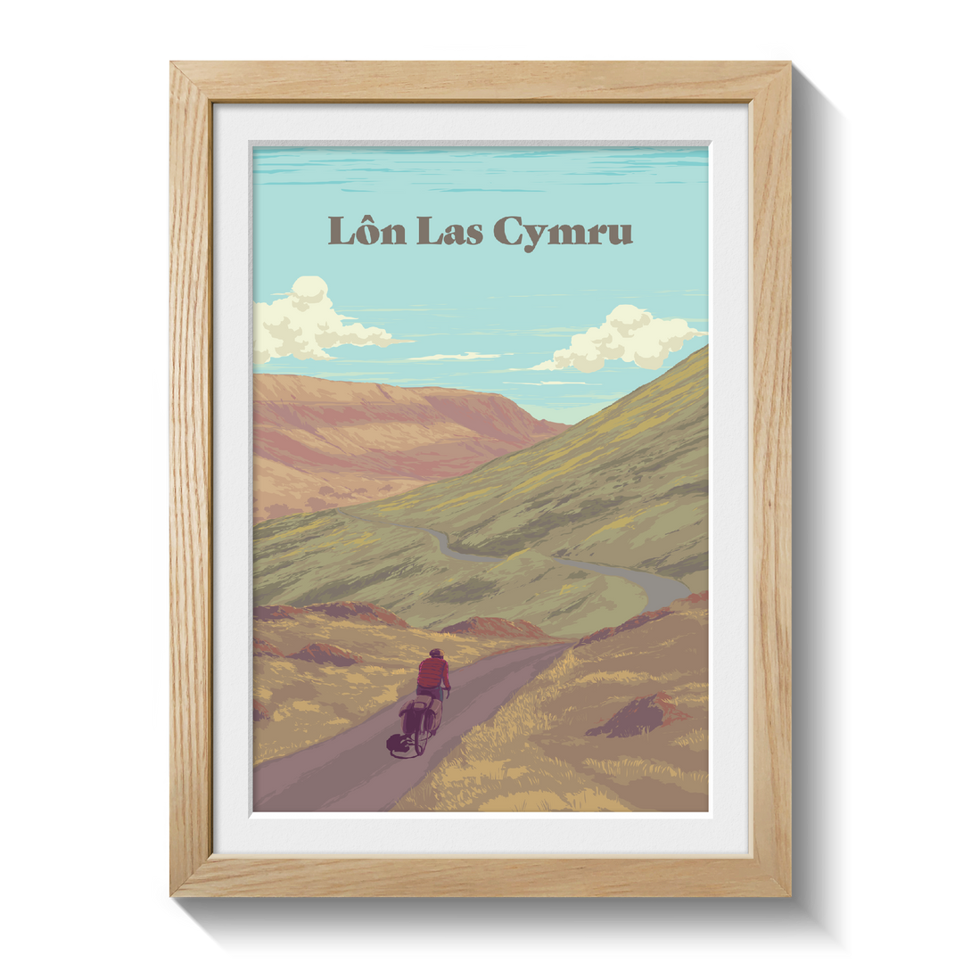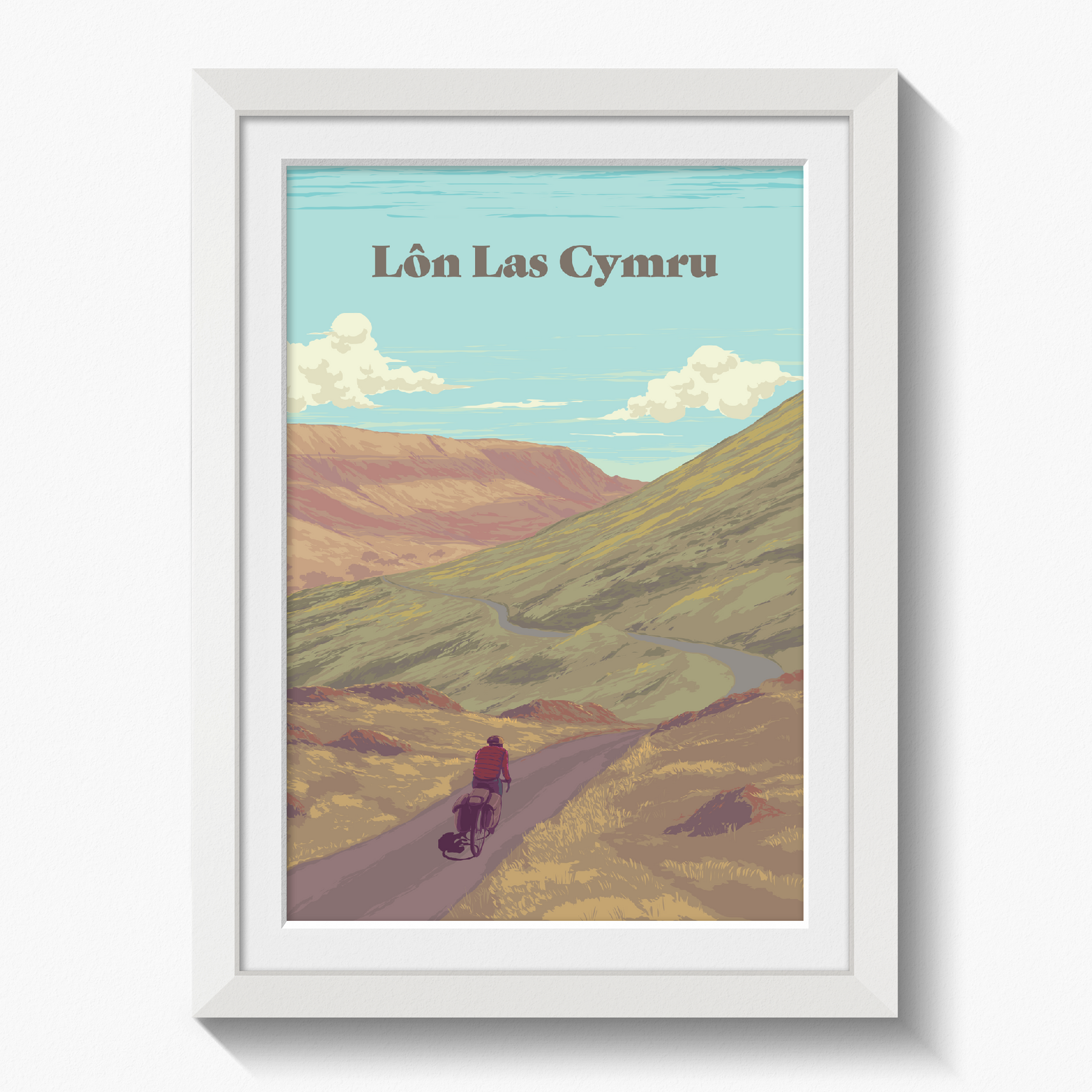 An original travel poster celebrating National Cycle Route 8, better known as Lon Las Cymru - a long distance cycle touring route through the heart of Wales from Cardiff to Holyhead.