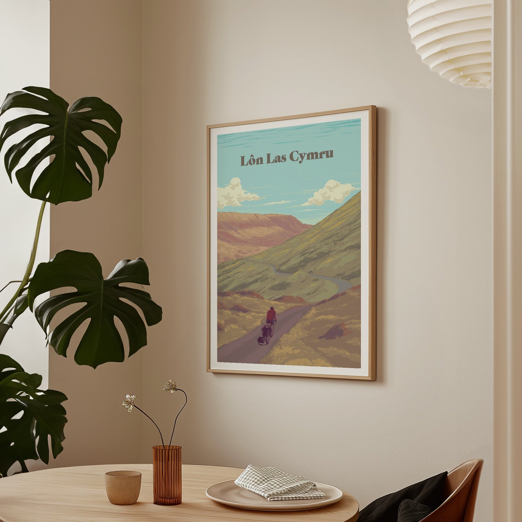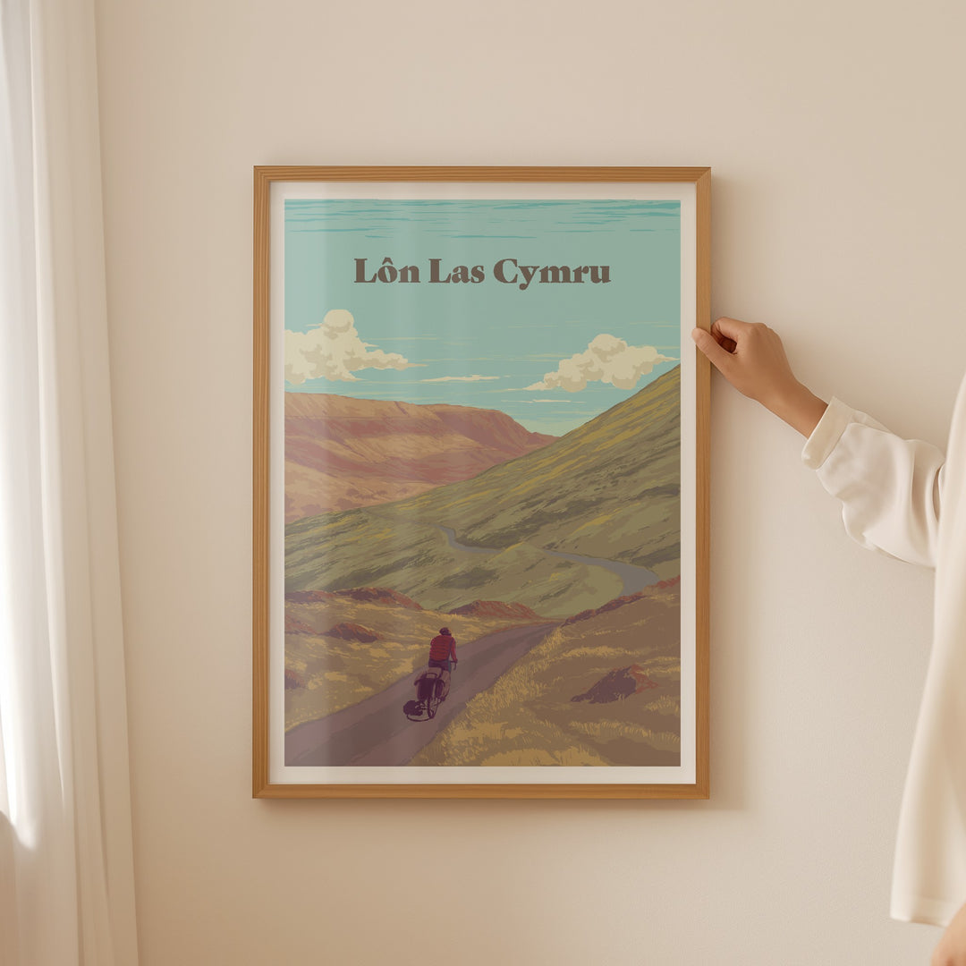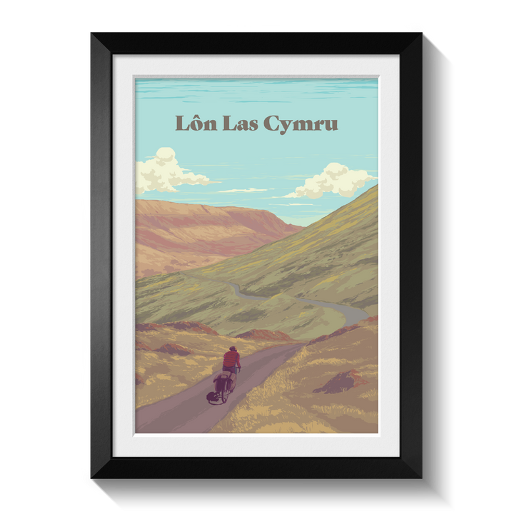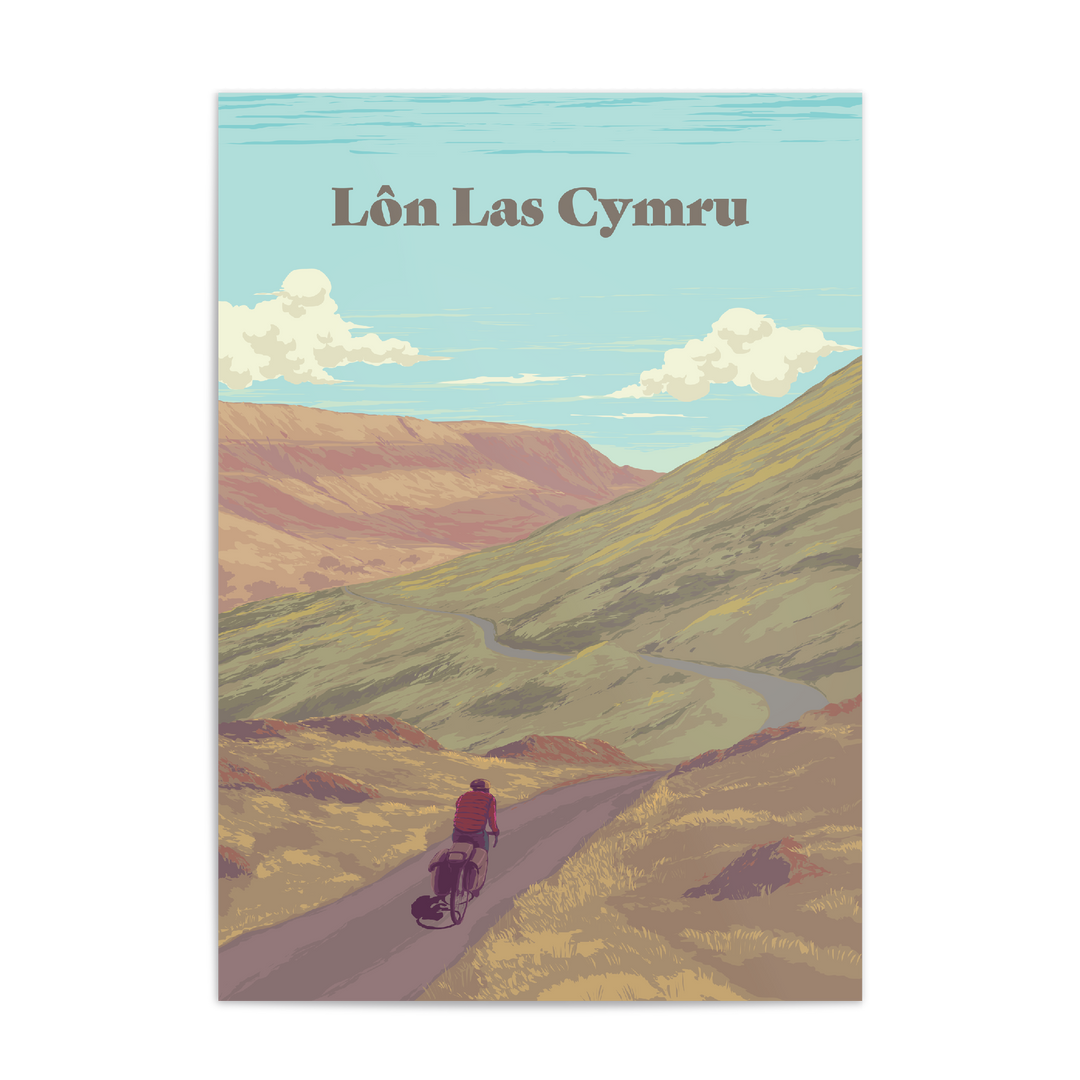 An original travel poster celebrating National Cycle Route 8, better known as Lon Las Cymru - a long distance cycle touring route through the heart of Wales from Cardiff to Holyhead.