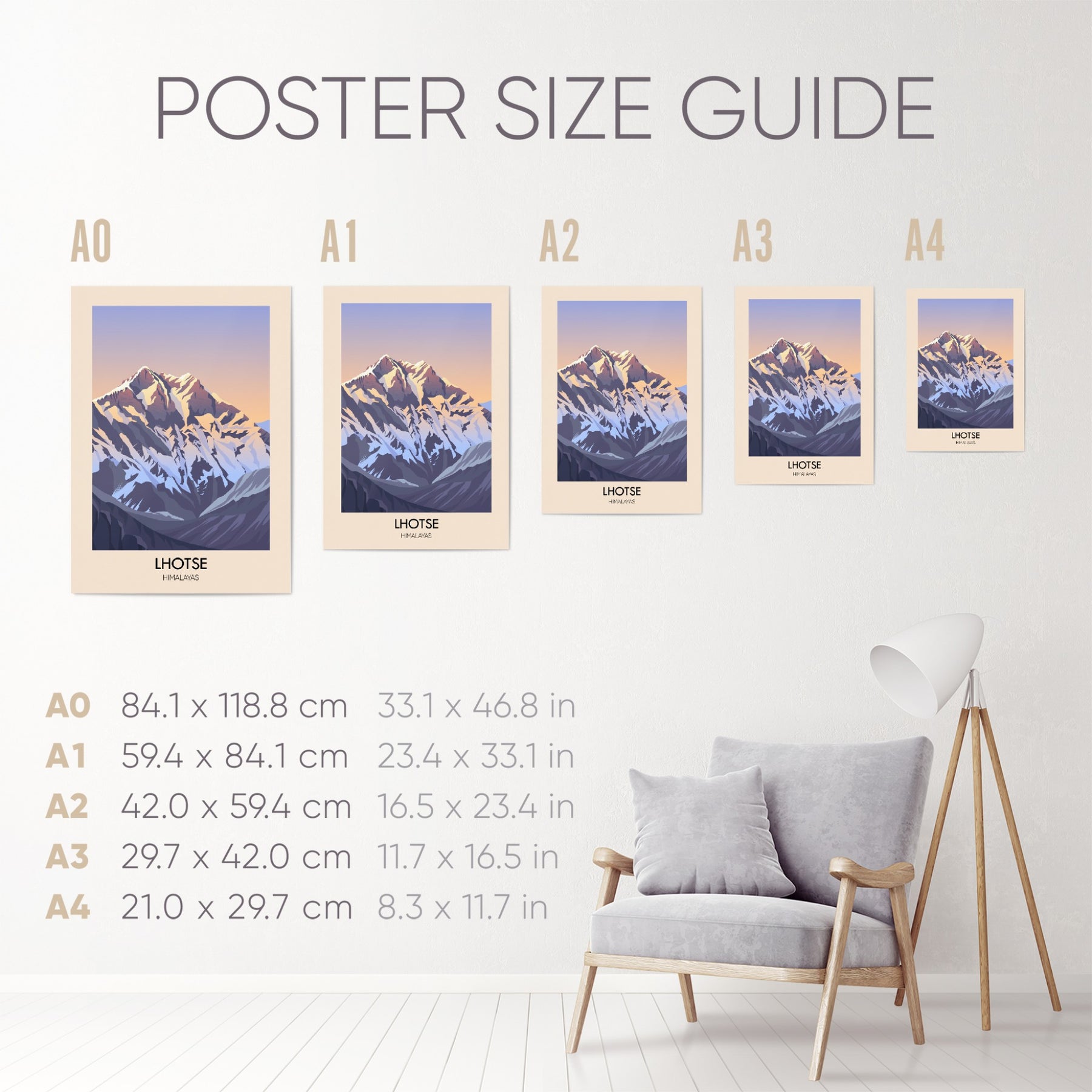 An original travel poster of the iconic Lhotse mountain. Lhotse, standing at 8,516 meters, is the world’s fourth-highest mountain, located in the Himalayas near Mount Everest. Known for its steep, icy terrain and challenging South Face, Lhotse is a popular, yet demanding destination for climbers. Its proximity to Everest enhances its allure among high-altitude enthusiasts.