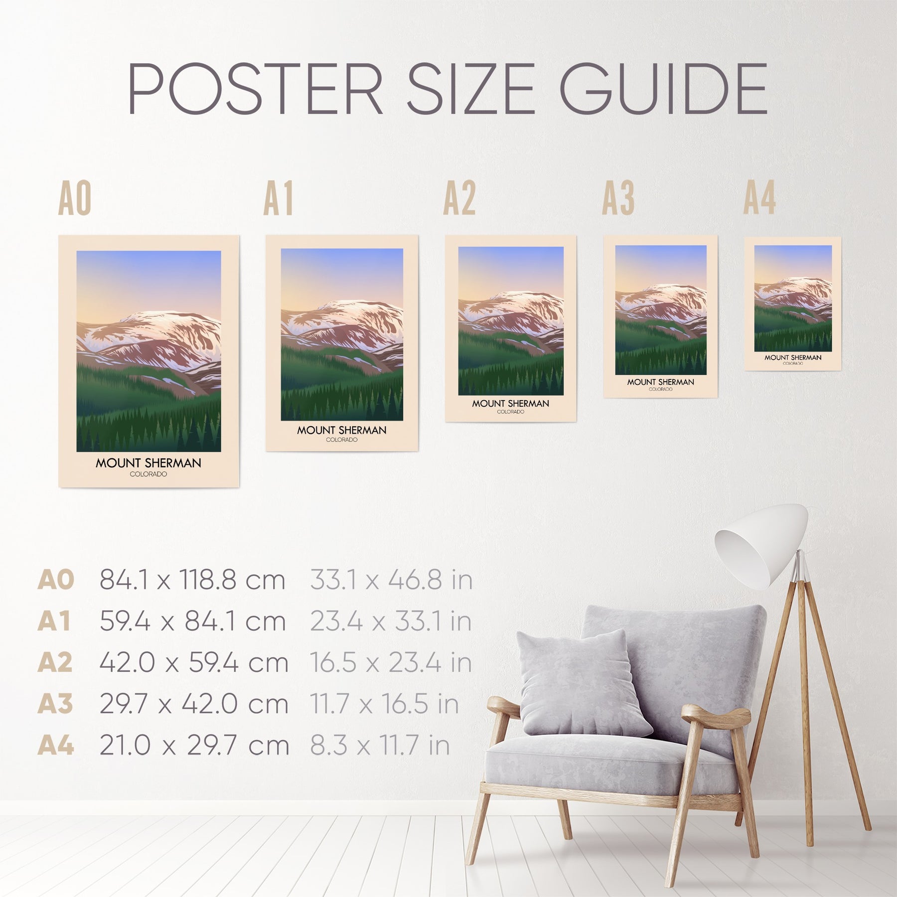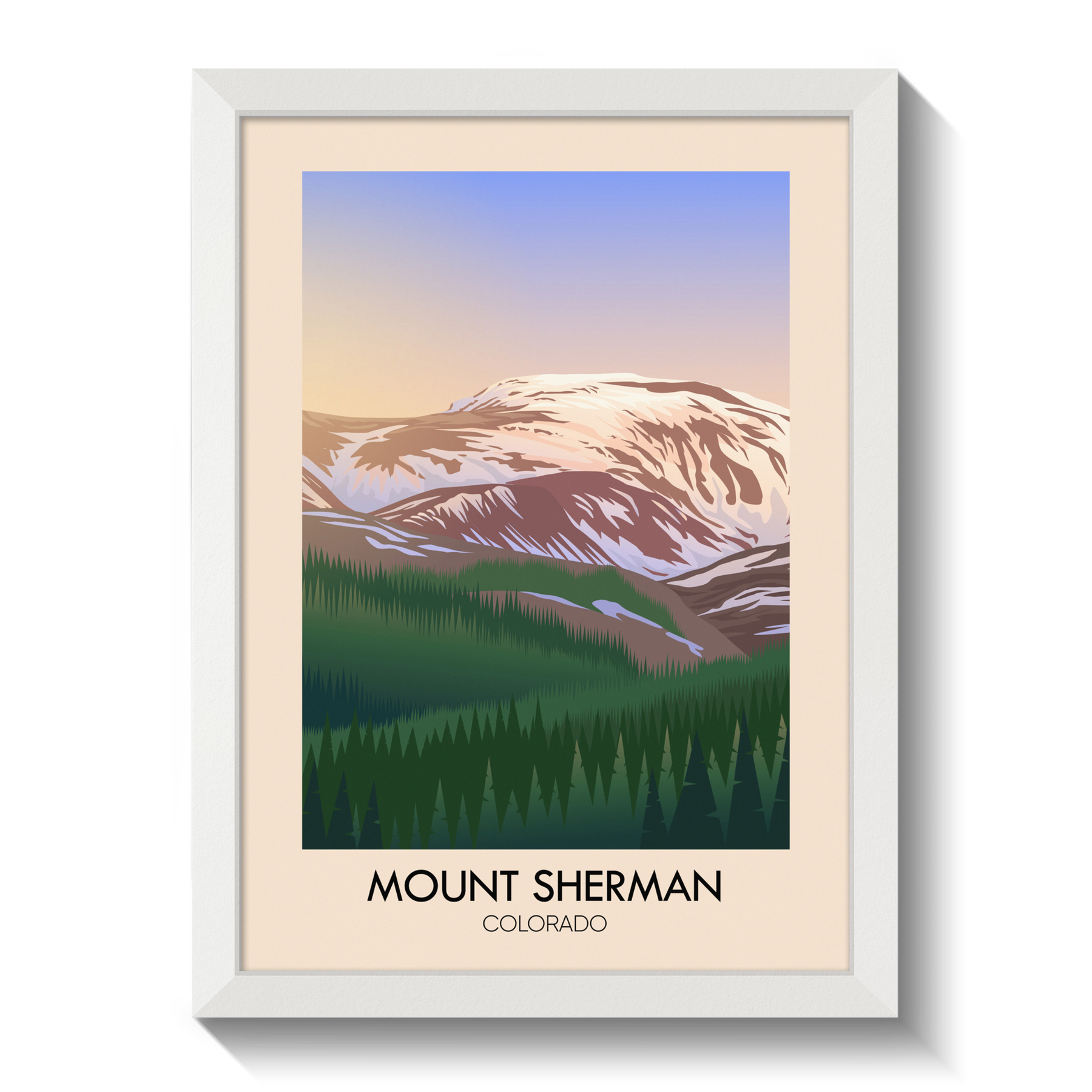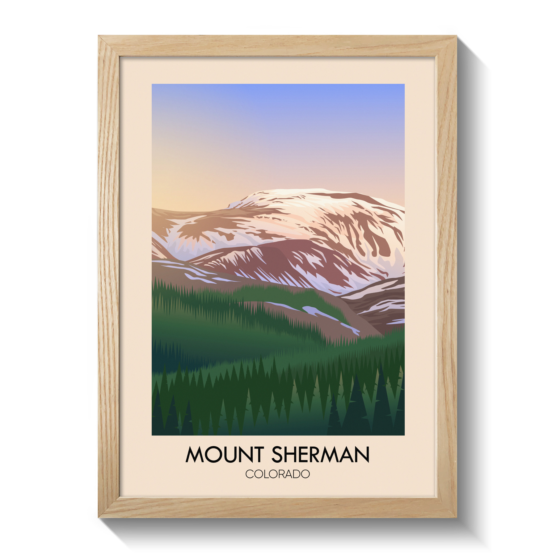 This Mount Sherman travel poster showcases the gentle slopes and open ridgelines of one of Colorado’s easiest and most beginner-friendly Fourteeners. Ideal for first-time summit seekers and mountain lovers, it offers rewarding views with a manageable climb. Part of our Colorado 14ers collection, it celebrates the accessible beauty of Mount Sherman.