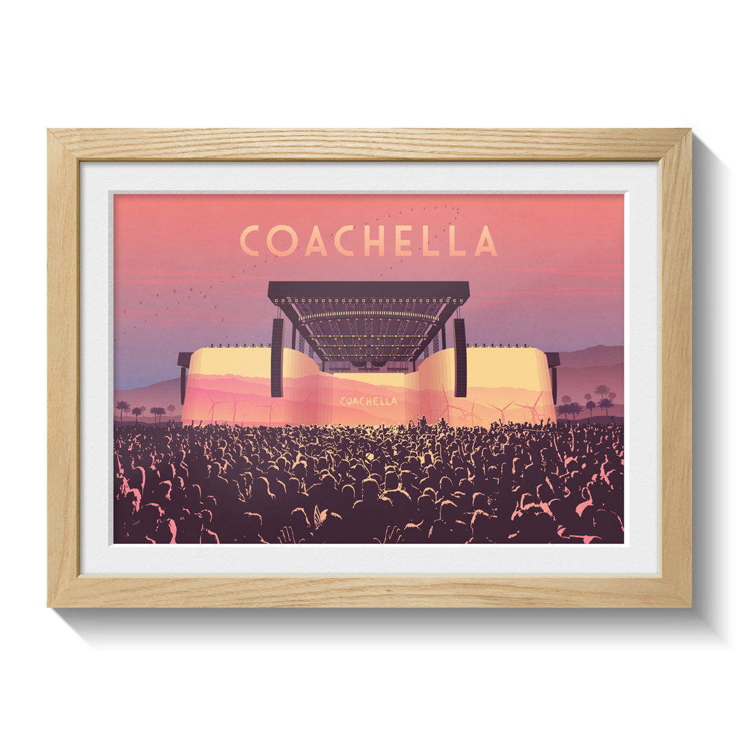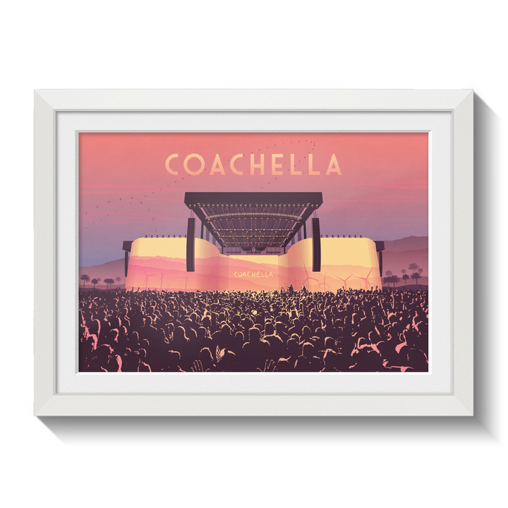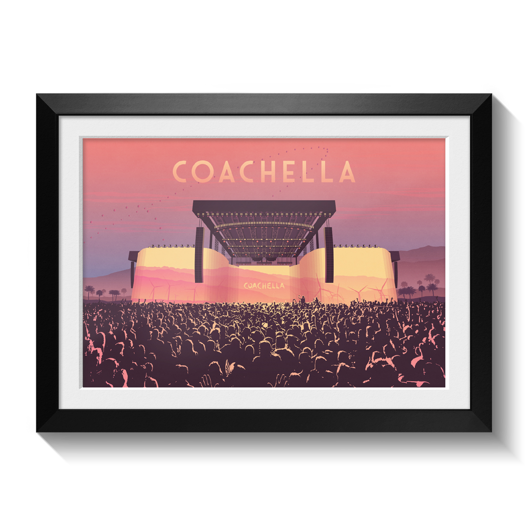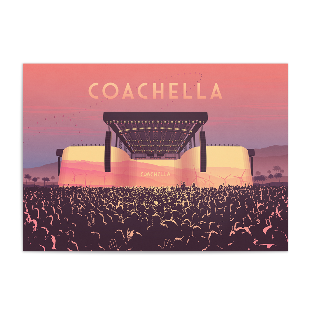 An original art print featuring the main stage at Coachella Music Festival. Coachella has been running since 1999 and has become one of the largest day festivals in the world.