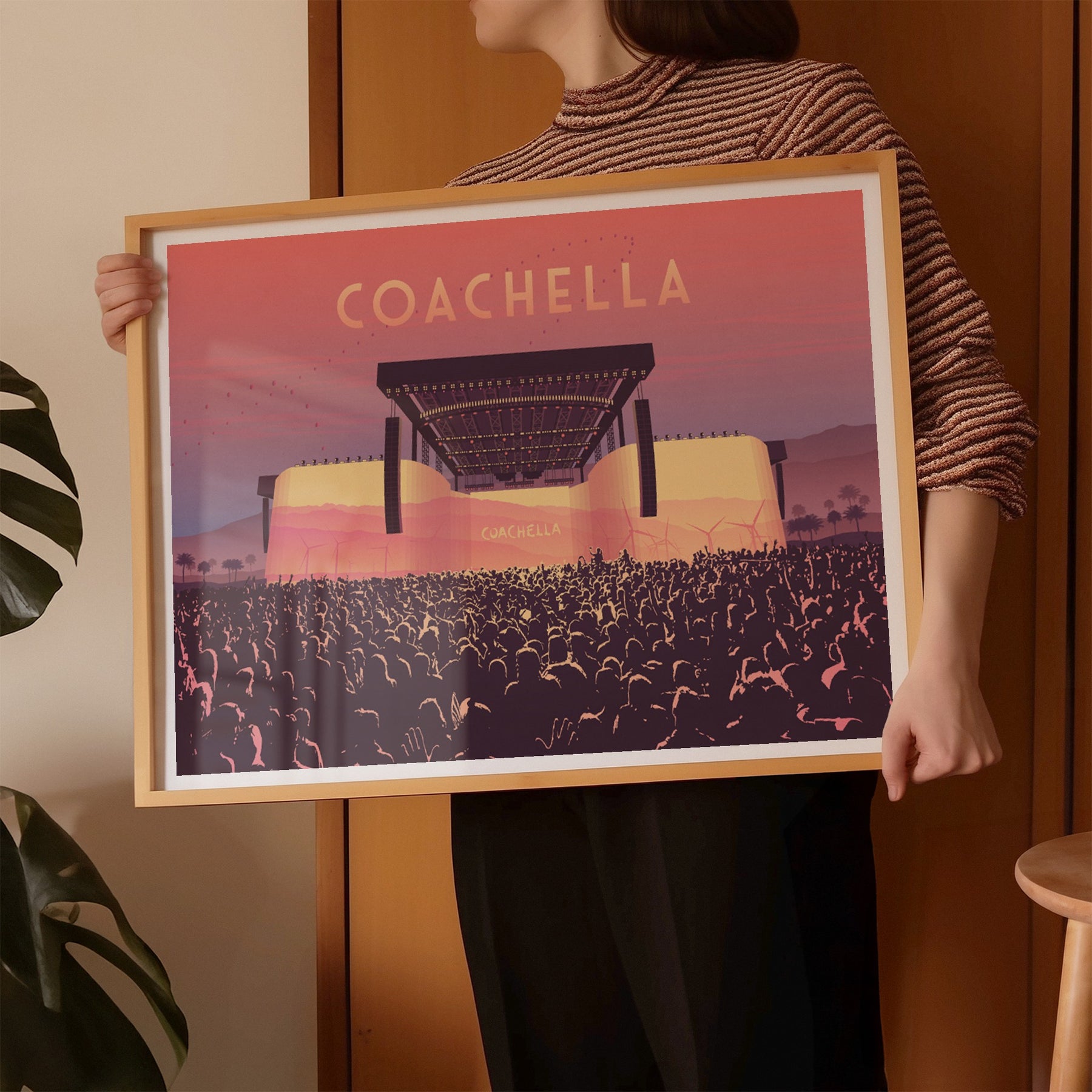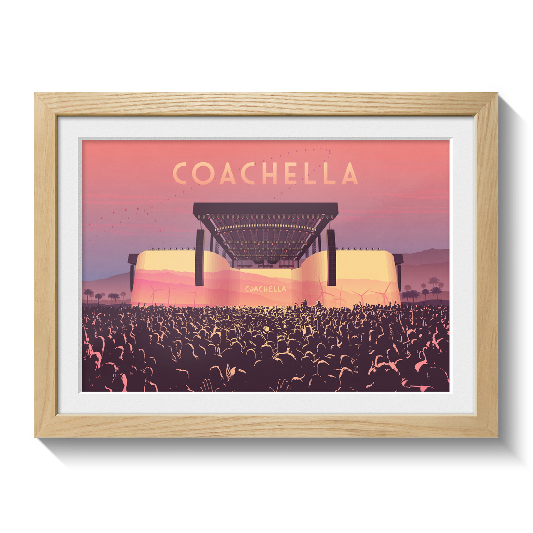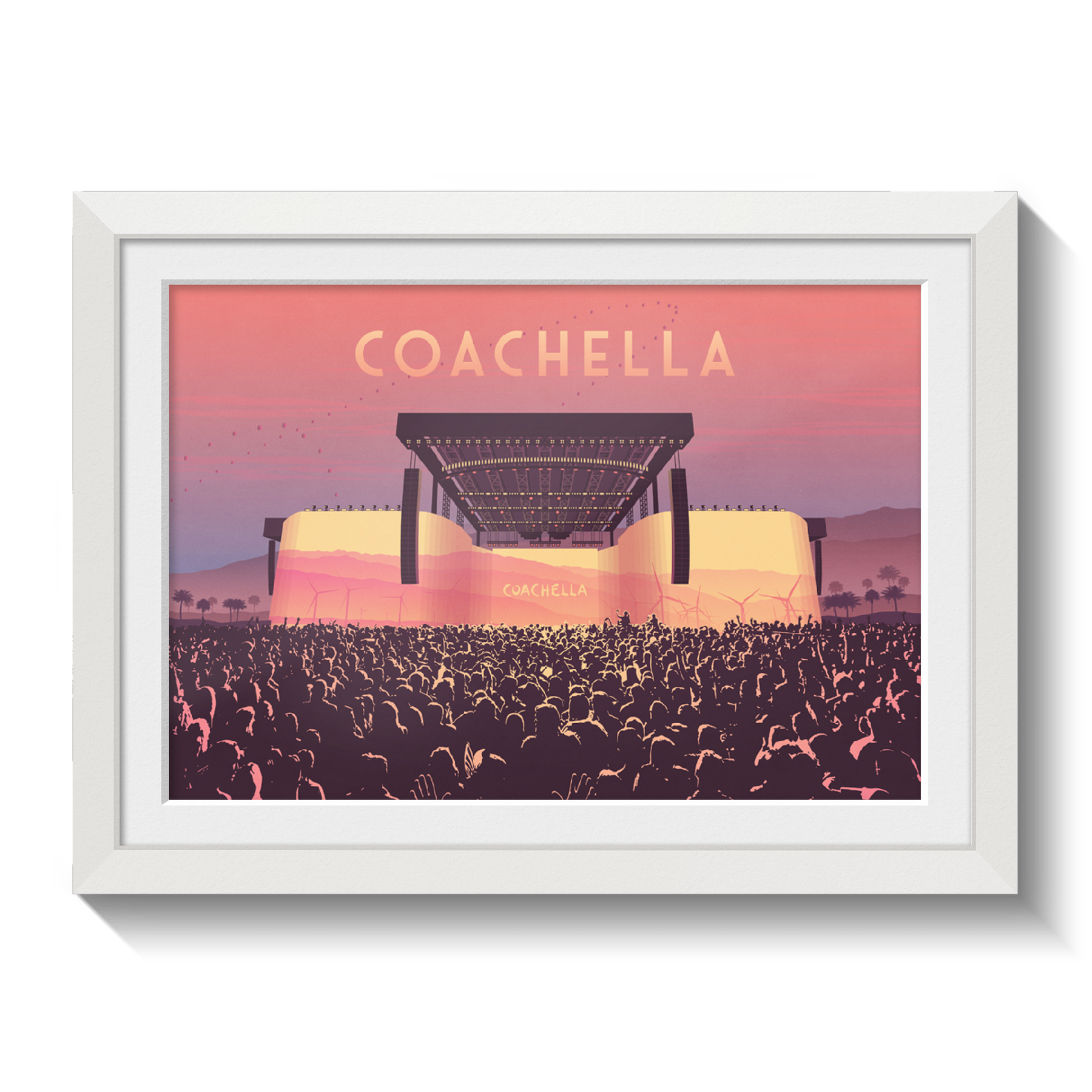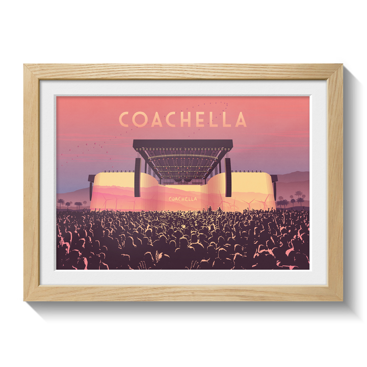 An original art print featuring the main stage at Coachella Music Festival. Coachella has been running since 1999 and has become one of the largest day festivals in the world.