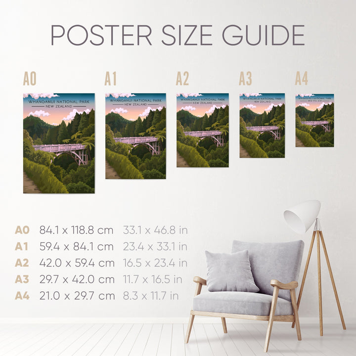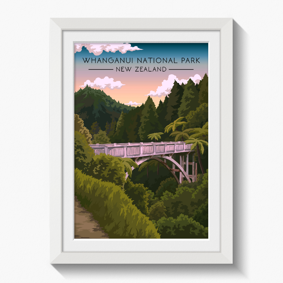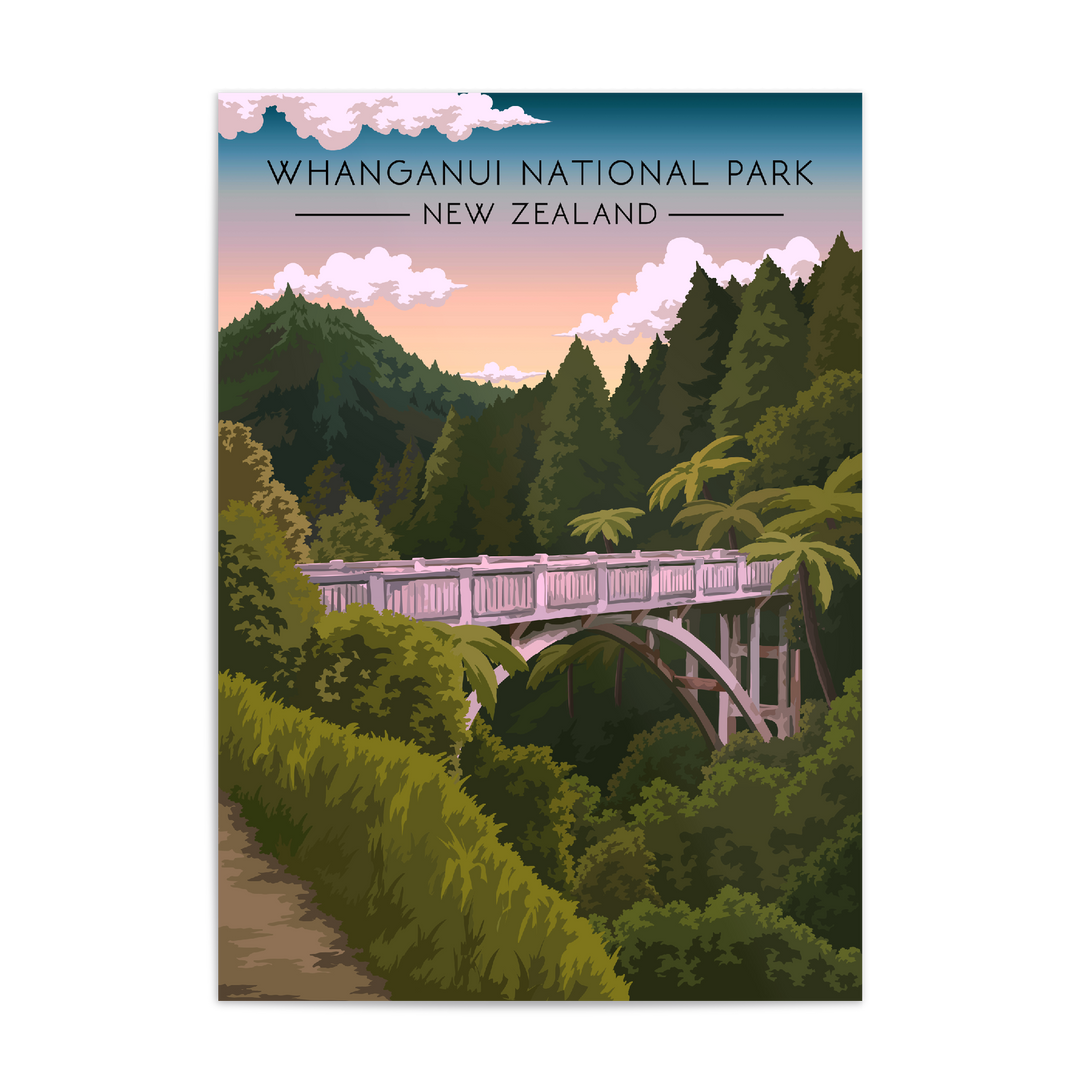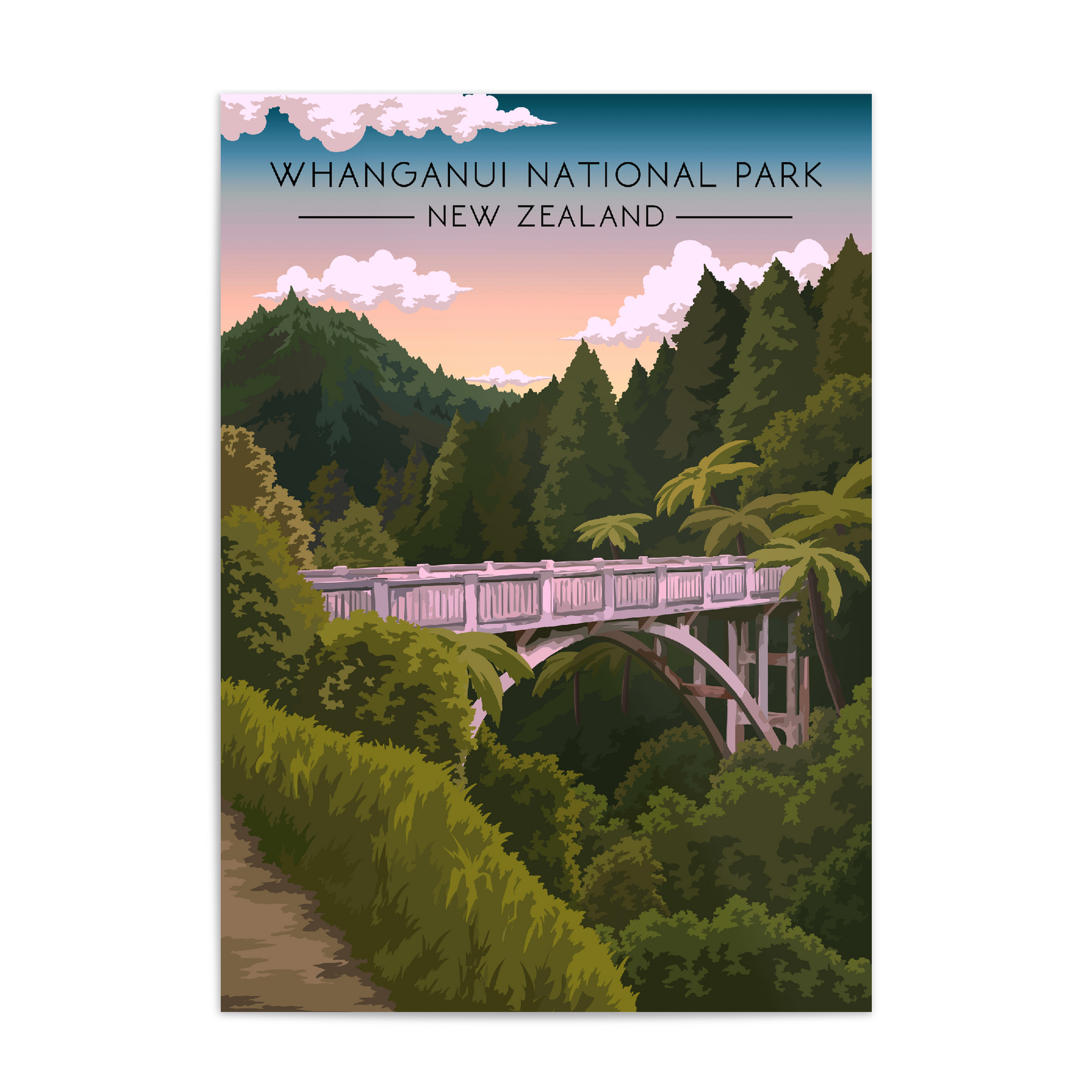 An original travel poster featuring the 'Bridge to Nowhere' in Whanganui National Park on New Zealand's North Island. The bridge was built as part of an agricultural development which has long since been abandoned. However, it remains a popular tourist attraction and with no roads leading to it, is accessible only by mountain bike or on foot.