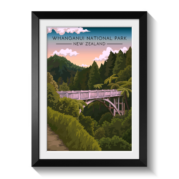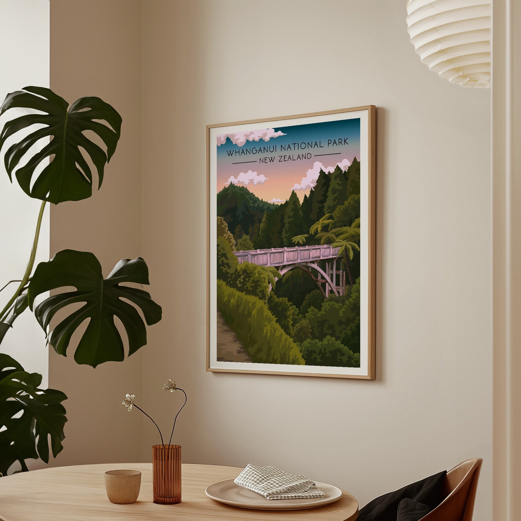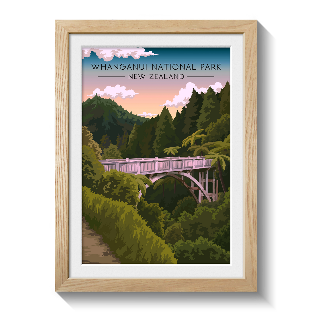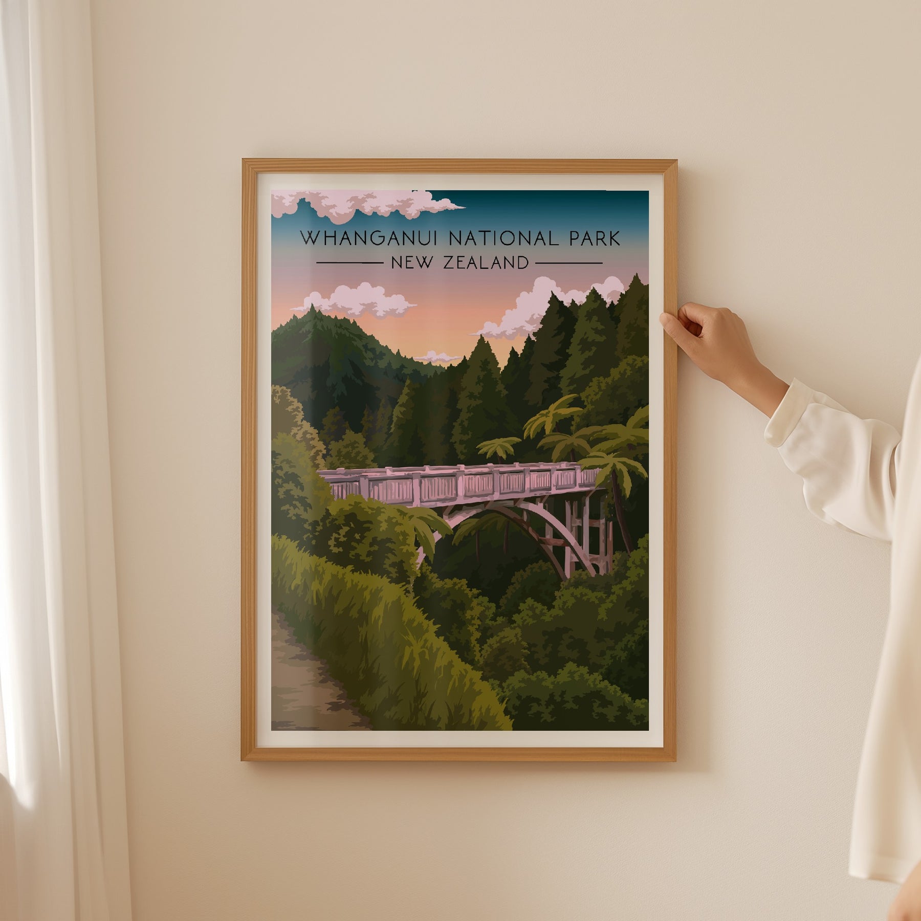 An original travel poster featuring the 'Bridge to Nowhere' in Whanganui National Park on New Zealand's North Island. The bridge was built as part of an agricultural development which has long since been abandoned. However, it remains a popular tourist attraction and with no roads leading to it, is accessible only by mountain bike or on foot.