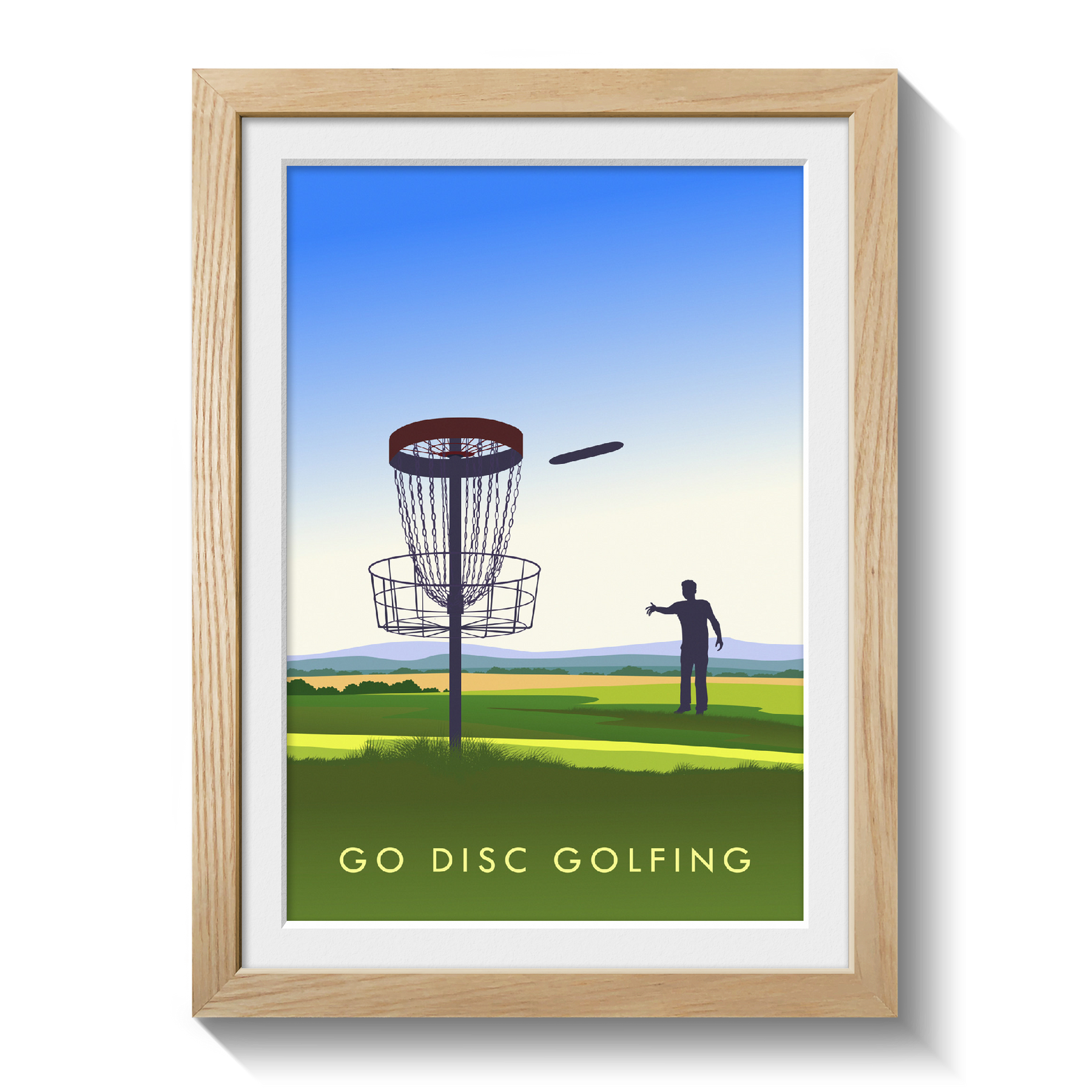 This is an original travel poster celebrating the sport of Disc Golf. Disc Golf, which is sometimes called Frisbee Golf or 'Folf' started becoming popular in the 60's in the USA. There is now a Professional Disc Golf Association and it is played all over the world.