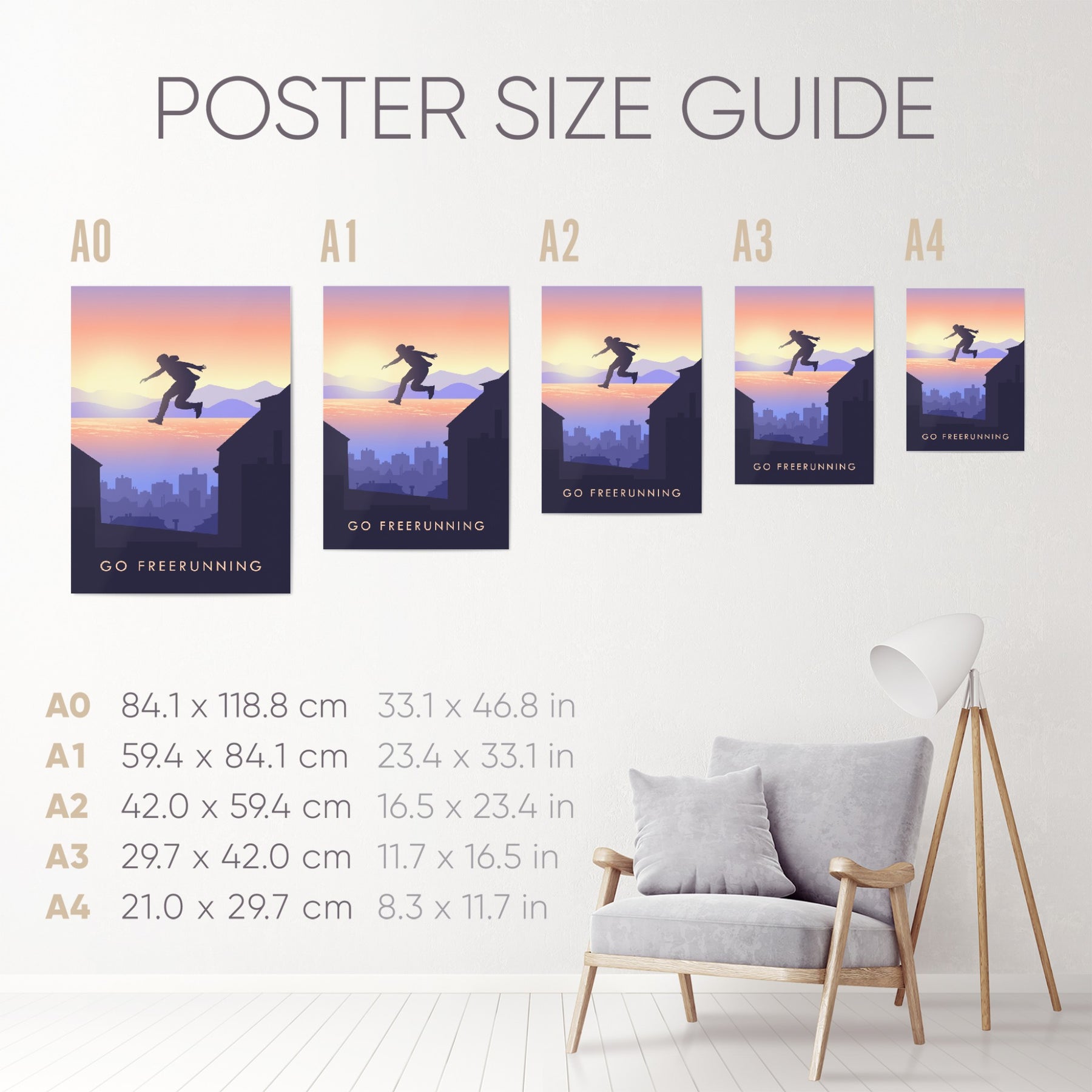 This is an original travel poster celebrating the sport of Freerunning. Freerunning involves interacting with physical obstacles in creative ways, such as by climbing, jumping or running. Freerunning is similar to parkour and was founded by Sebastien Foucan.