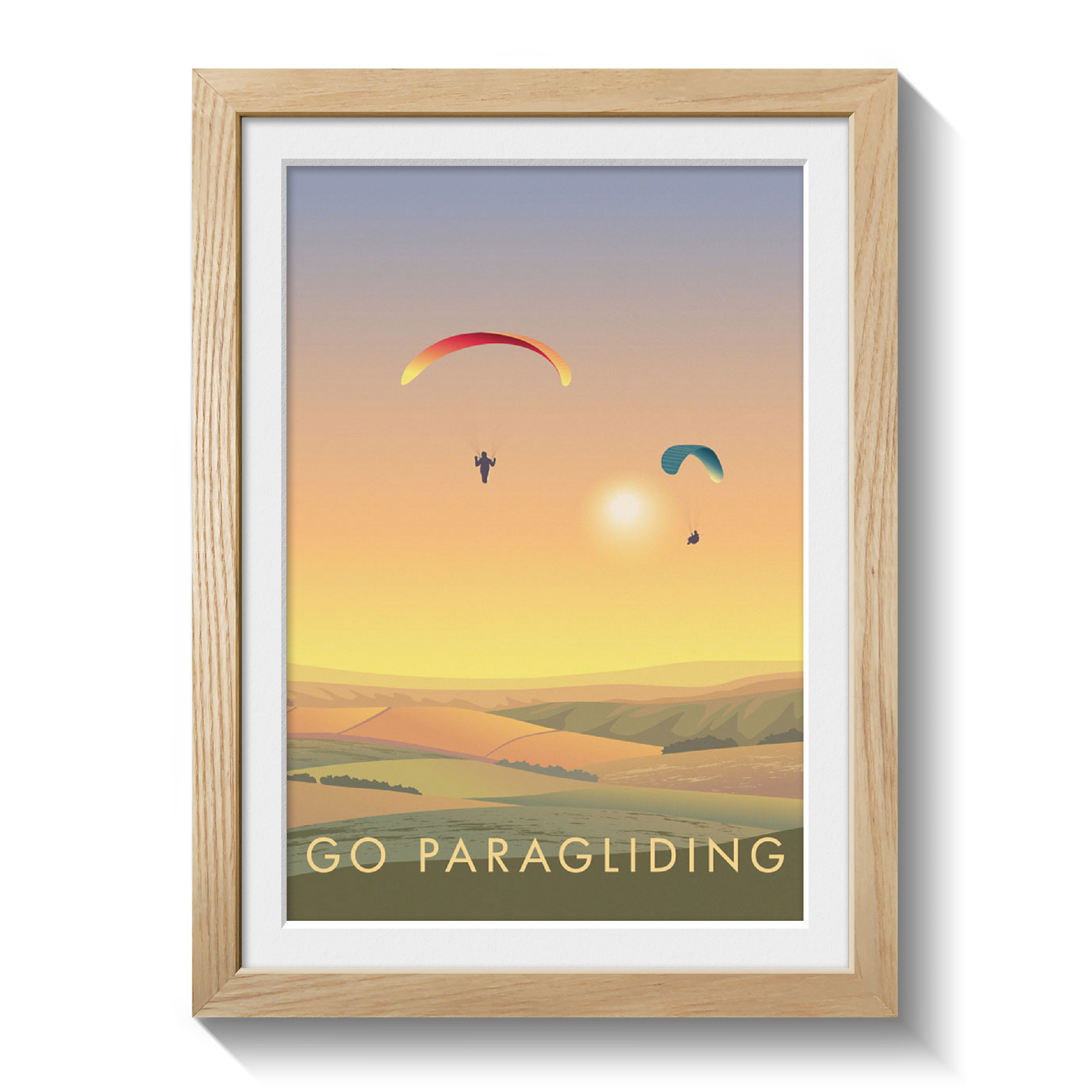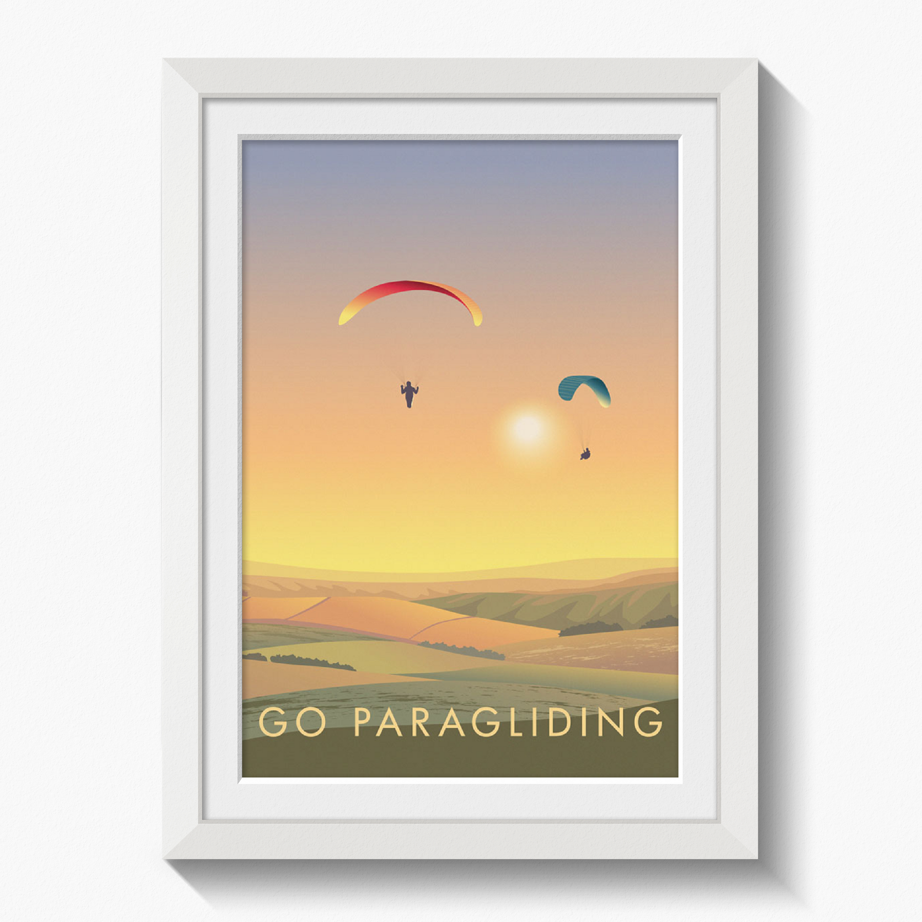 This is an original travel poster celebrating the ever popular outdoor sport of paragliding. A perfect gift for the paraglider in your life or a great way to celebrate your love of your favourite adventure sport.