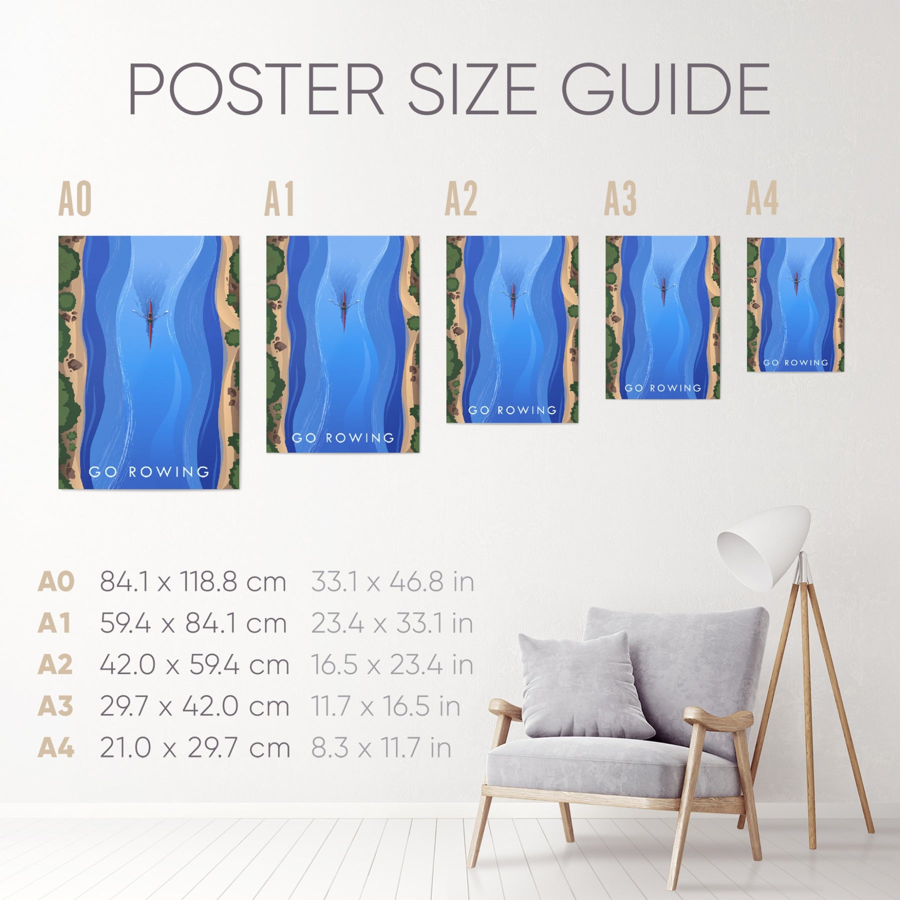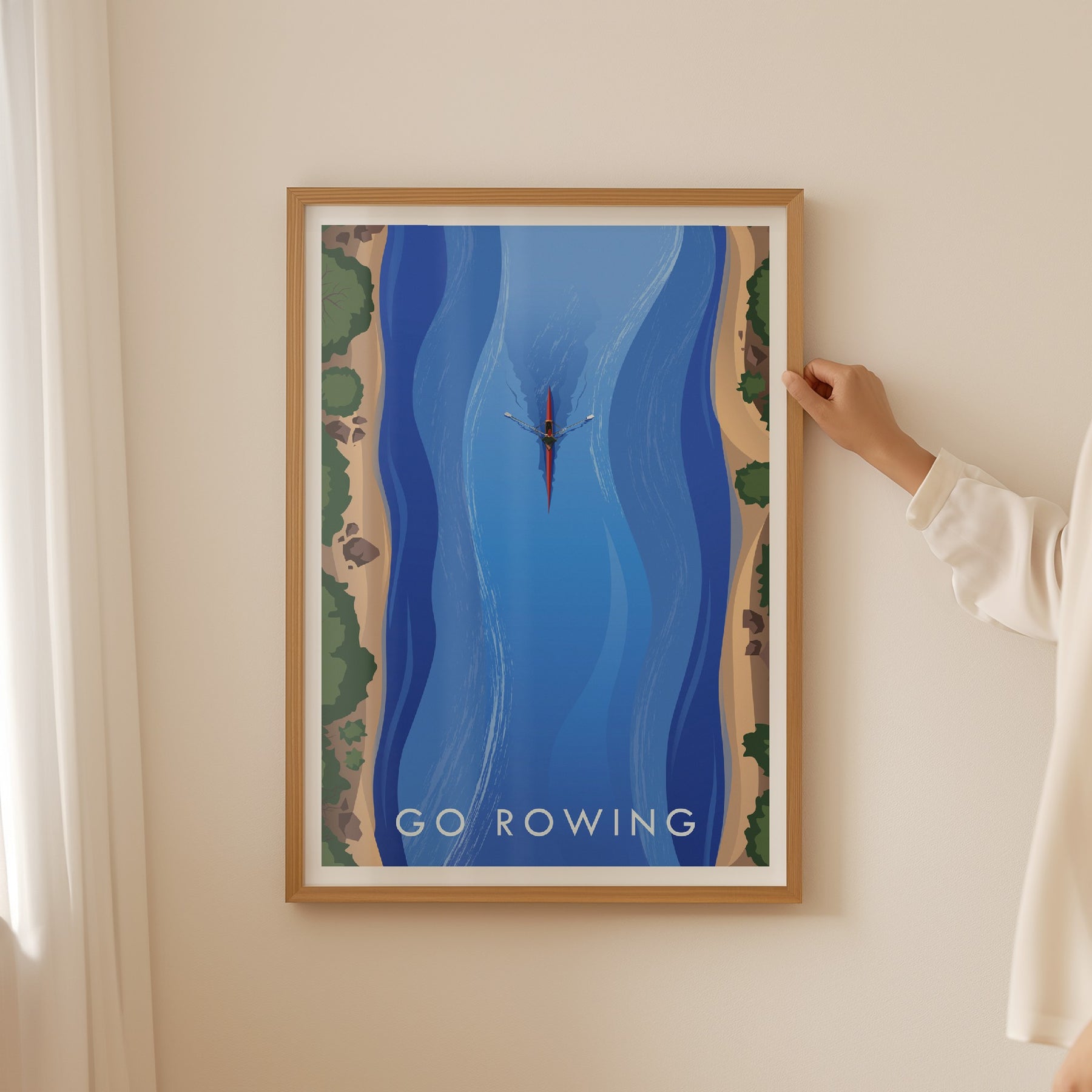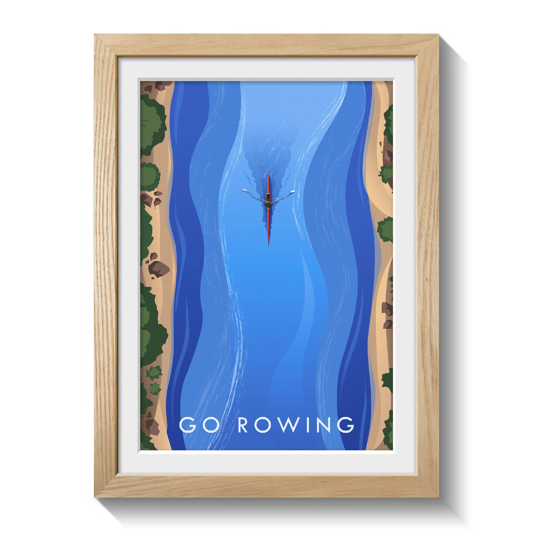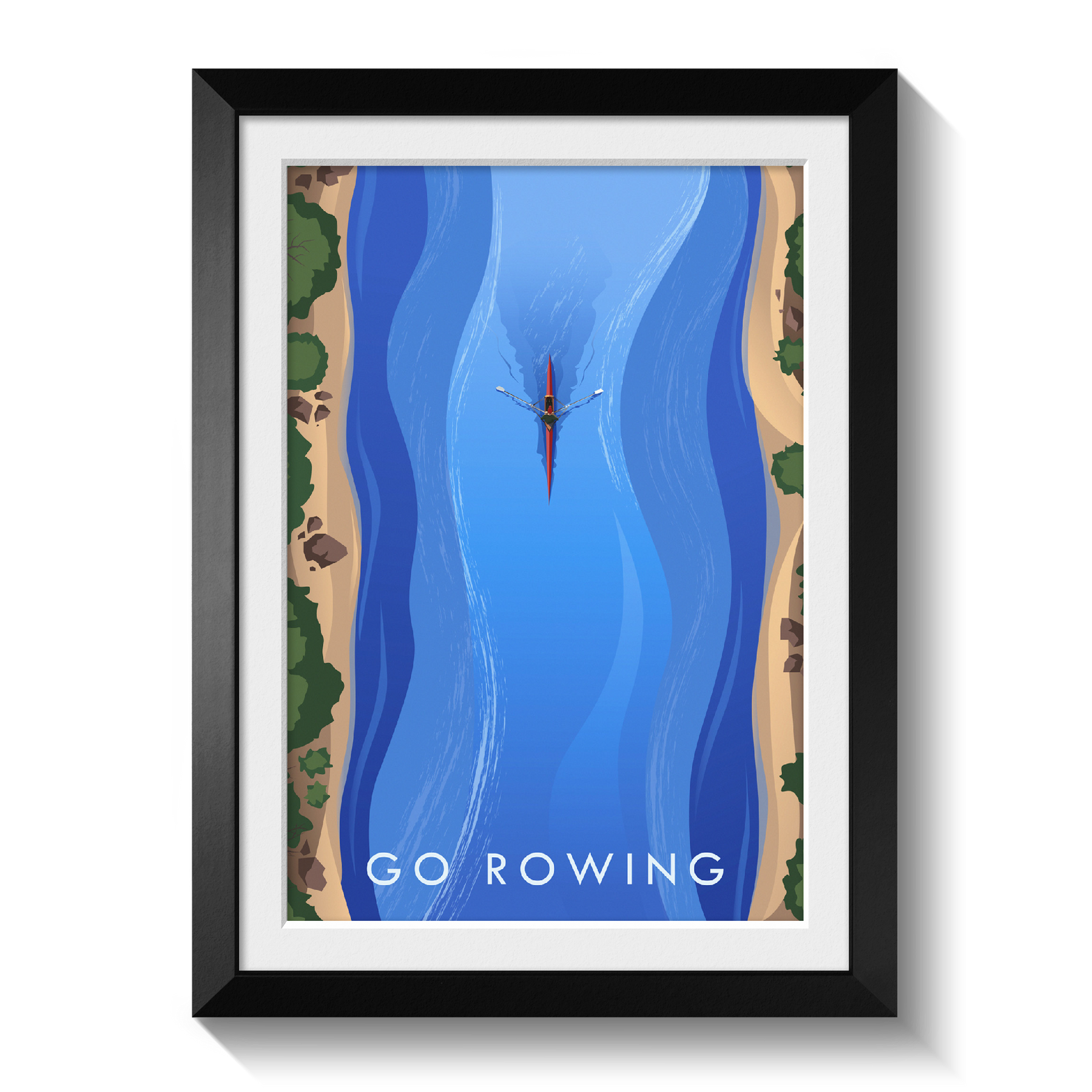 This is an original travel poster celebrating the popular outdoor water sport of Rowing. Competitive rowing was made popular in the 17th century and was is one of the oldest recorded sports to take place as part of the Olympics.