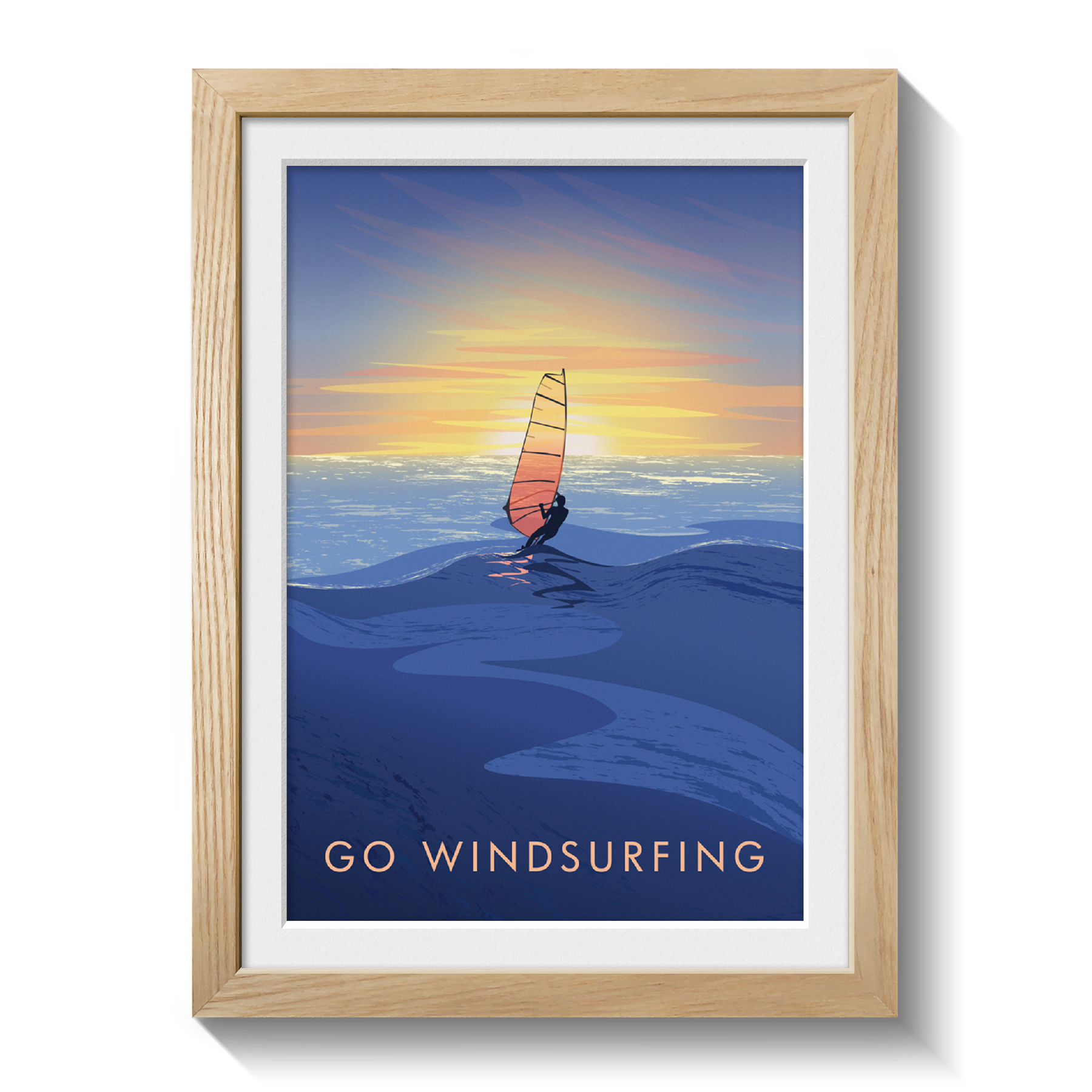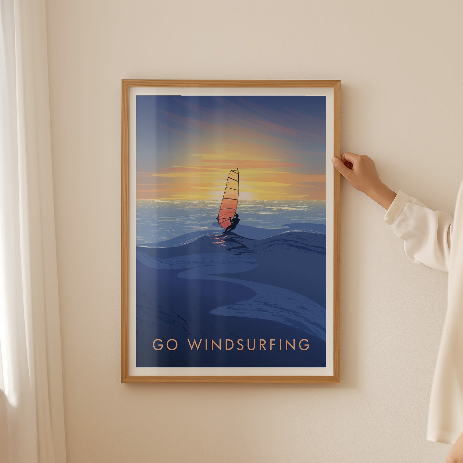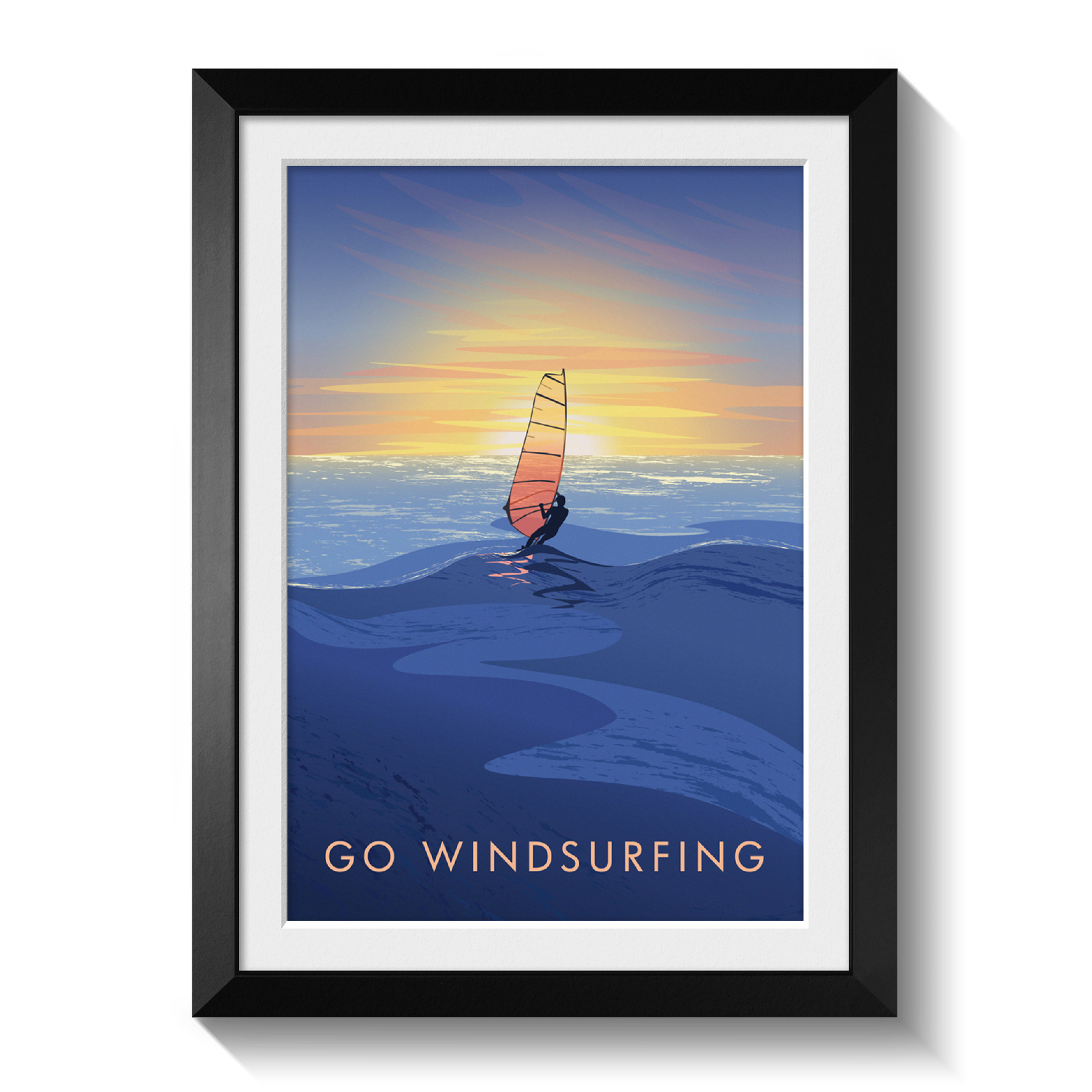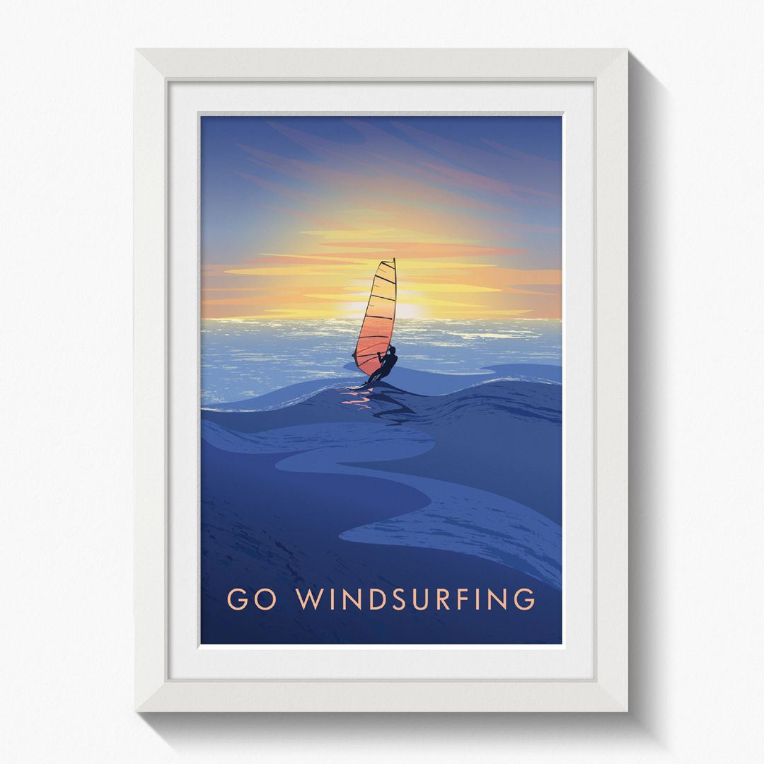 This is an original travel poster celebrating the exciting pursuit of windsurfing. A perfect gift for the windsurfer in your life and a great way to celebrate your love of the water and the great outdoors.