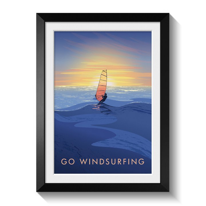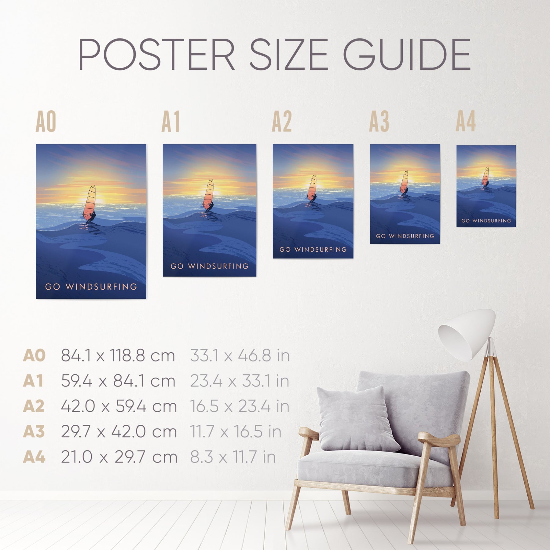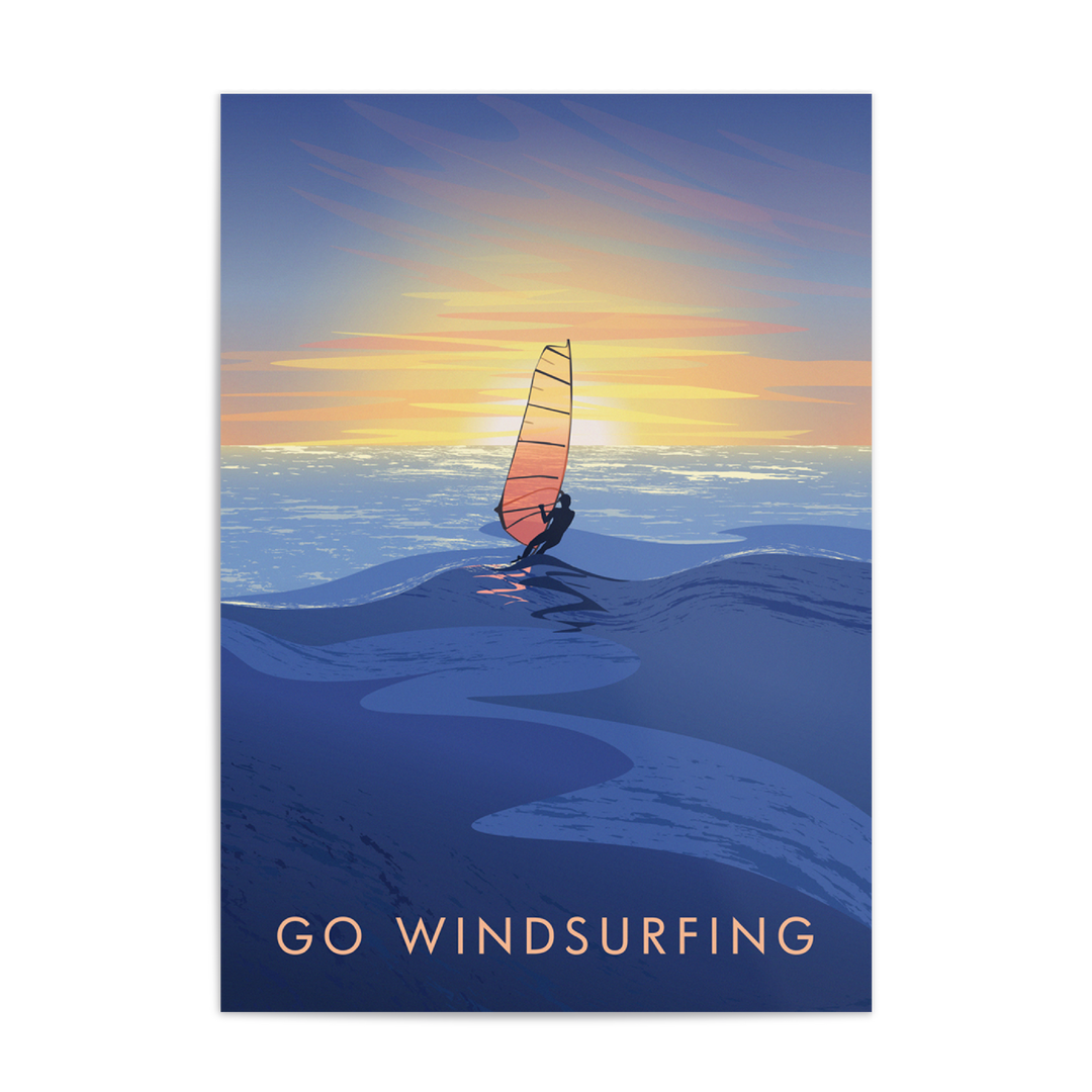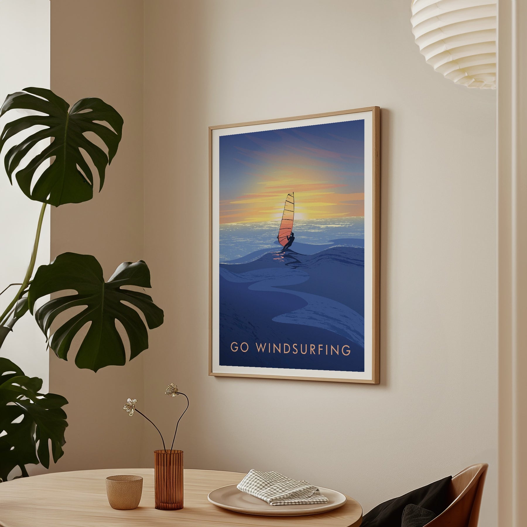 This is an original travel poster celebrating the exciting pursuit of windsurfing. A perfect gift for the windsurfer in your life and a great way to celebrate your love of the water and the great outdoors.