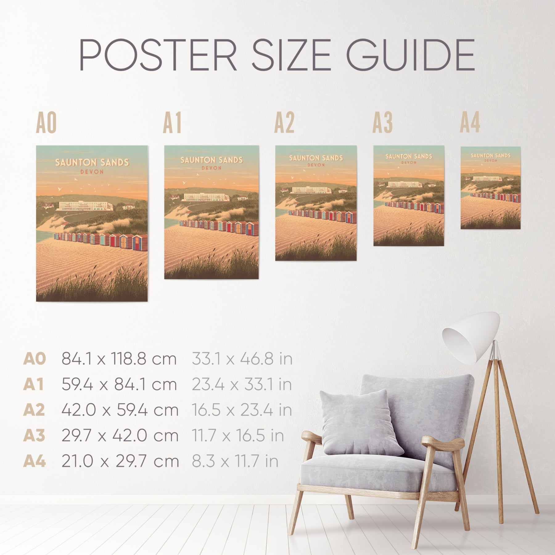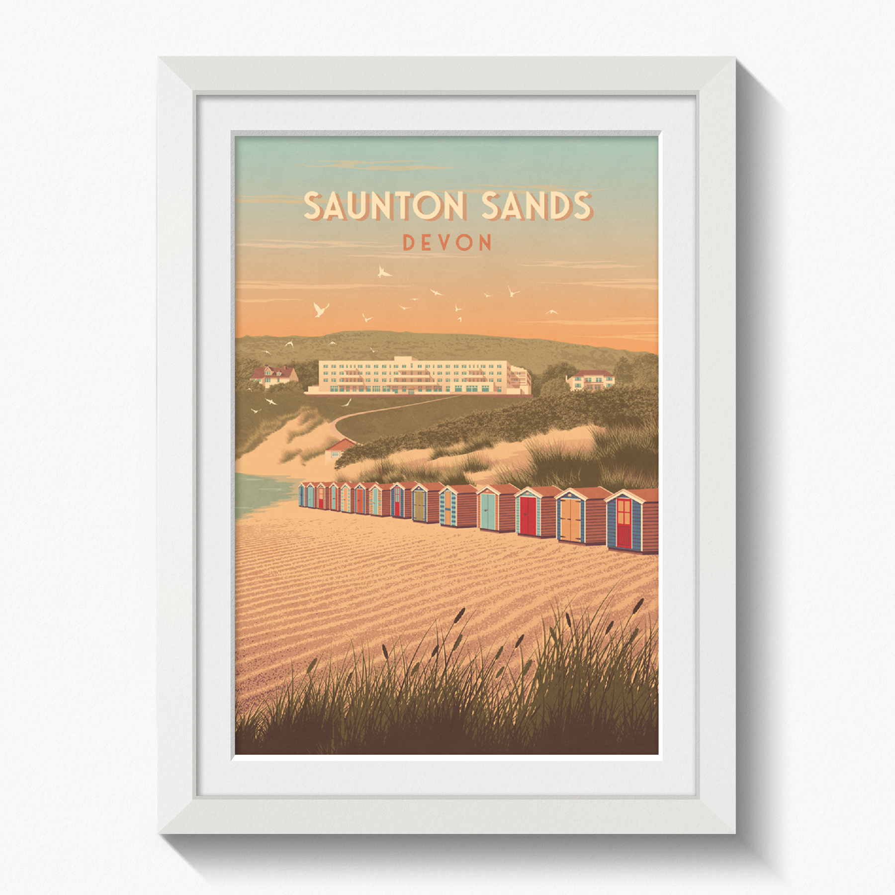 Original travel poster of Saunton Sands, situated in the North Devon Area of Outstanding Natural Beauty. This poster features the striking Saunton Sands Hotel in the distance, along with colourful beach huts lining the edge of the beach.