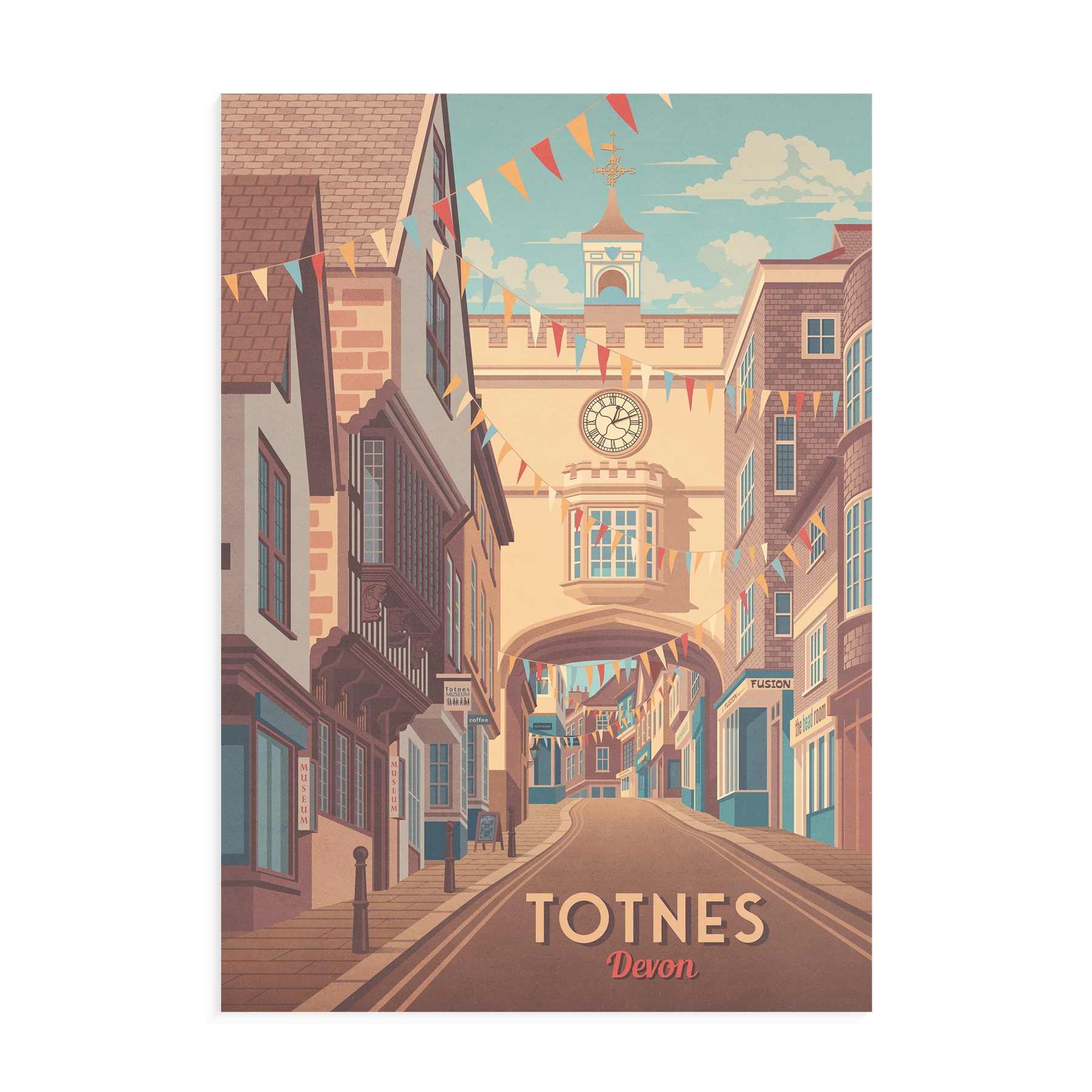 This Totnes travel poster showcases the charm of the historic Devon market town, set on the River Dart. Perfect for heritage lovers and travellers, it highlights Totnes’ blend of medieval streets, independent spirit, and scenic surroundings. A stylish decor piece celebrating the unique character of Totnes in South Devon.