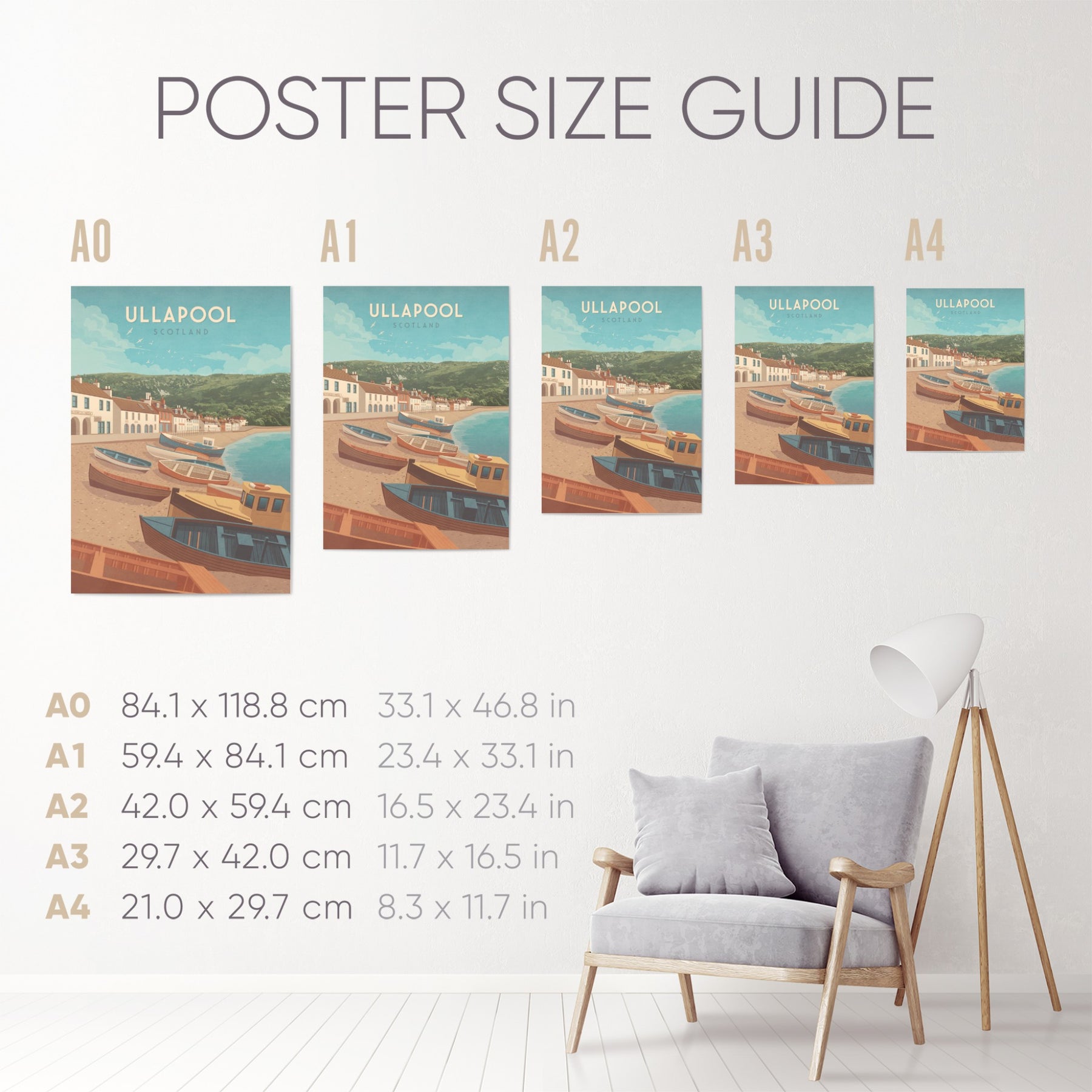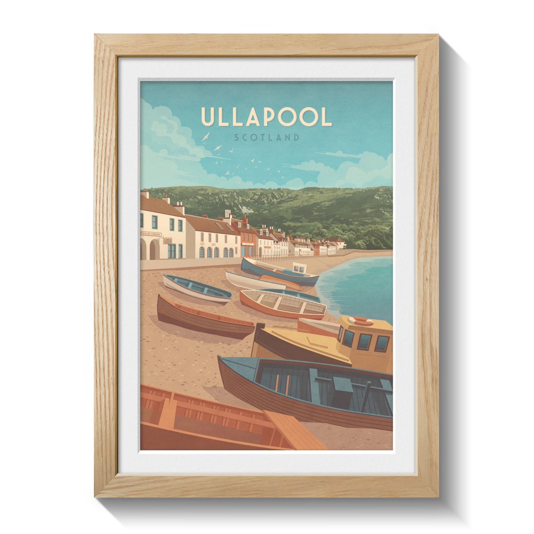 This Ullapool travel poster captures the peaceful charm of the Scottish Highlands, featuring the seafront and boats tied up along the shore. Perfect for lovers of coastal scenery and quiet getaways, it celebrates Ullapool’s natural beauty and maritime character. A stylish decor piece showcasing this picturesque village on Loch Broom.