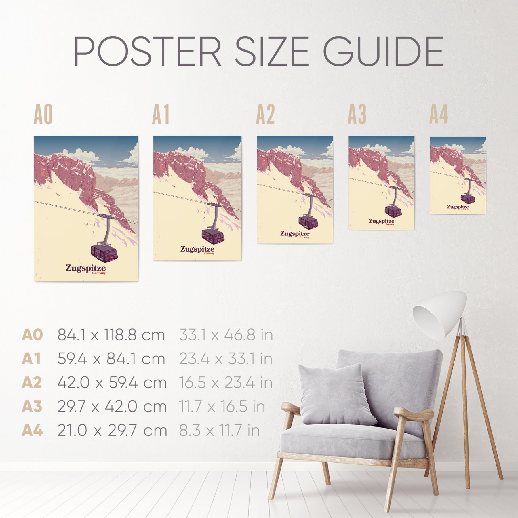 An original travel poster featuring Germany's tallest mountain and popular ski area, Zugspitze.