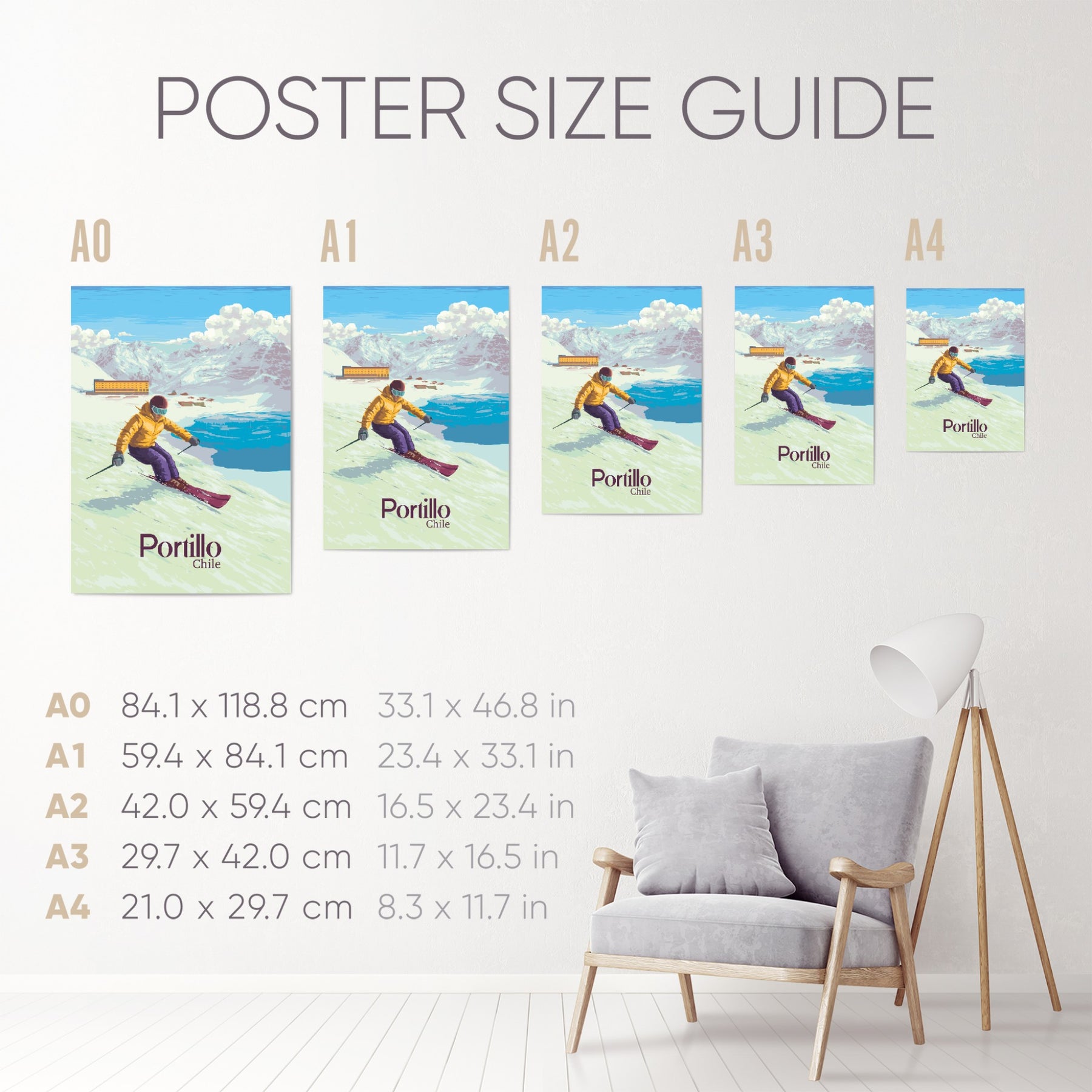 An original skiing print featuring the popular resort of Portillo in South America, located in the Andes mountains of Chile, in the Valparaíso Region.