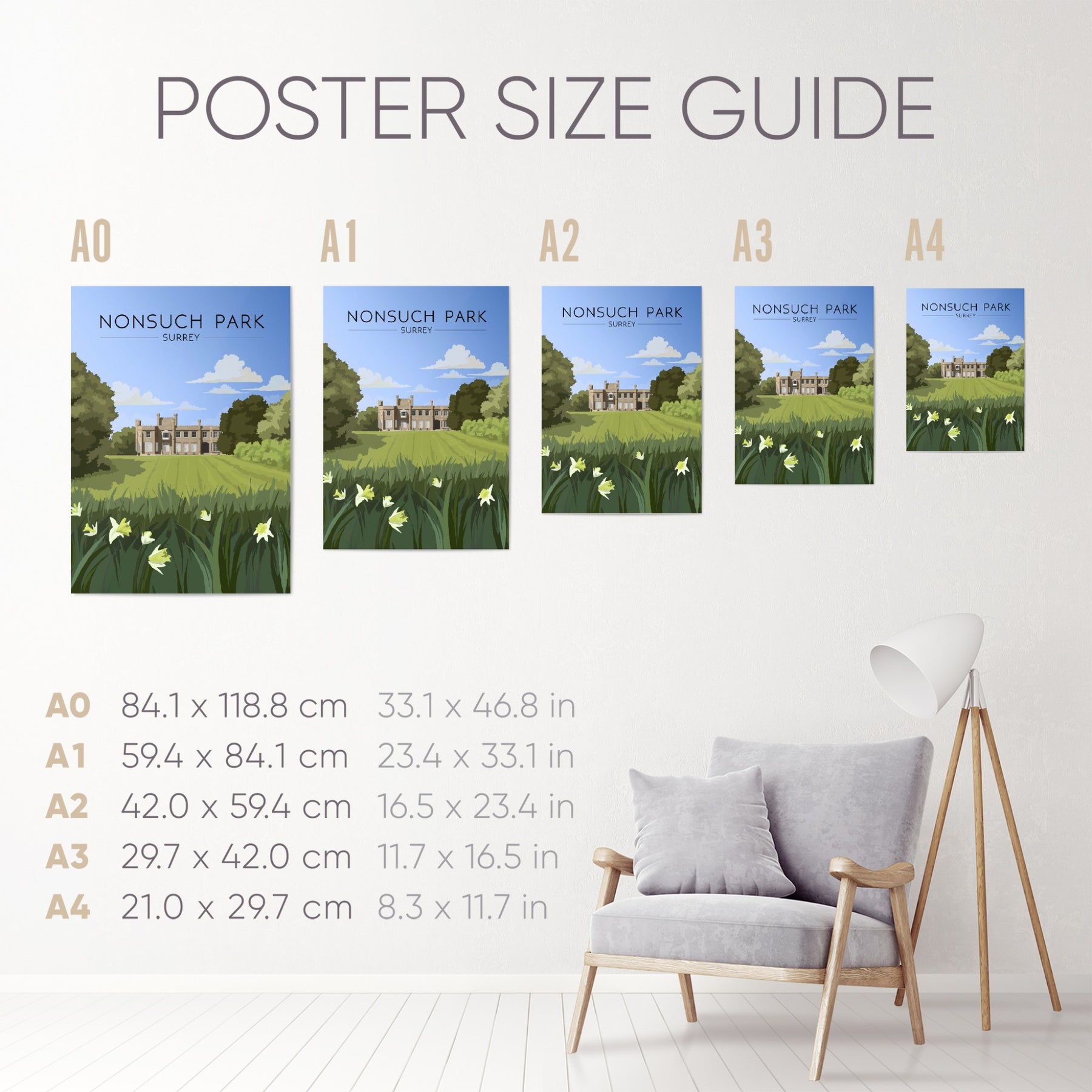 An original travel poster featuring the much loved Nonsuch Park and Nonsuch Mansion in Surrey, in between Stoneleigh, Cheam, and Ewell.