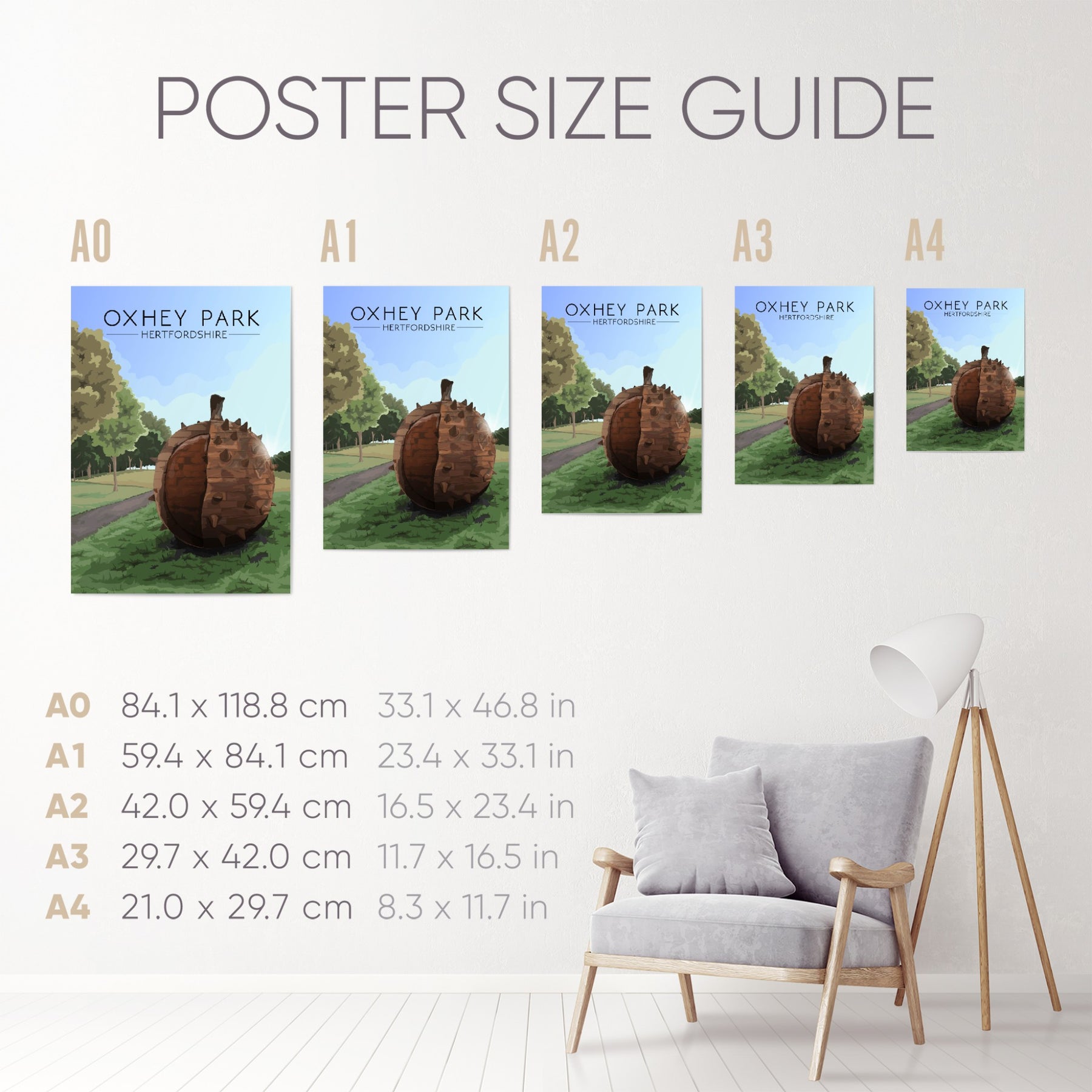 An original travel poster featuring the much loved Oxhey Park, situated close to Watford and Bushey in Hertfordshire. The print features a view of the large wooden 'conker' sculpture which has become a focal point of the park in recent years.