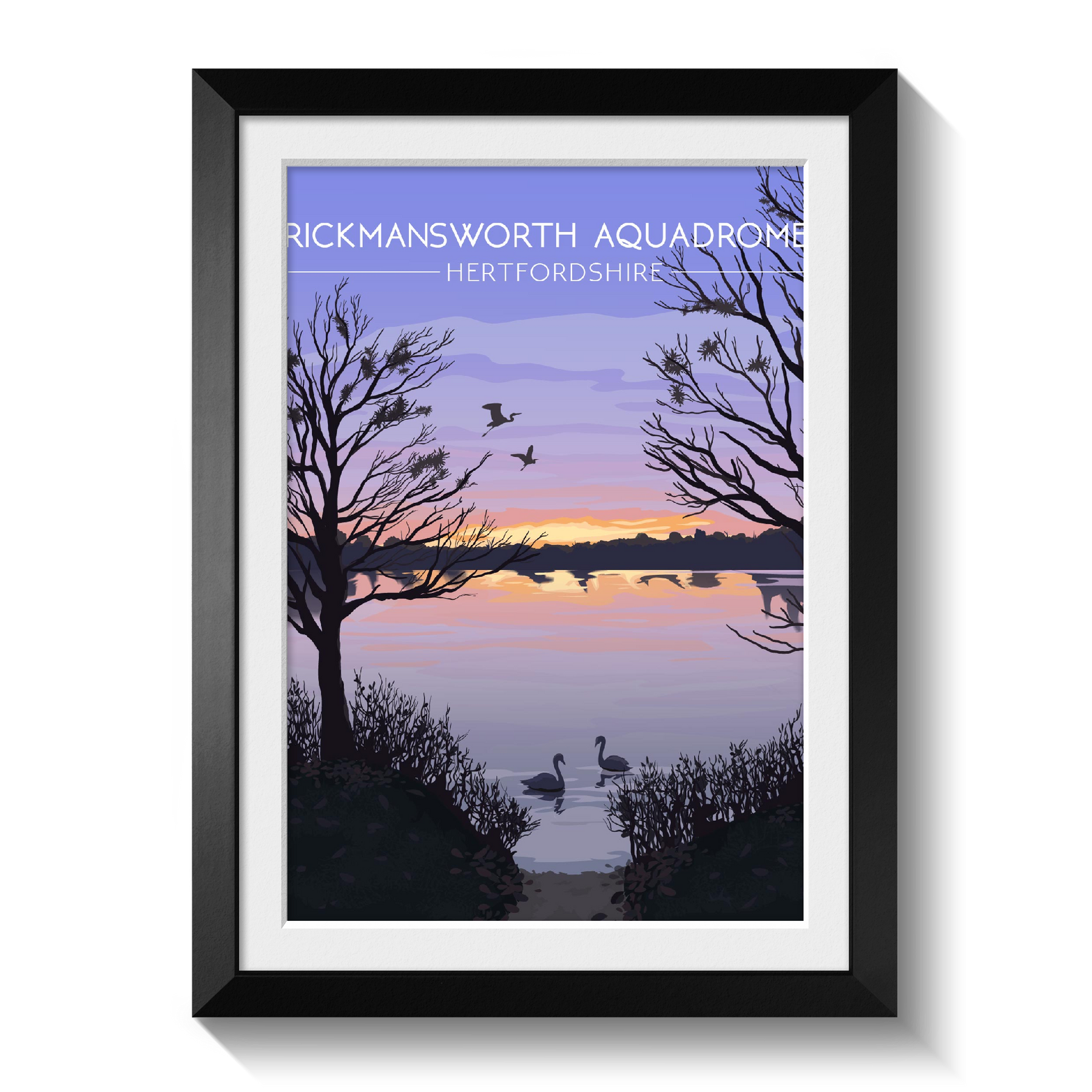 An original print featuring Rickmansworth Aquadrome in Hertfordshire. The Aquadrome is a nature reserve made up of two lakes Bury Lake and Batchworth Lake, which were created by the extraction of gravel for the construction of the original Wembley Stadium.