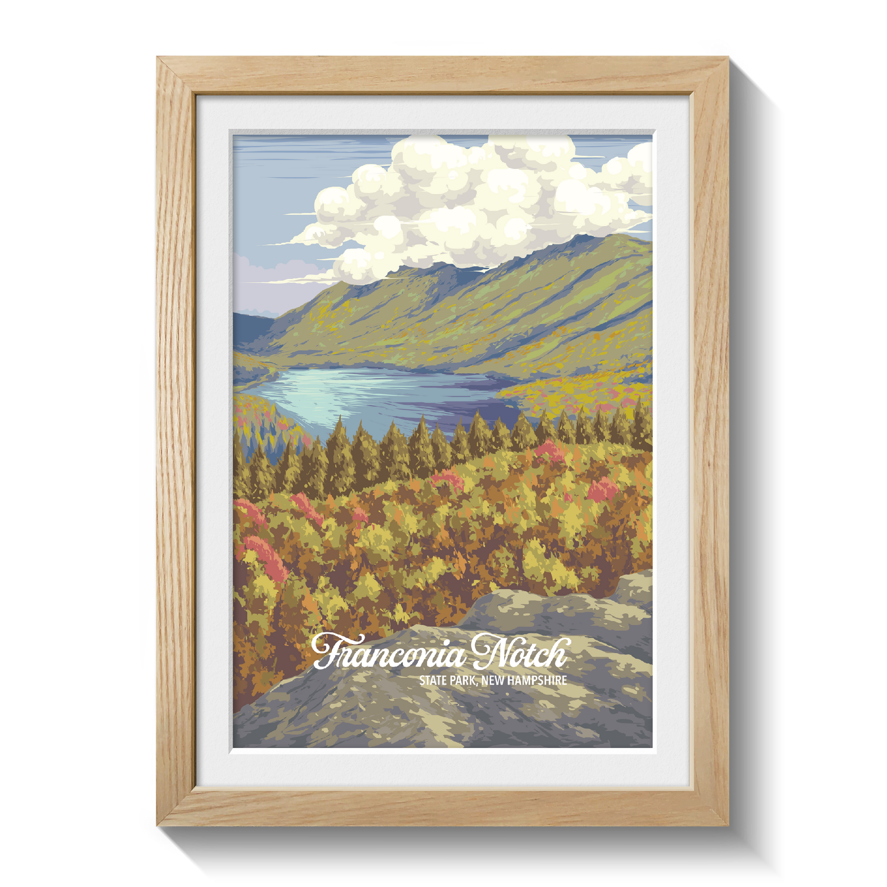 This Franconia Notch State Park travel poster captures the vibrant autumn colors of New Hampshire’s iconic destination. Featuring the stunning fall foliage of Franconia Notch, it’s perfect for nature lovers and outdoor enthusiasts. A beautiful addition to your decor, celebrating the seasonal charm of New England’s breathtaking landscapes.