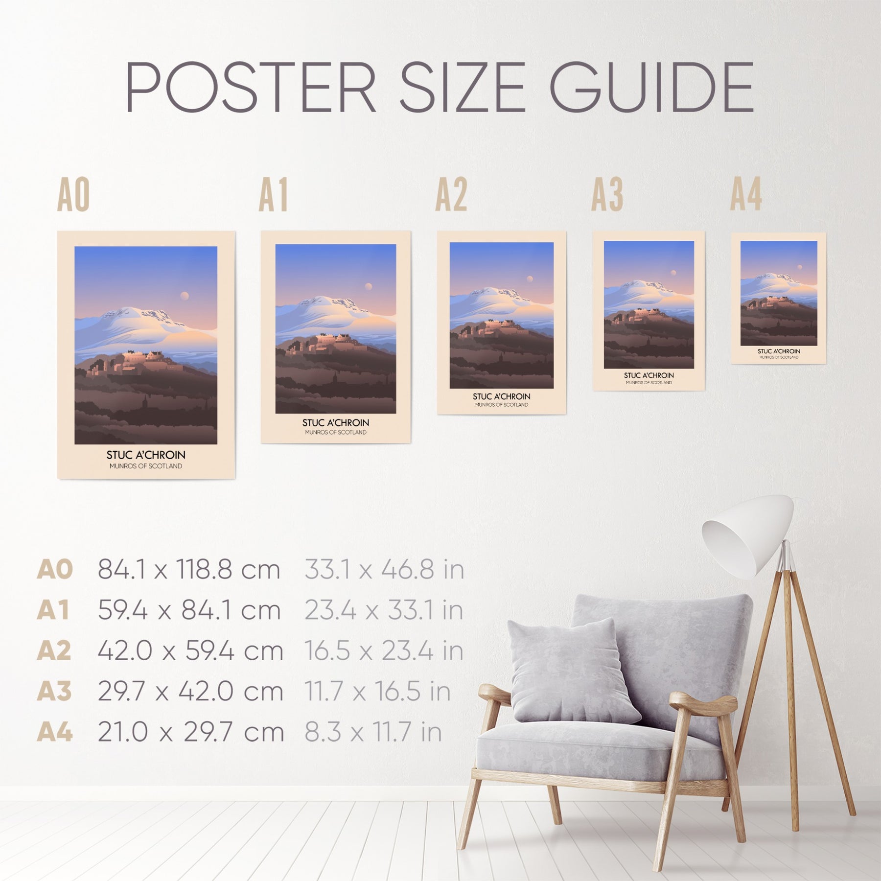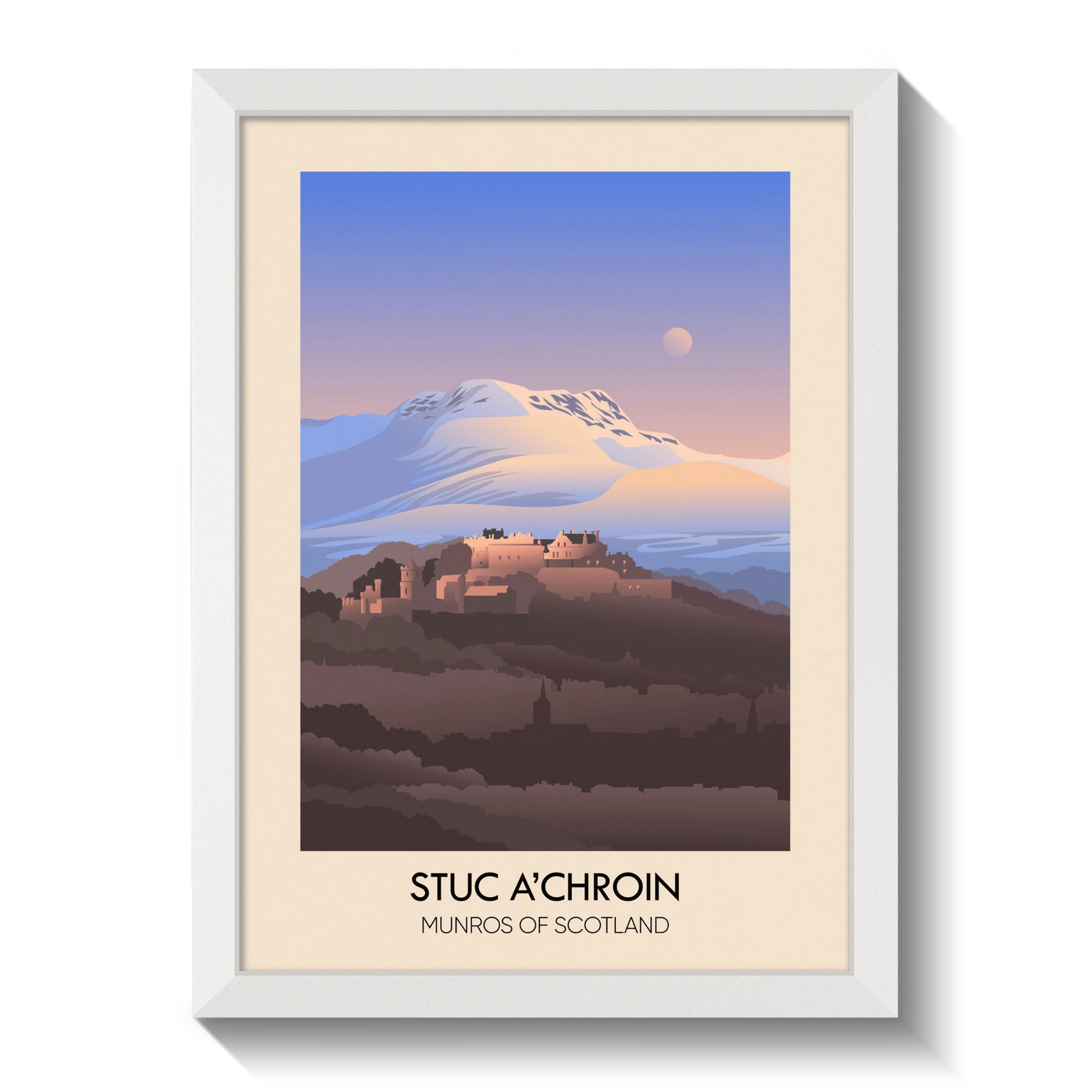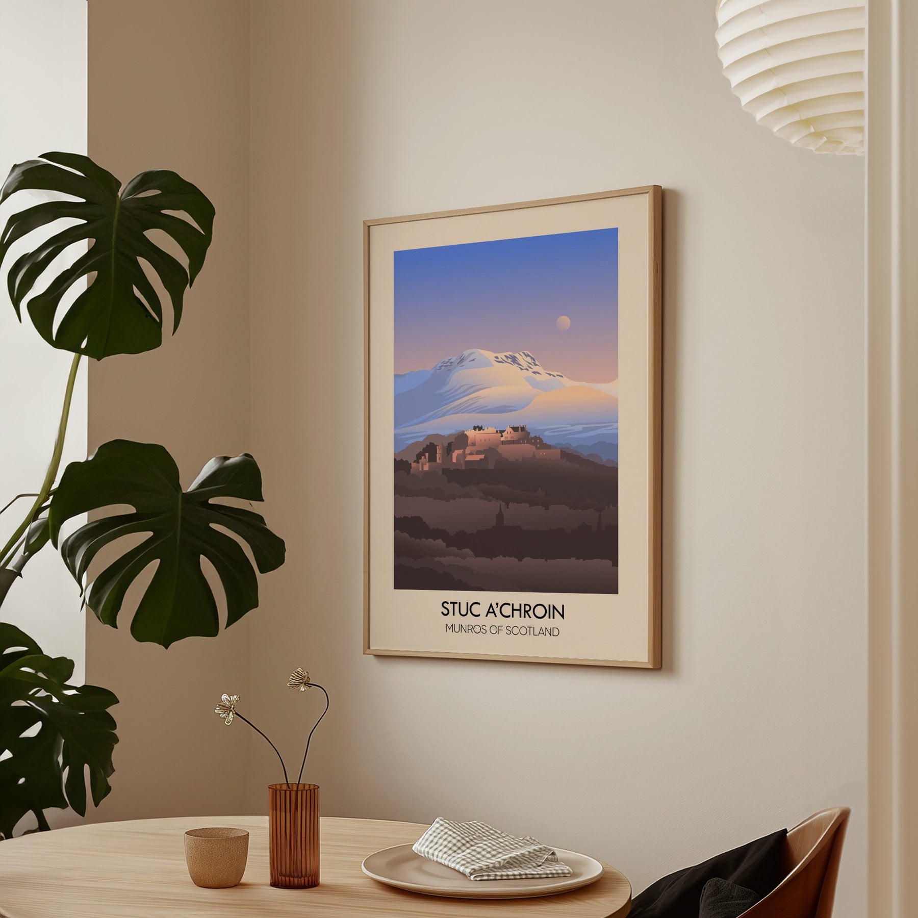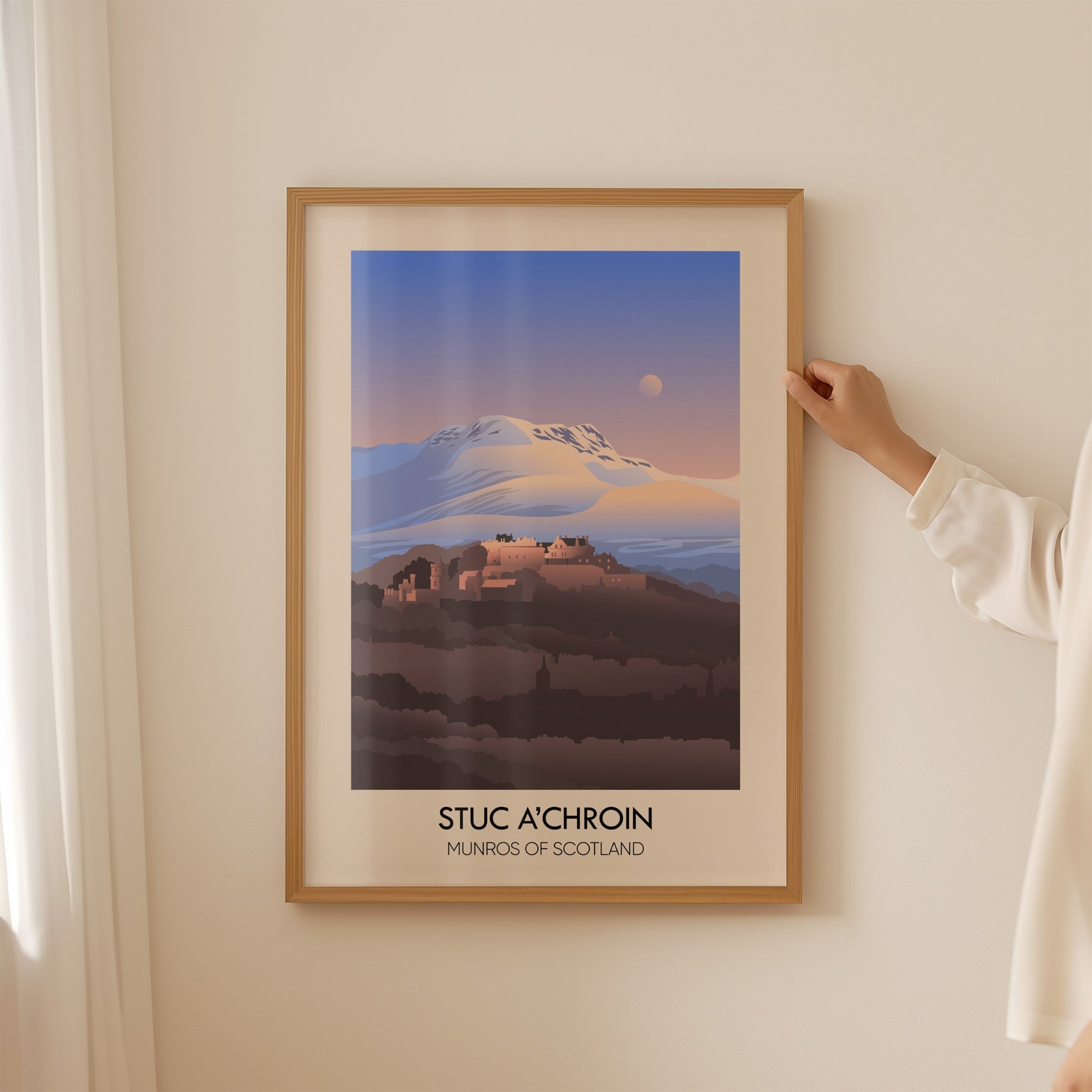 This Stuc a’ Chroin travel poster captures the rugged beauty of one of Scotland’s iconic Munros. Perfect for hikers and mountain lovers, it showcases the dramatic landscapes of the Southern Highlands. A stylish decor piece celebrating the wild charm and adventure of climbing Stuc a’ Chroin in the Scottish wilderness.