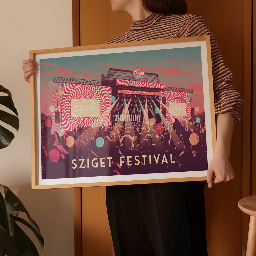 This Sziget Festival poster captures the vibrant energy of one of Europe’s biggest music festivals, held in Budapest, Hungary. Perfect for music lovers and festival fans, it celebrates the colourful atmosphere and unforgettable performances. A bold decor piece, showcasing the spirit of Sziget and its iconic island setting on the Danube.