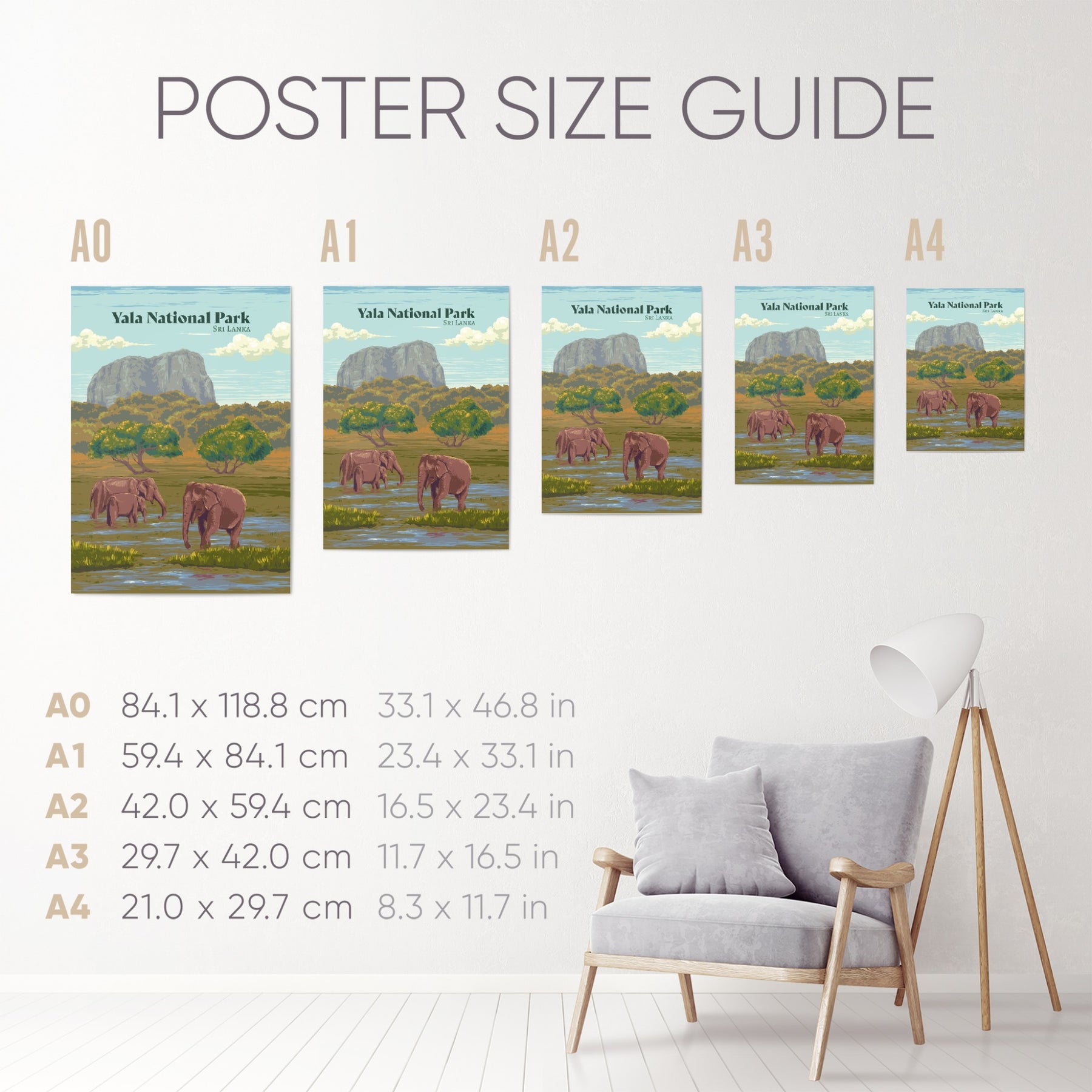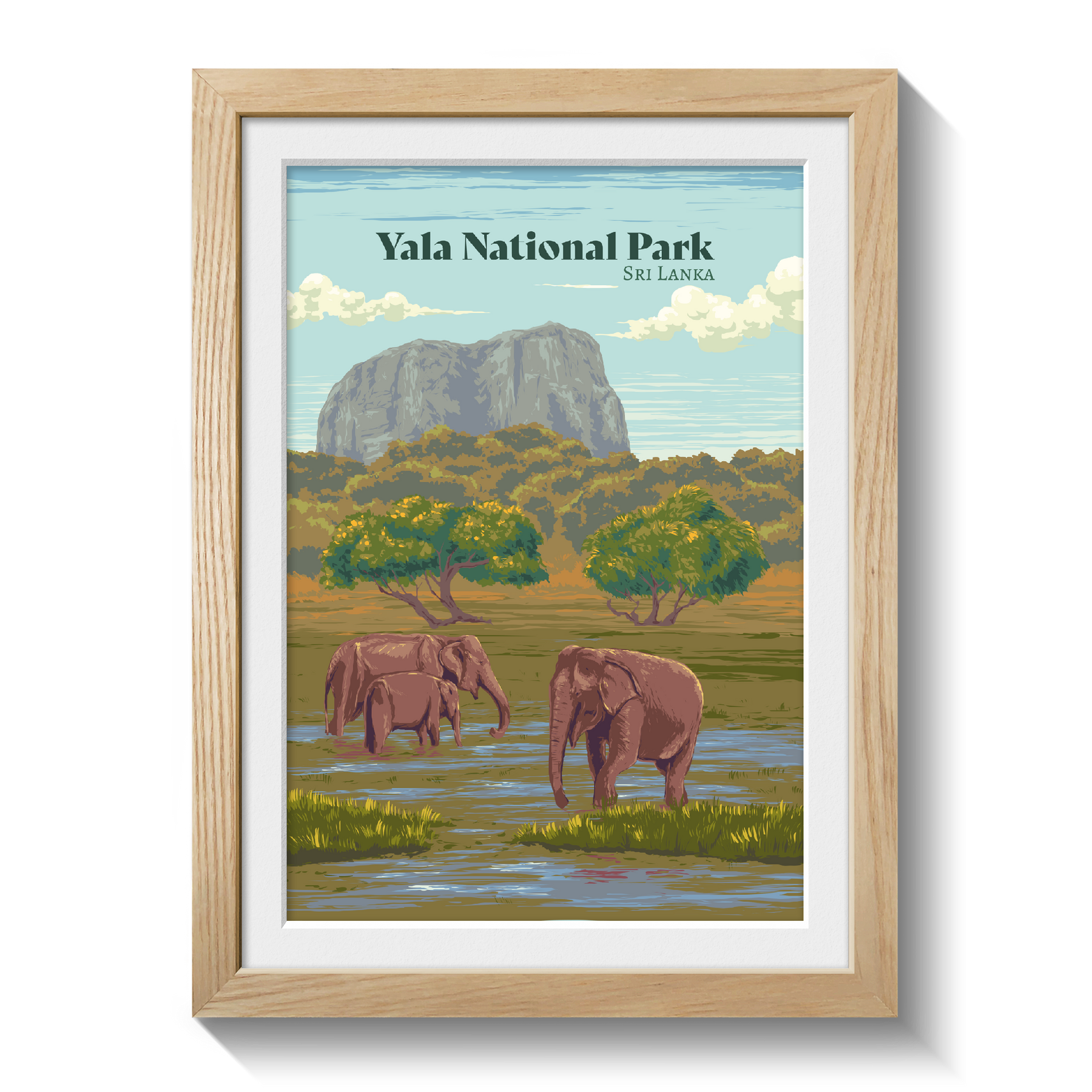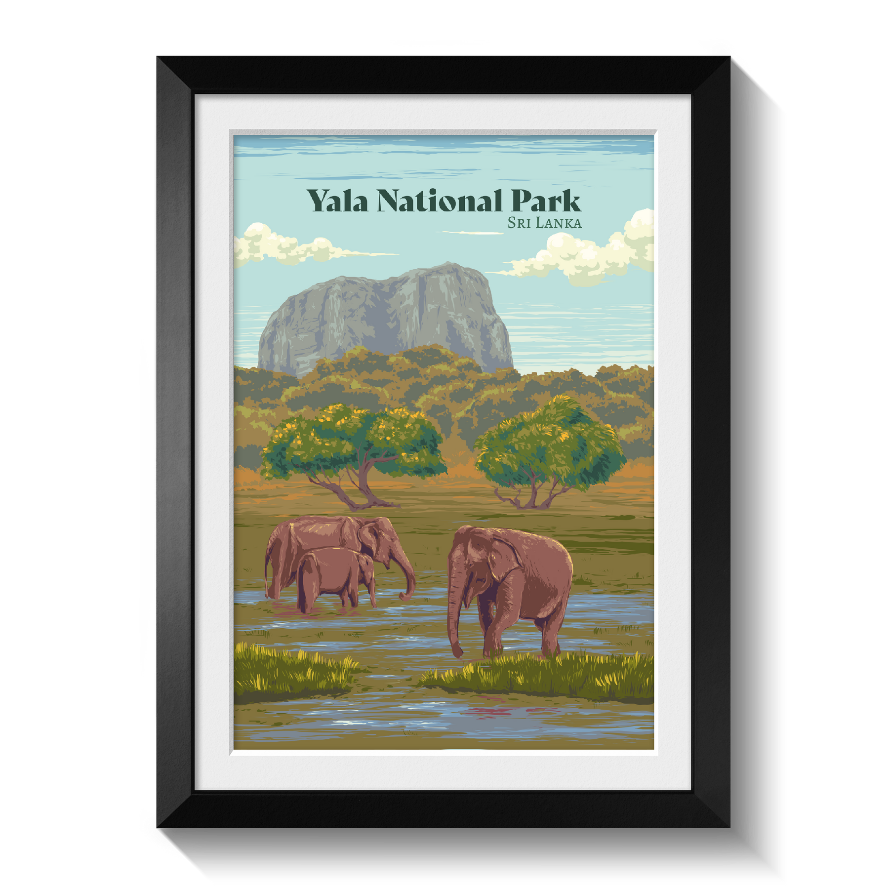 This is an original travel poster featuring Sri Lanka's Yala National Park, Famous for its conservation of Sri Lankan elephants and leopards. Yala is the second largest national park in Sri Lanka, and the most visited.