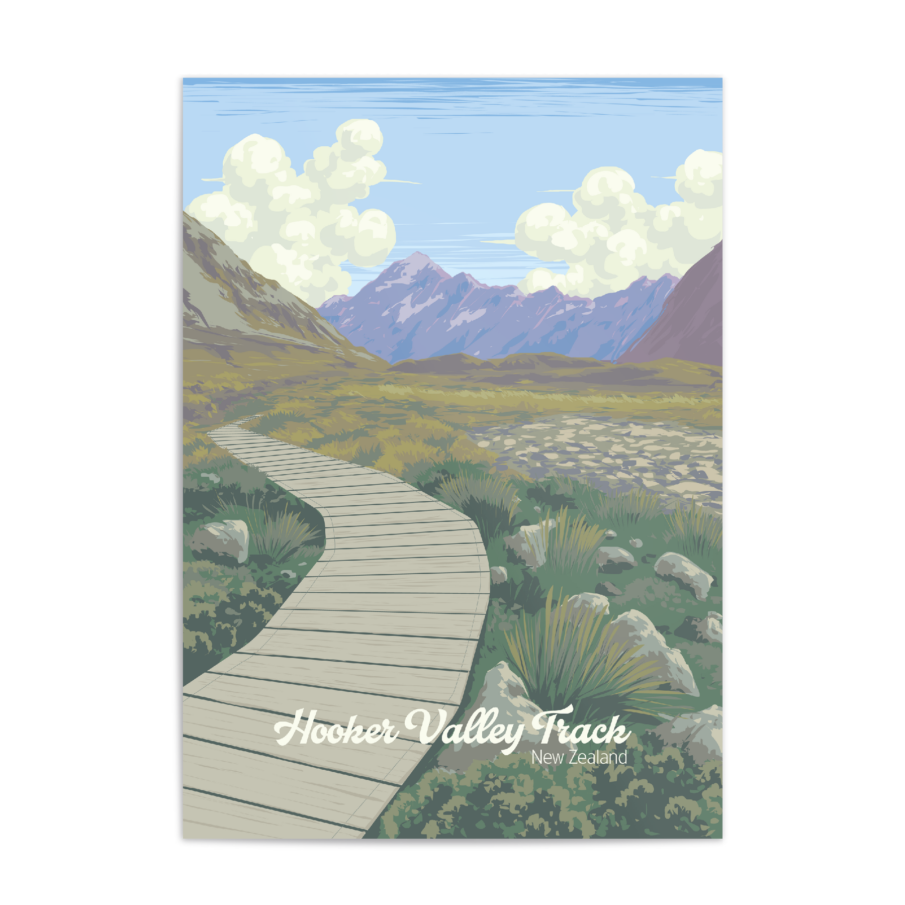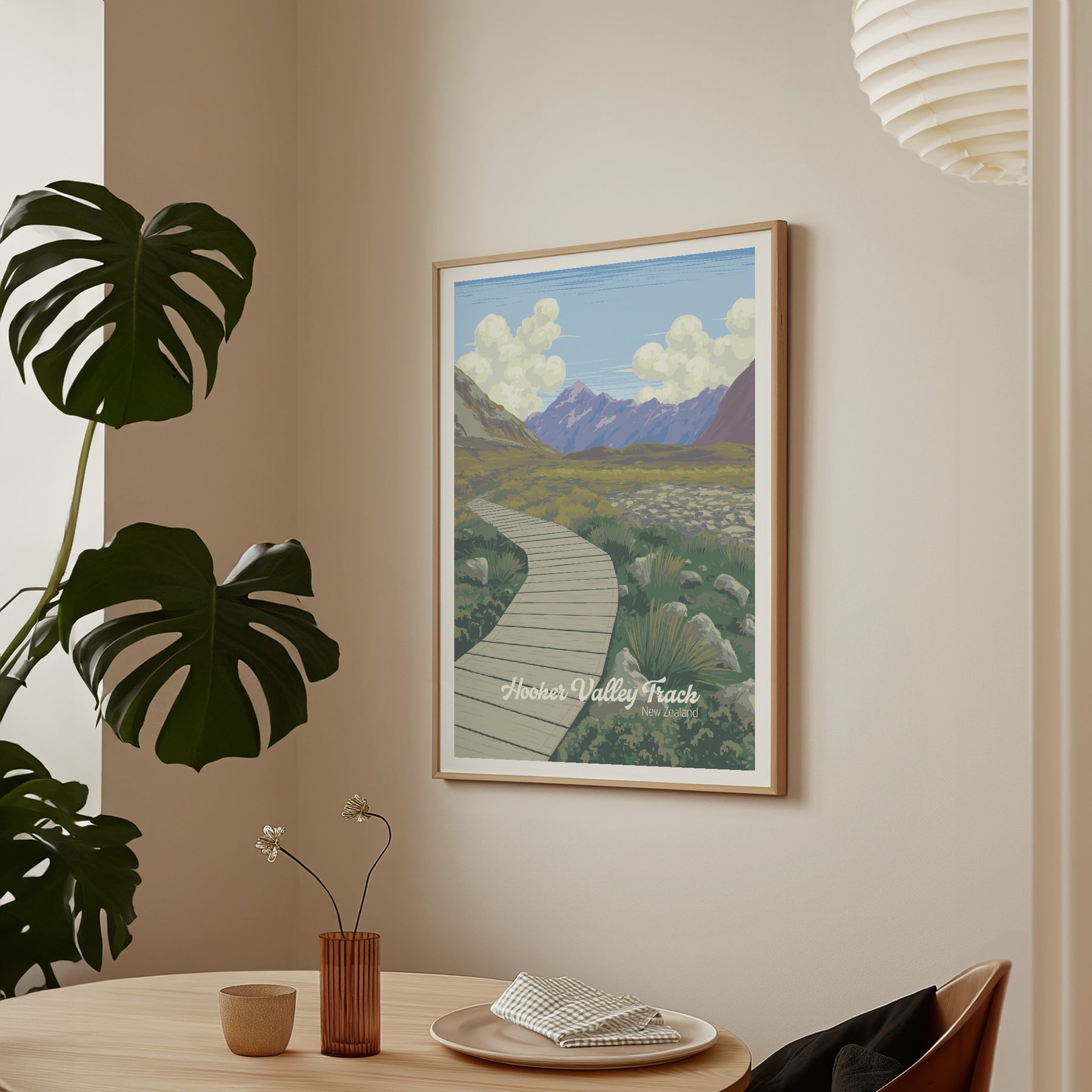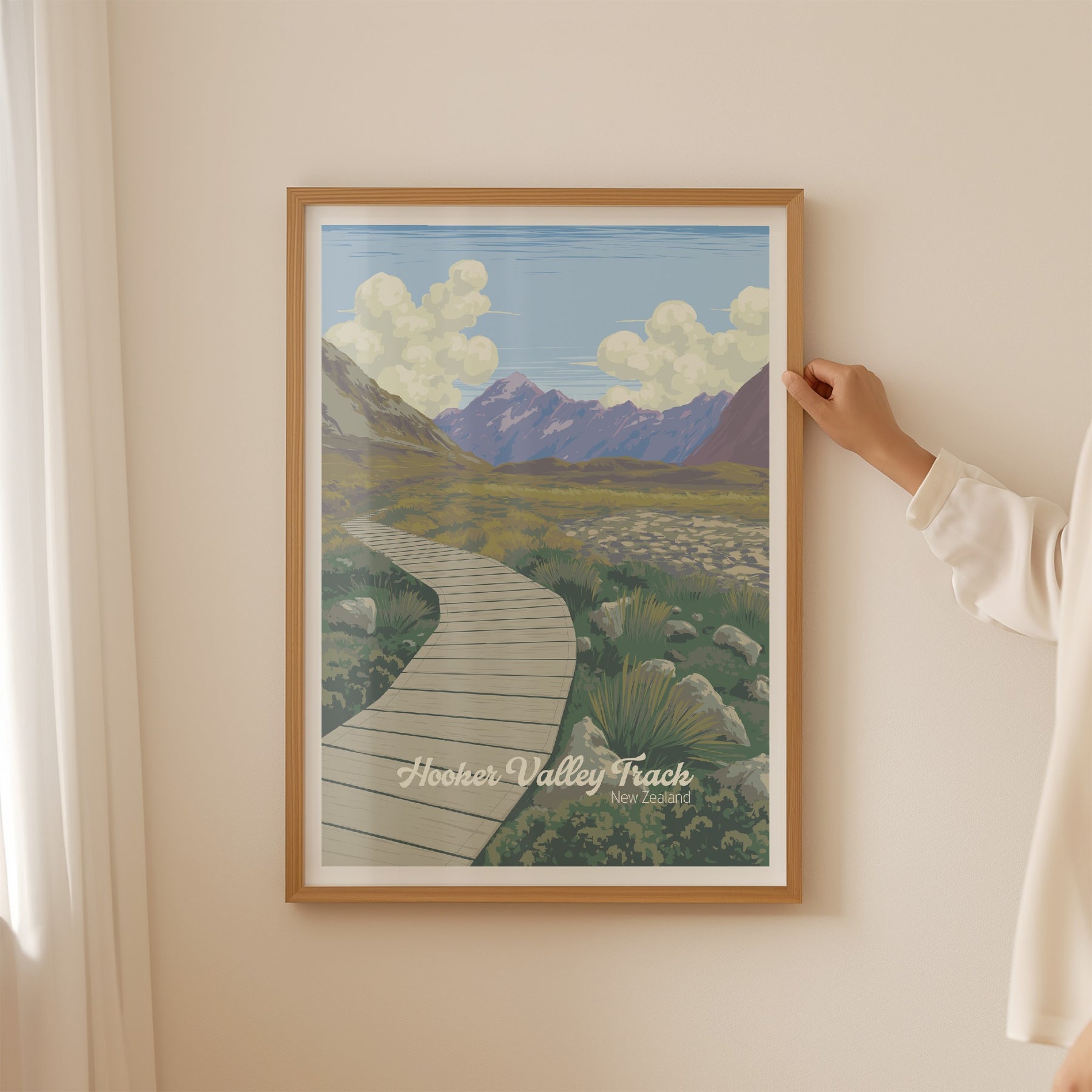 This Hooker Valley Track travel poster showcases New Zealand’s iconic hiking route with a minimalist design, capturing the stunning alpine scenery and majestic peaks. Perfect for outdoor enthusiasts and travelers, it brings the beauty of Aoraki/Mount Cook National Park into your space. A must-have for fans of New Zealand’s landscapes.