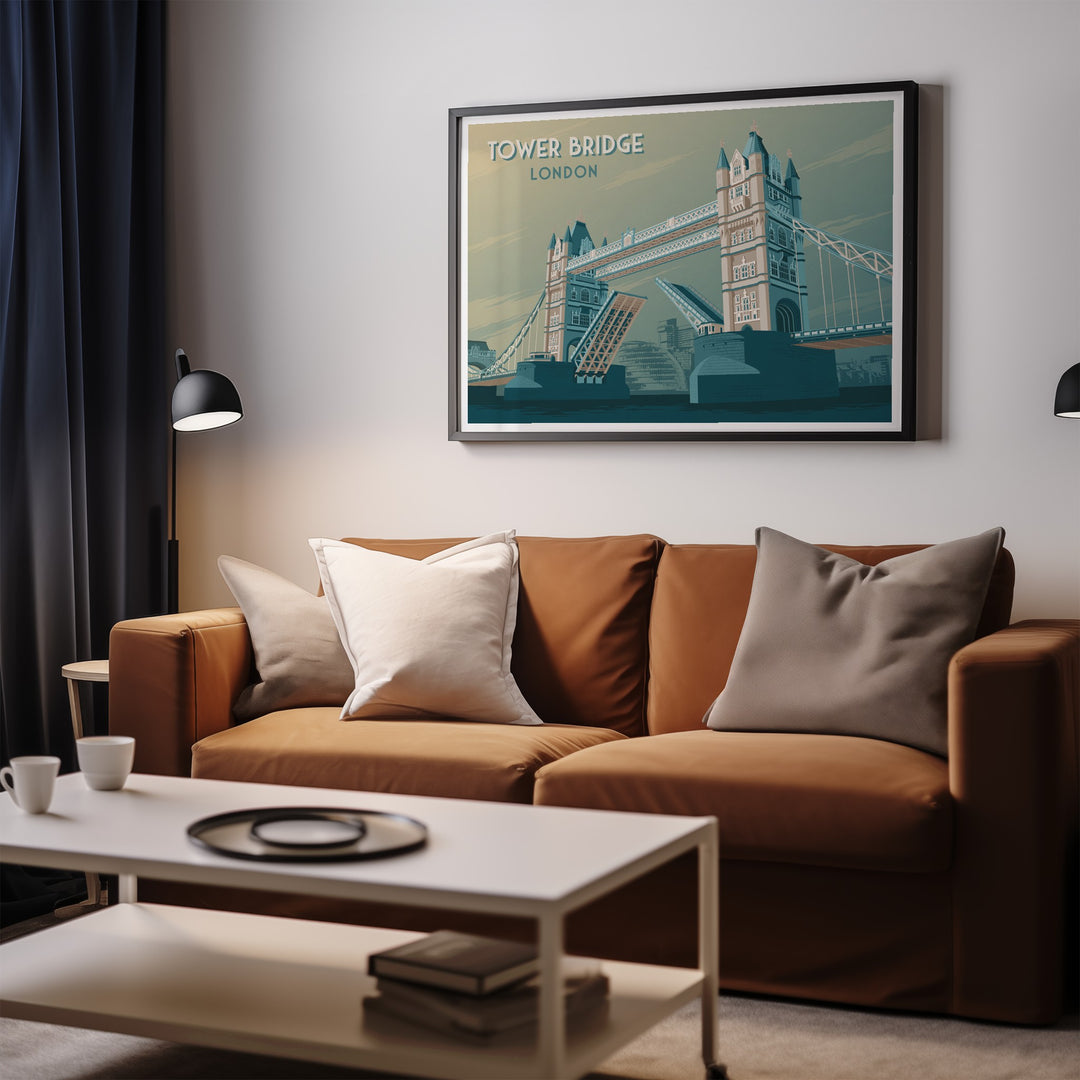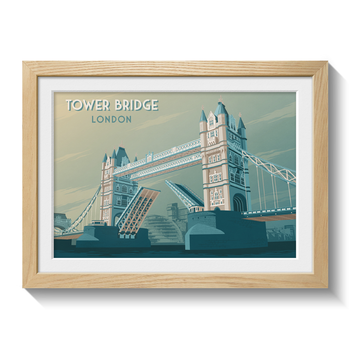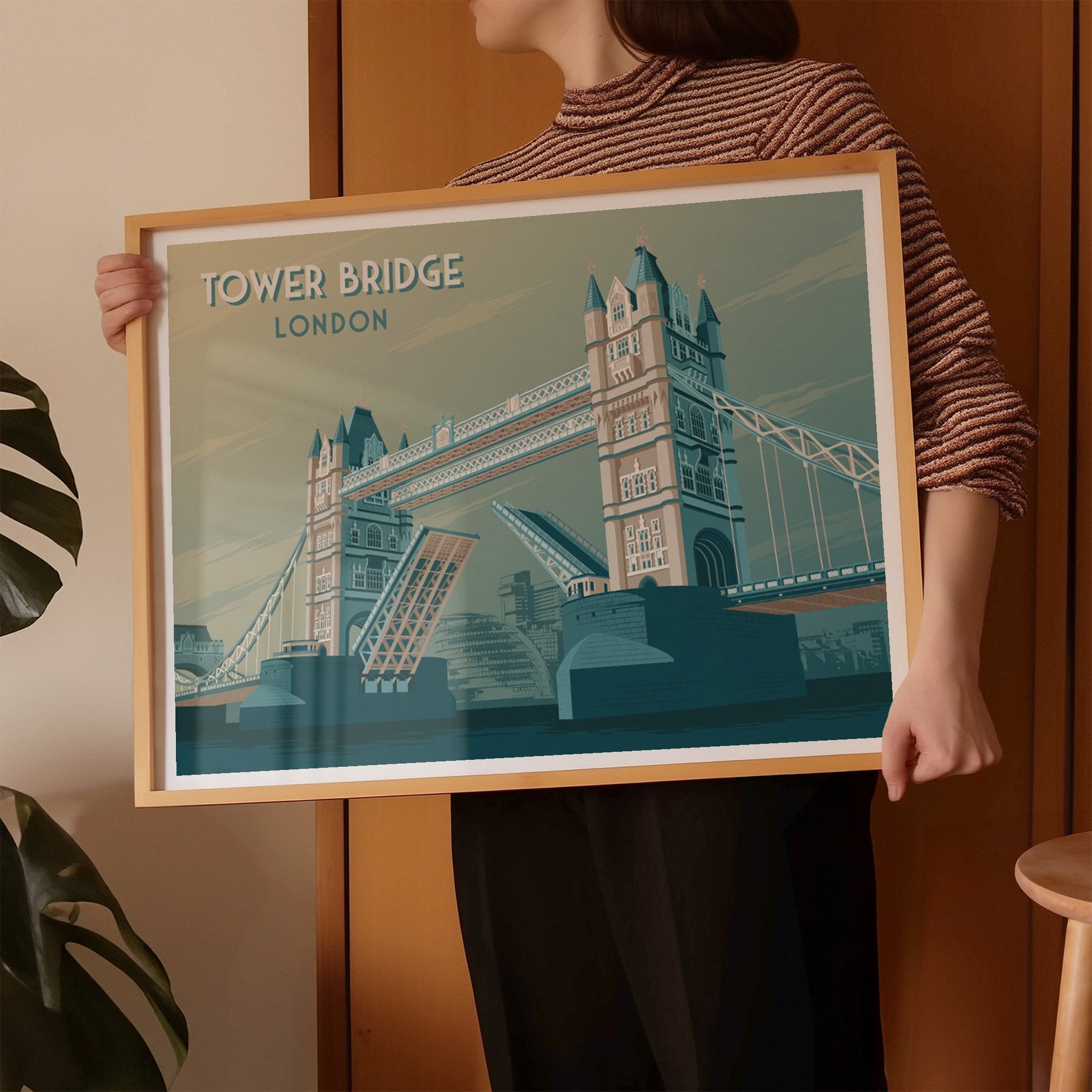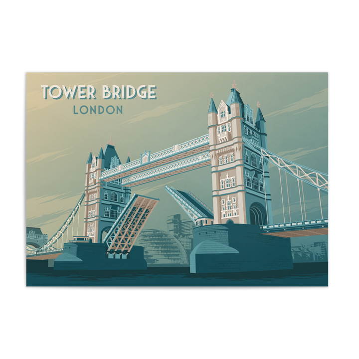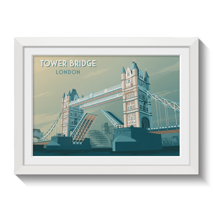 This vintage style travel poster features London's majestic Tower Bridge standing proudly over the River Thames.