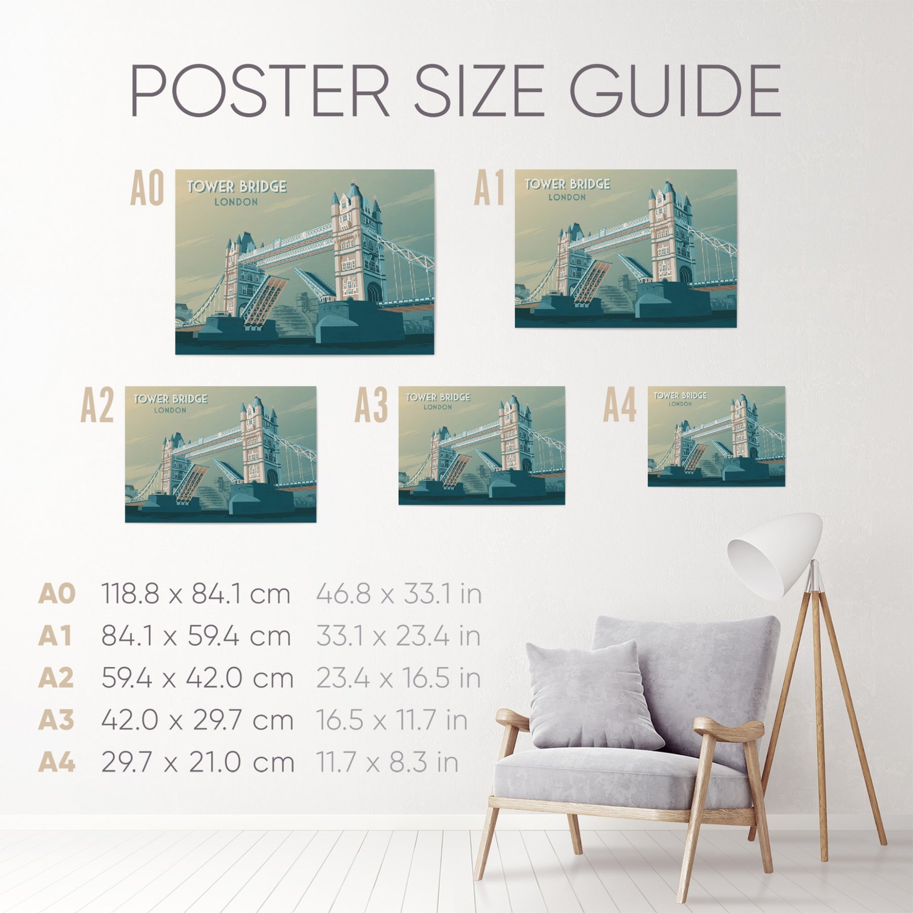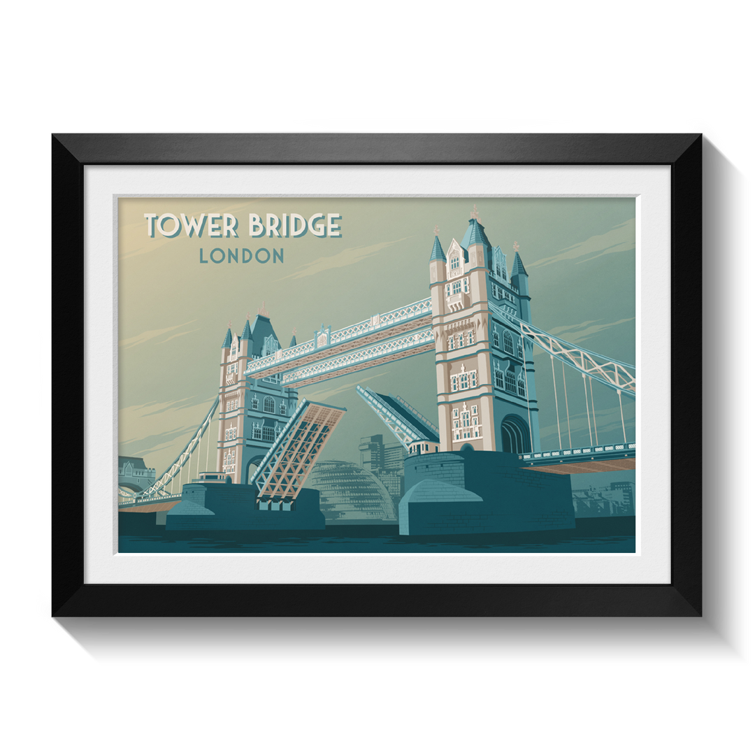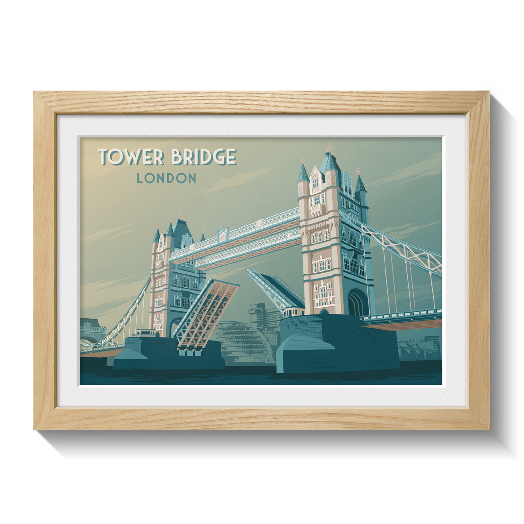 This vintage style travel poster features London's majestic Tower Bridge standing proudly over the River Thames.