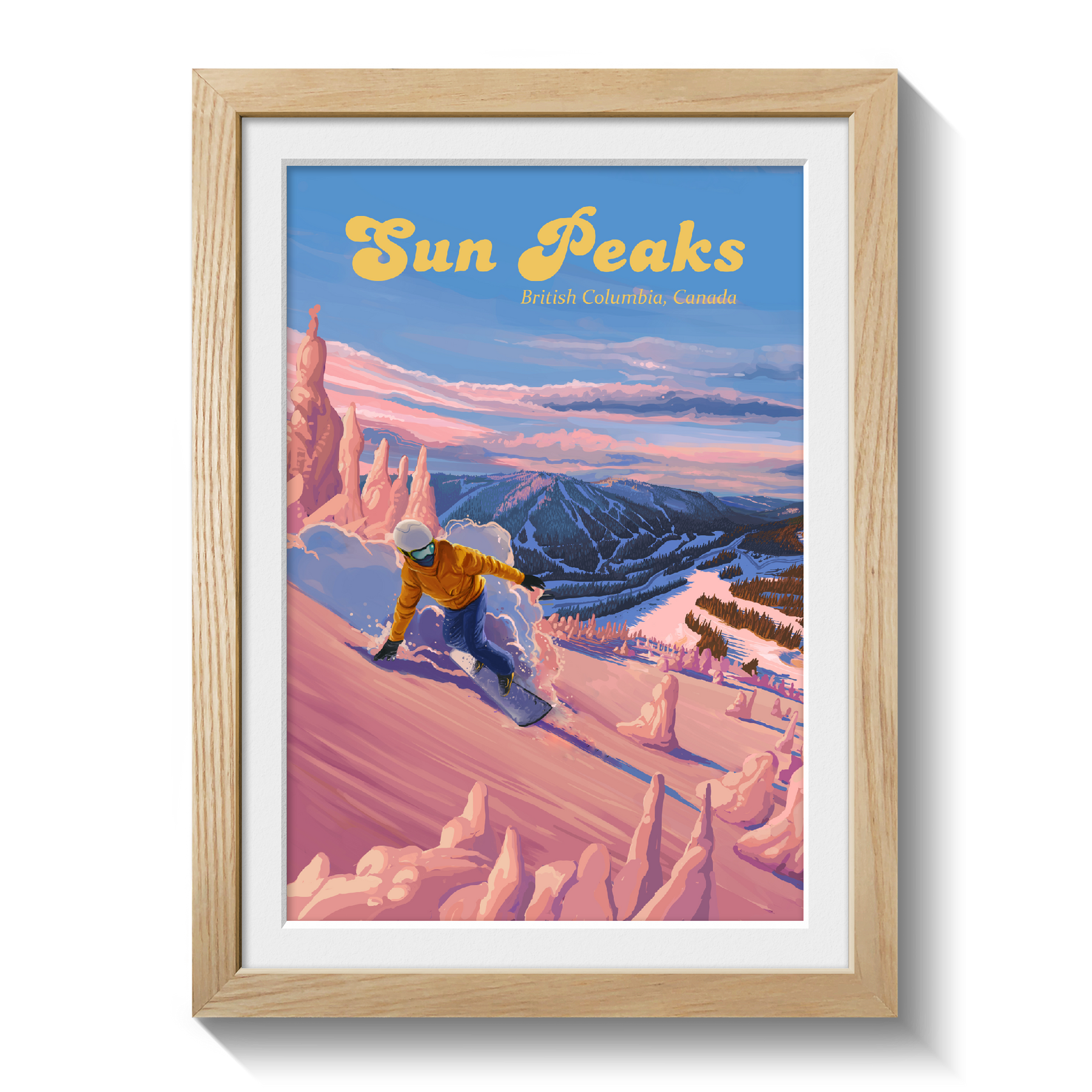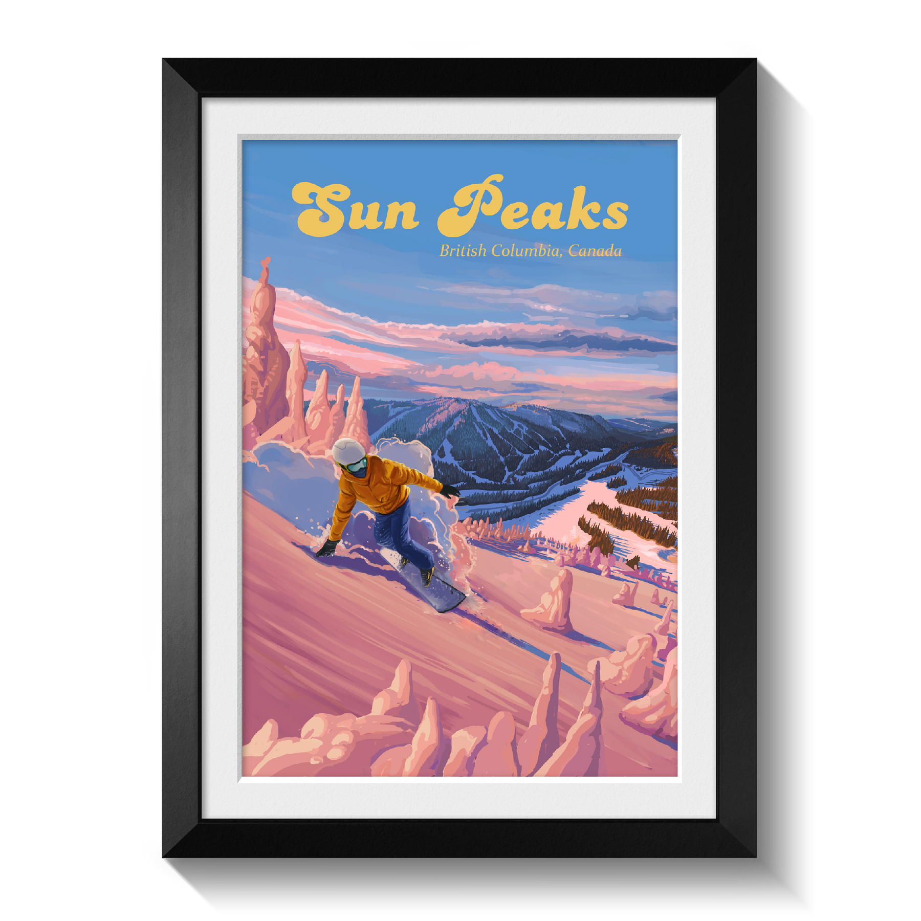 Sun Peaks Ski Resort, British Columbia, Canada ski resort travel poster, snowboarding version. .