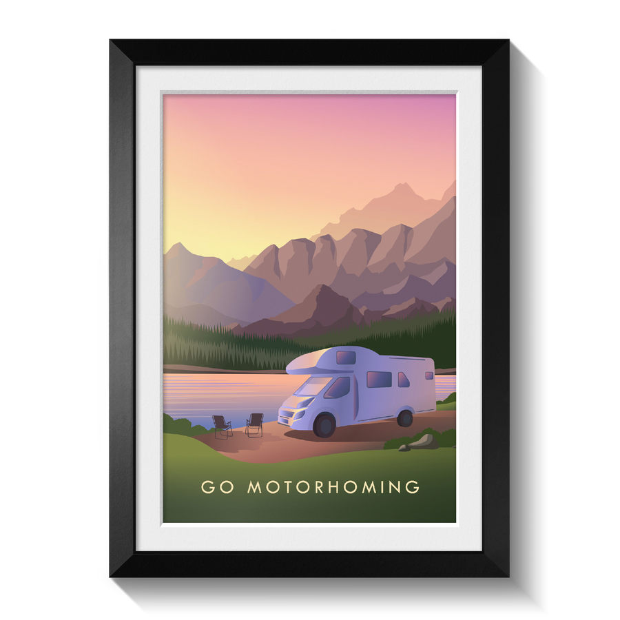 A framed travel poster depicting a kayaking scene with mountains in the background and the text 'GO KAYAKING' at the bottom.