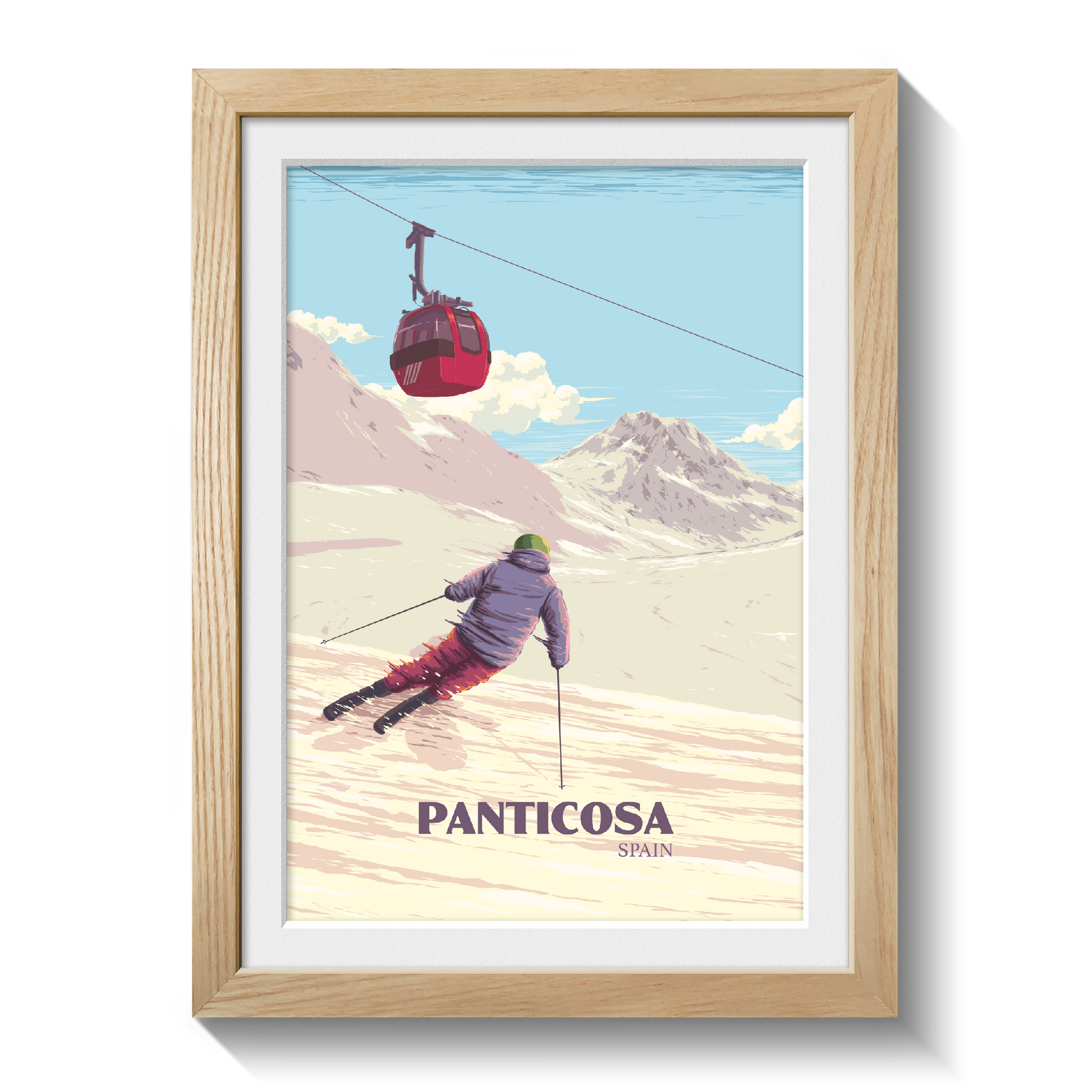 This is an original travel poster featuring the Spanish ski resort of Aramón Panticosa in the Pyrenees Mountains. Panticosa is one of the most popular resorts in the Pyrenees, its highest peak is called Sabocos peak and has an elevation of 2200m.