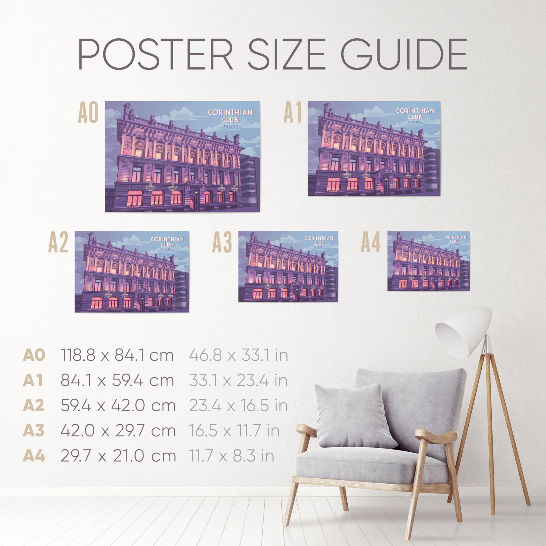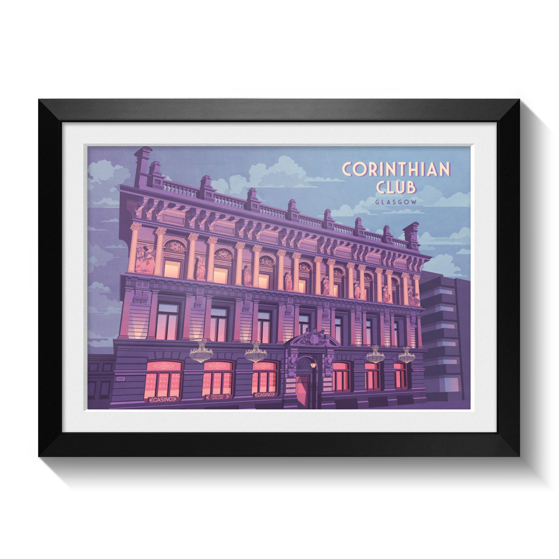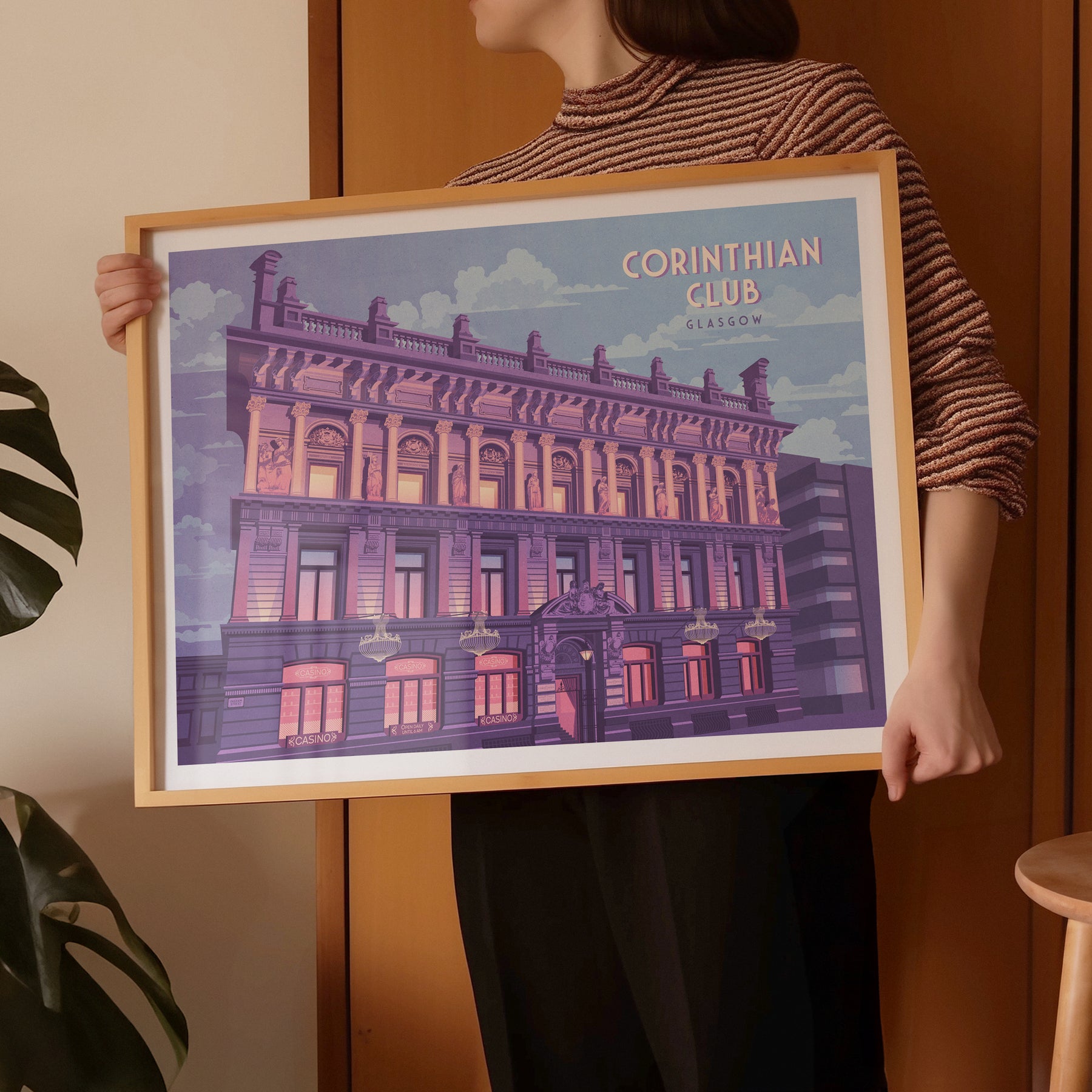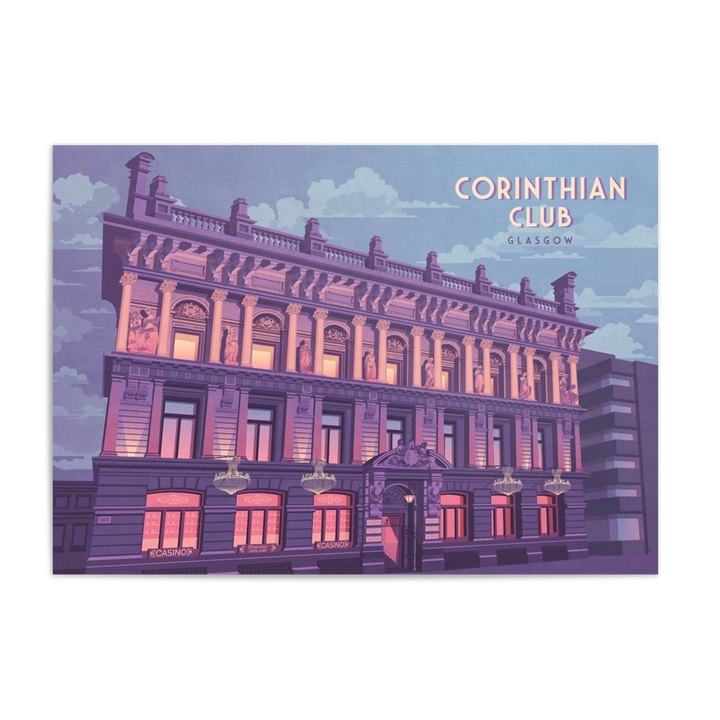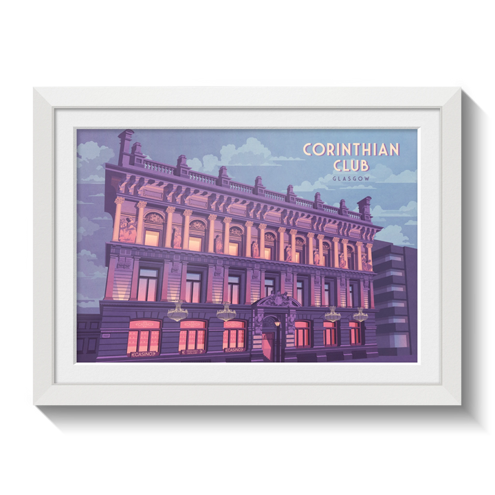 This Corinthian Club poster captures the elegance of one of Glasgow’s most iconic venues. Known for its stunning architecture, vibrant bar scene, and popular wedding events, it’s a standout in the city’s nightlife and social scene. A stylish decor piece celebrating the grandeur and cultural charm of the Corinthian Club.