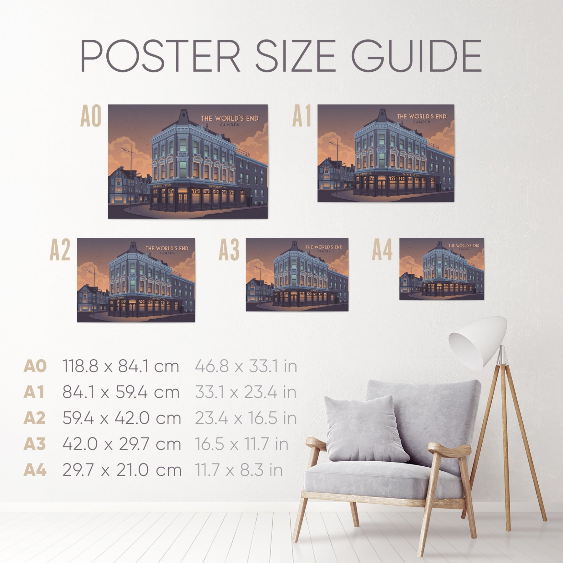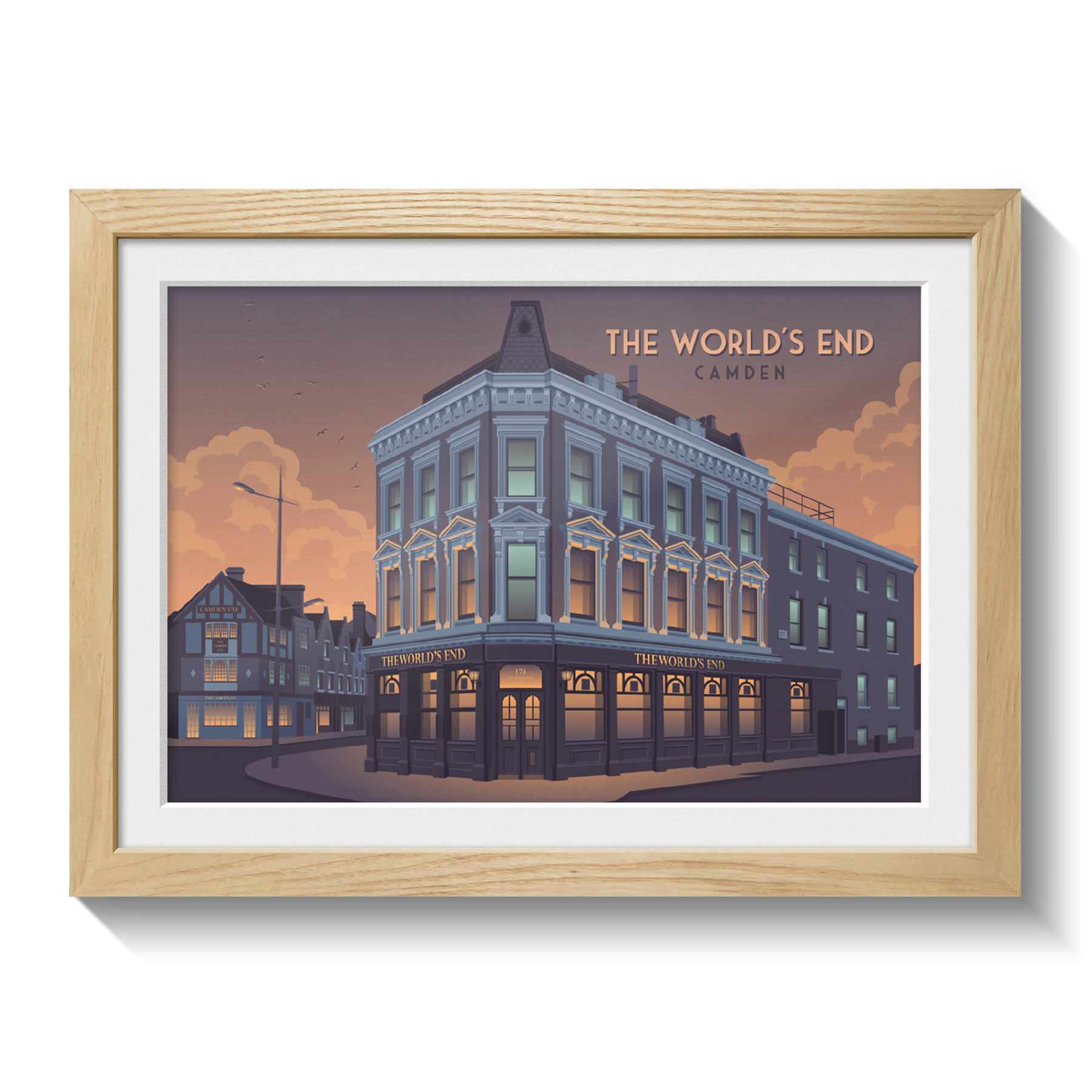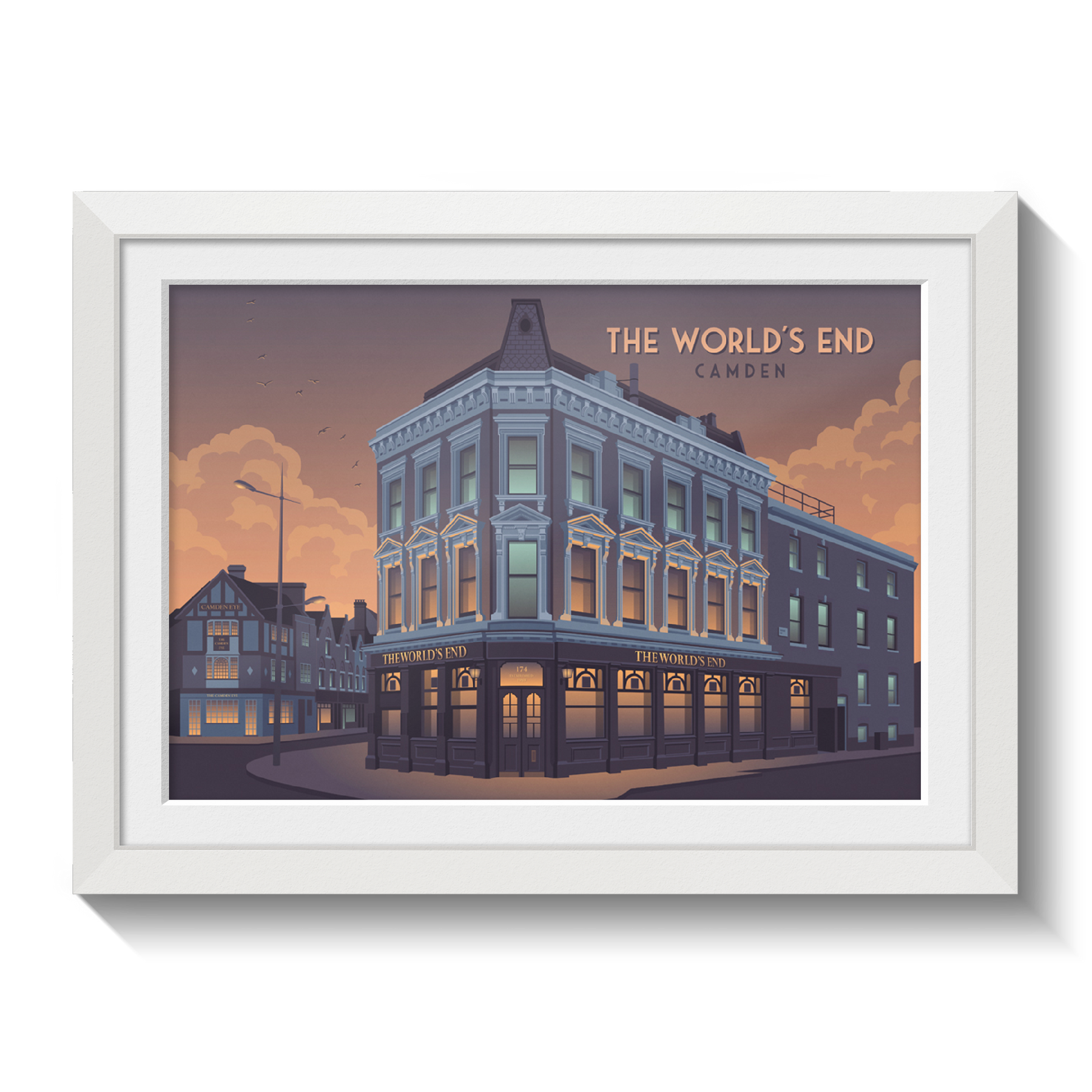 An original music venue poster featuring the iconic World's End pub in Camden Town, London. The World's End building on Camden High Street, dates back to 1875 but there are records of a pub on this site as far back as 1690.