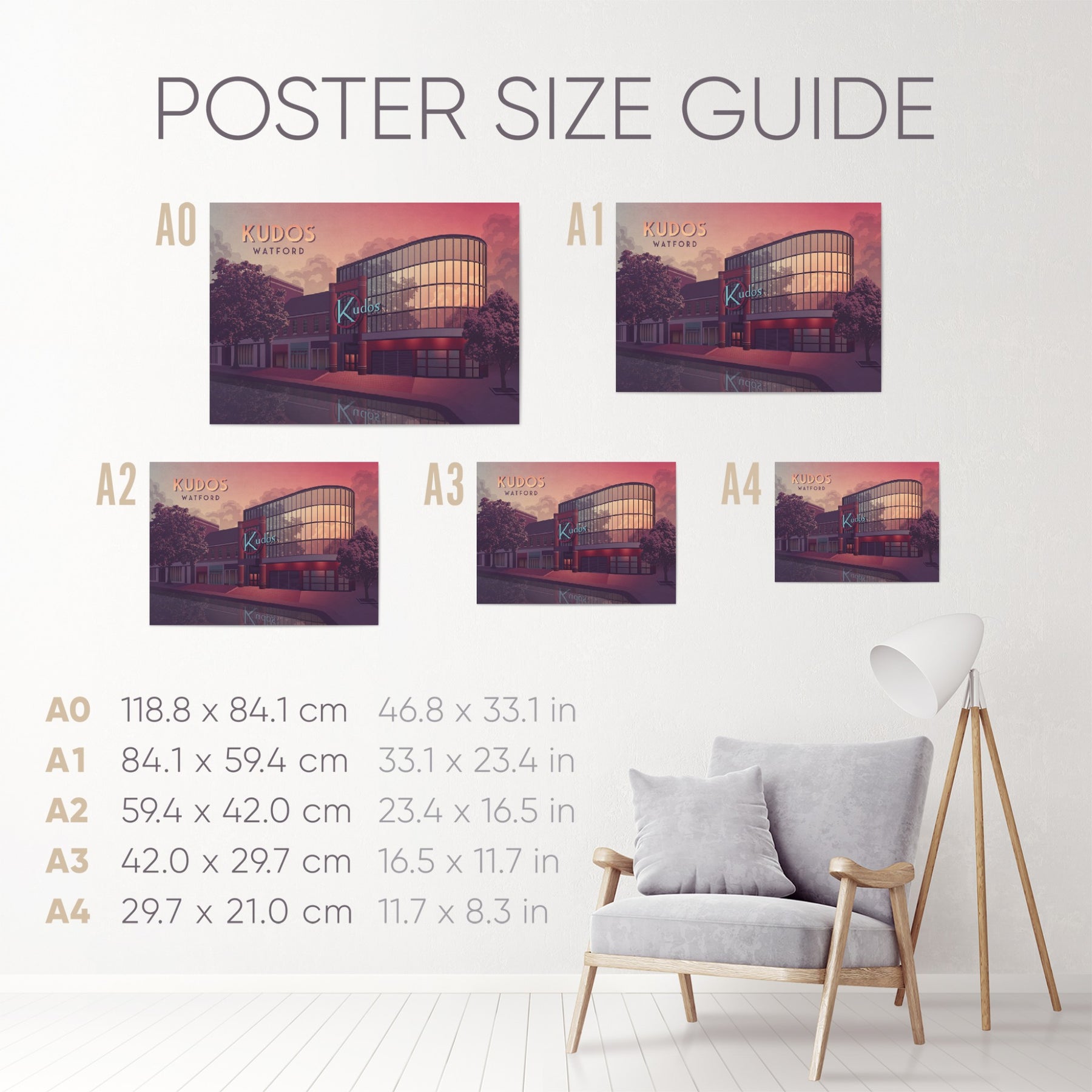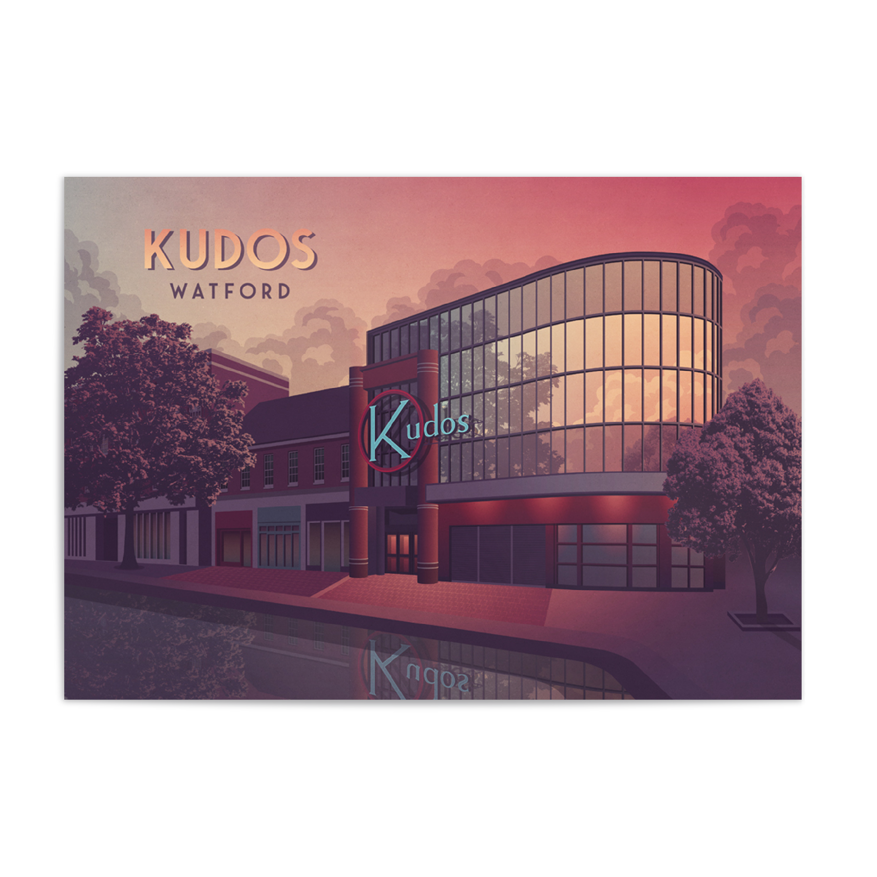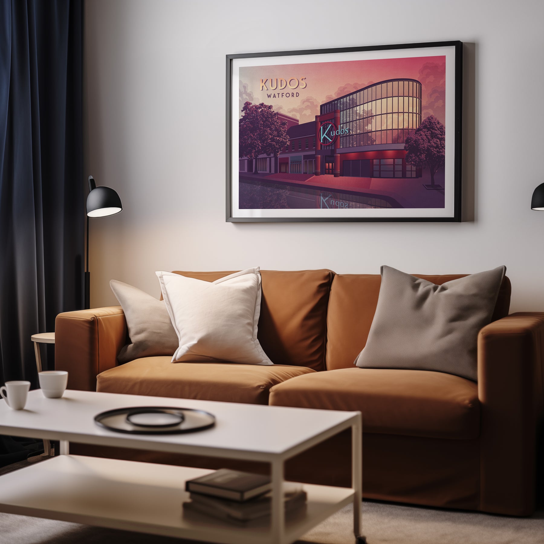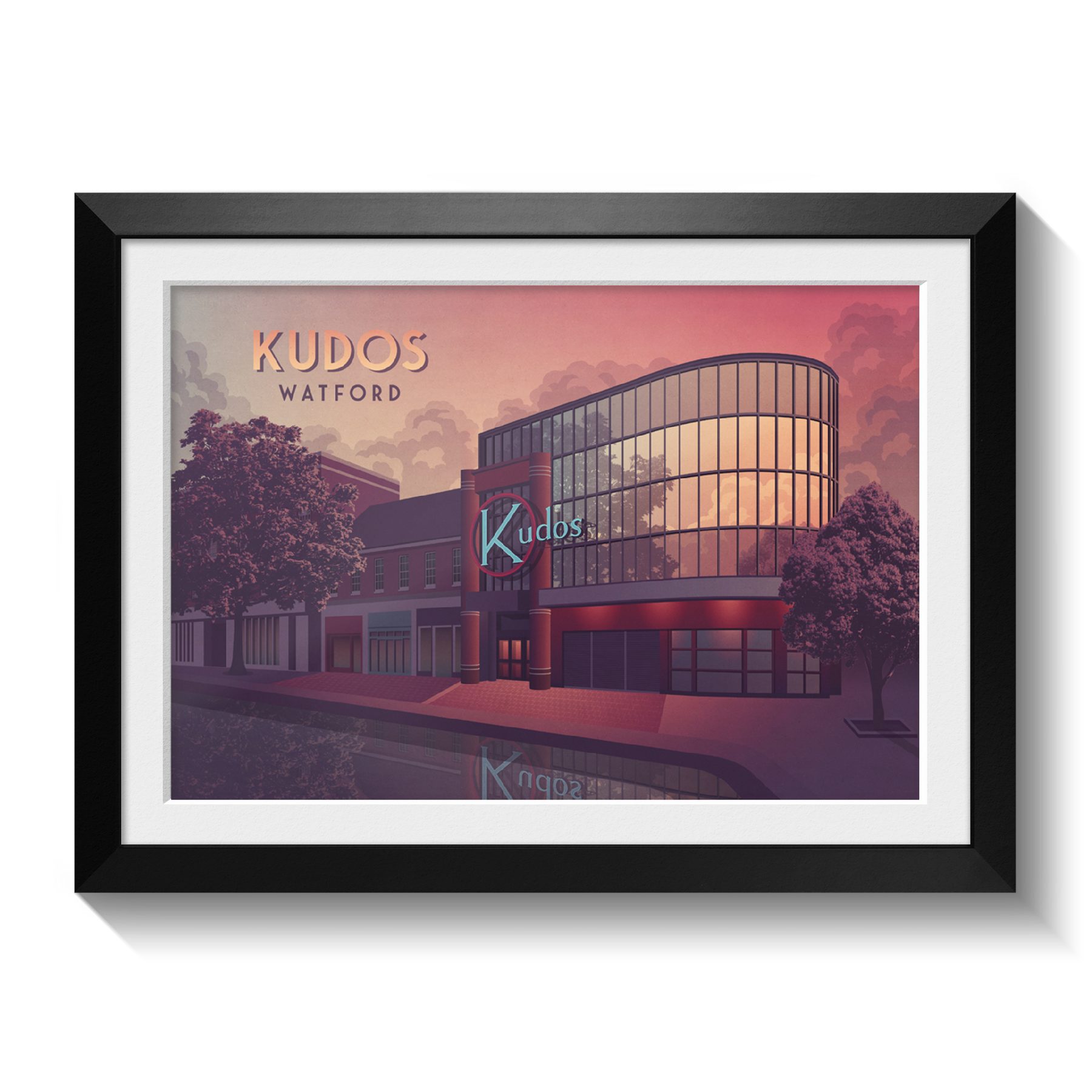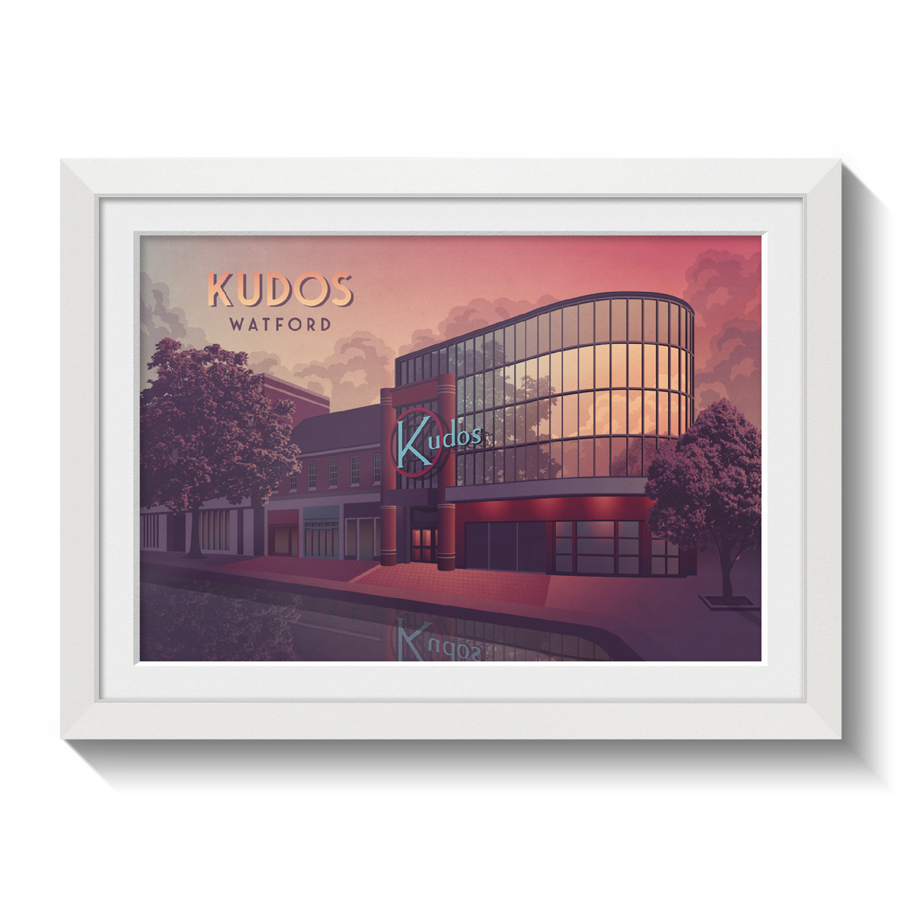 An original travel poster featuring the former Kudos nightclub in Watford. Kudos was a popular clubbing spot in Watford, which has been known over the years as Baileys, Paradise Lost, Oceana, Top Rank, Prism and of course Destiny.