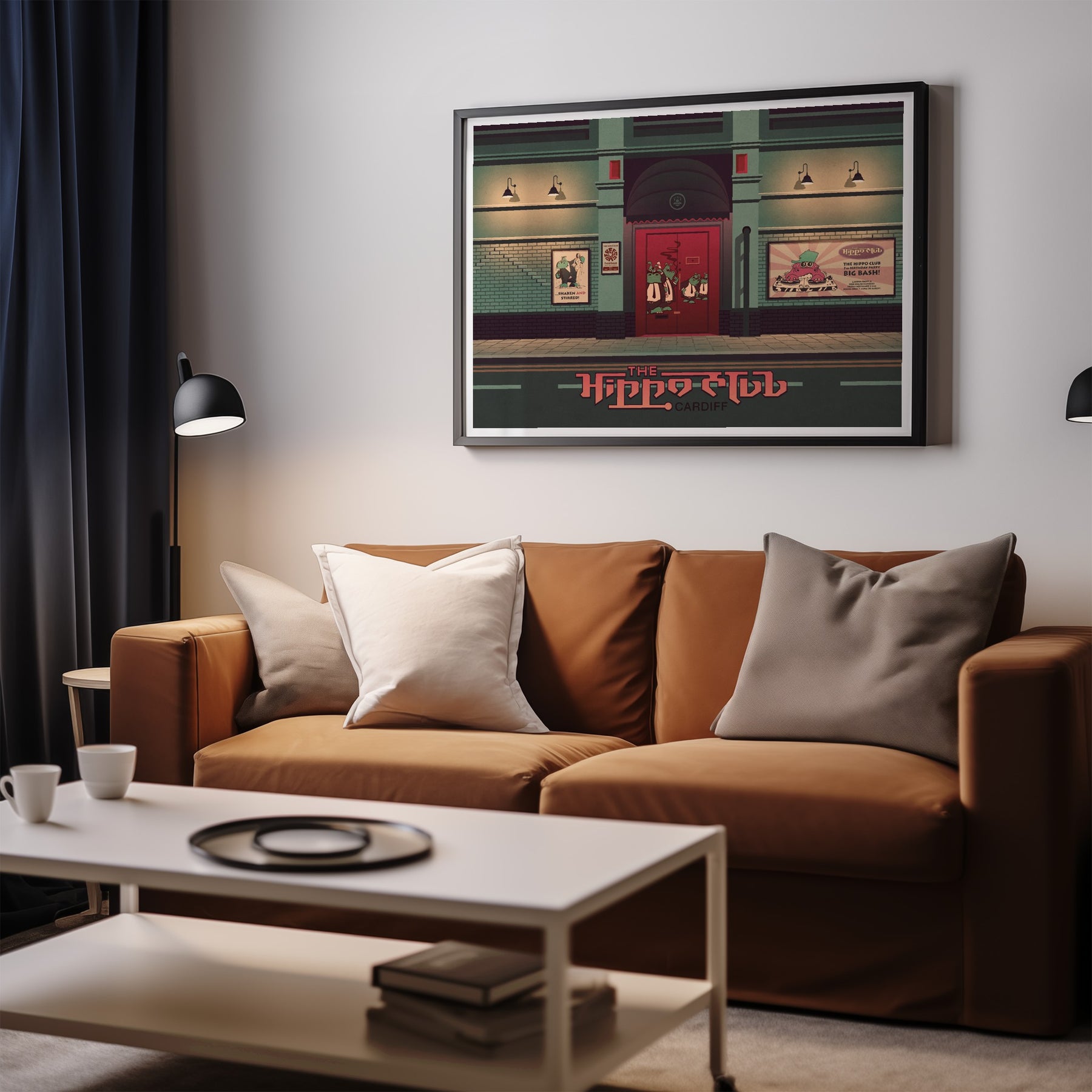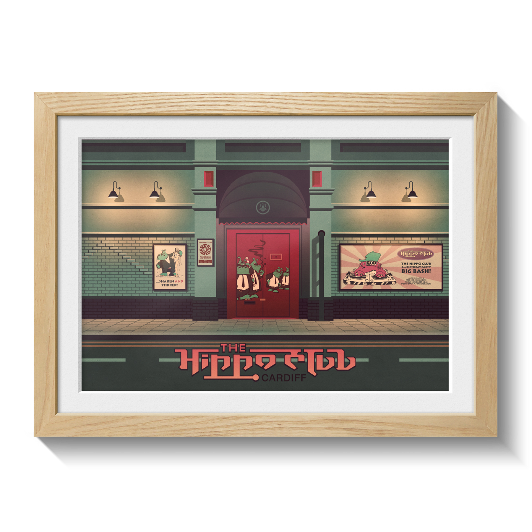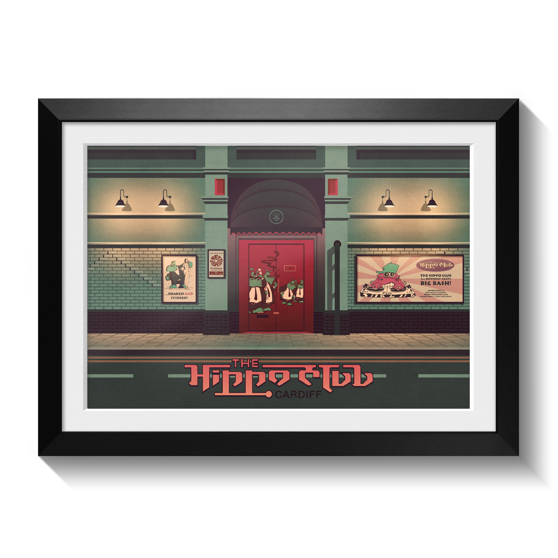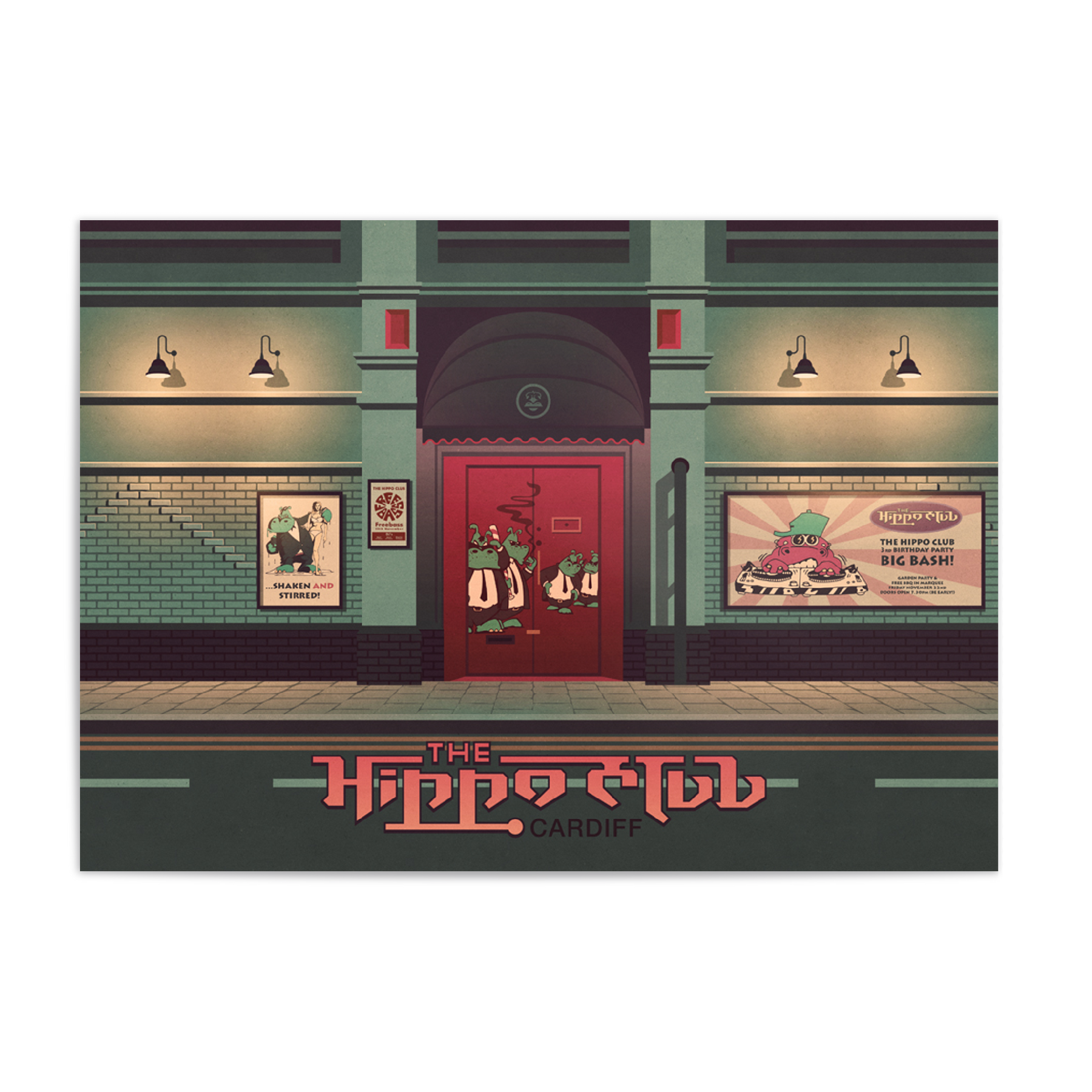 An original travel poster featuring nightclub, The Hippo Club, Cardiff. The Hippo was a dance music hot spot in the 90s and was one of Cardiff's favourite clubs. It sadly closed its doors for the last time in January 2000.