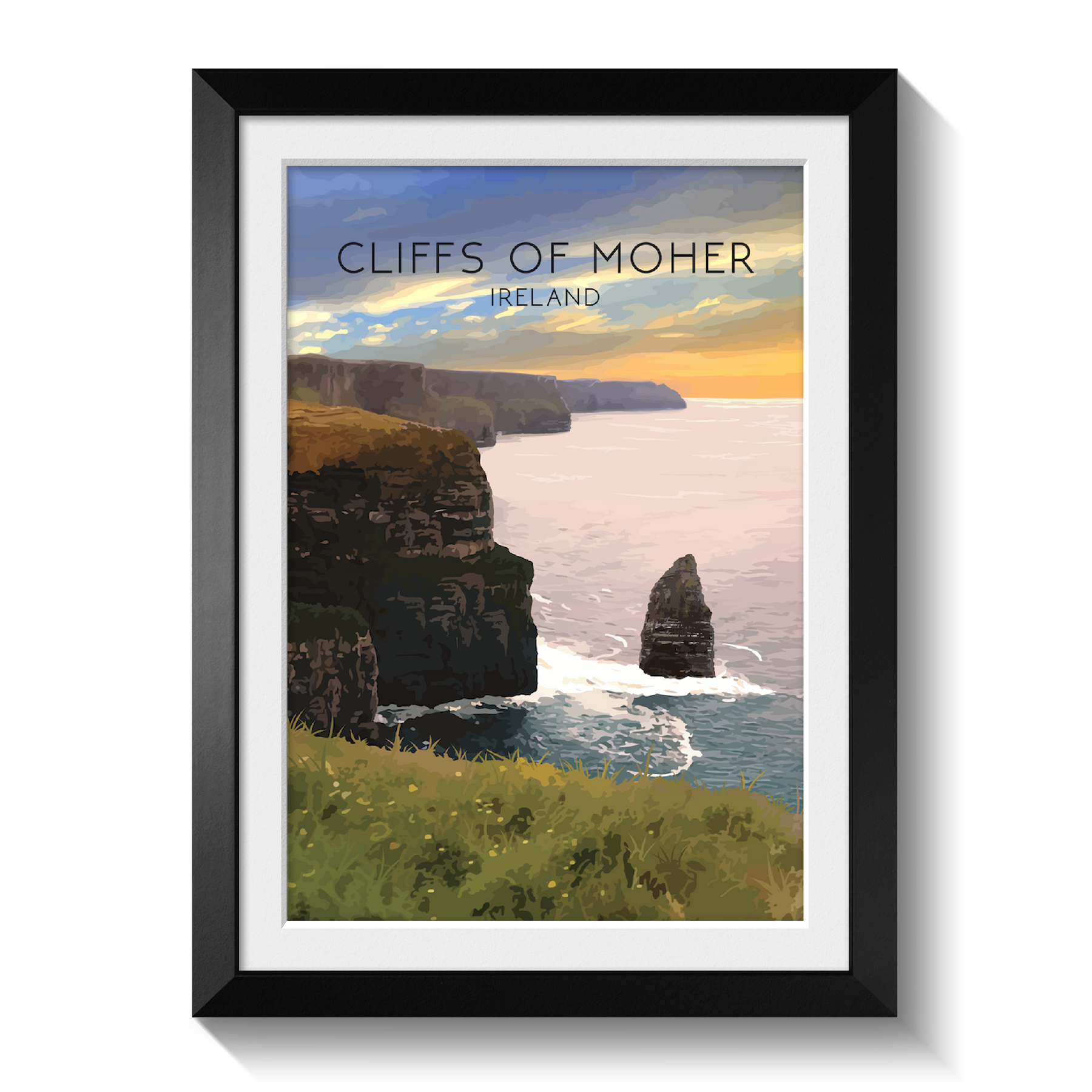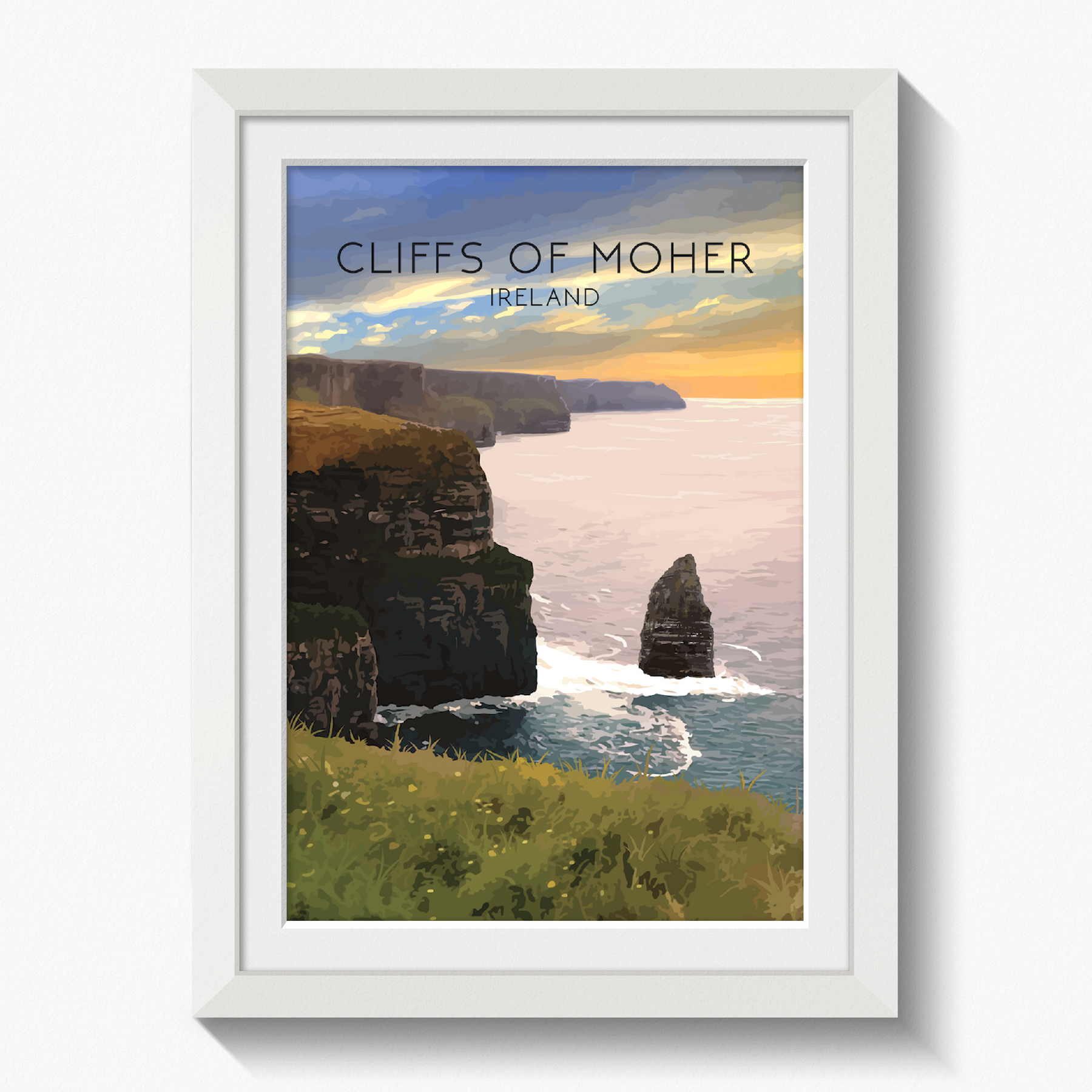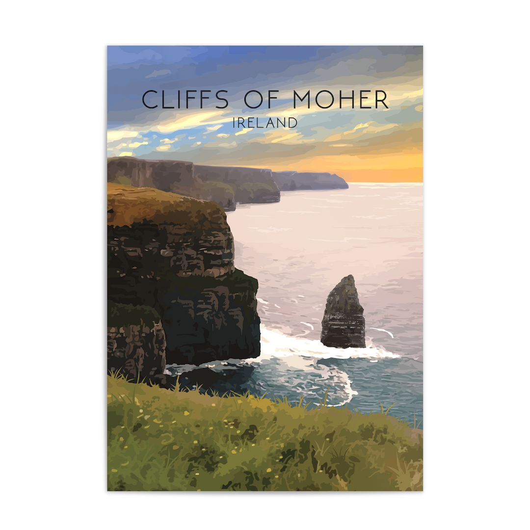 This is an original travel poster of Ireland's Cliffs of Moher in the Burren region of County Clare.
